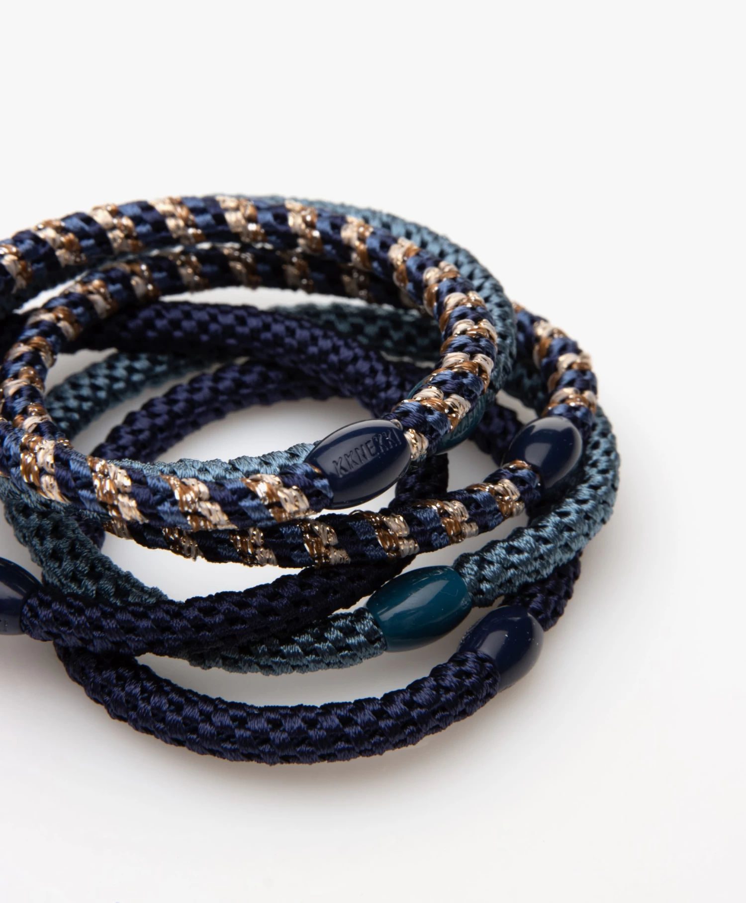 Niet alleen praktisch, maar ook stijlvol – Kknekki’s by Bon Dep zijn kleurrijke haarelastiekjes die je net zo goed als armbandje draagt. De smalle elastiekjes in dit setje van zes – met blauw, petrol en beige als hoofdkleuren en lurex details – zijn ultra-zacht voor elk type haar en geweven van meer dan 60 draden met een unieke techniek om elasticiteit te behouden.