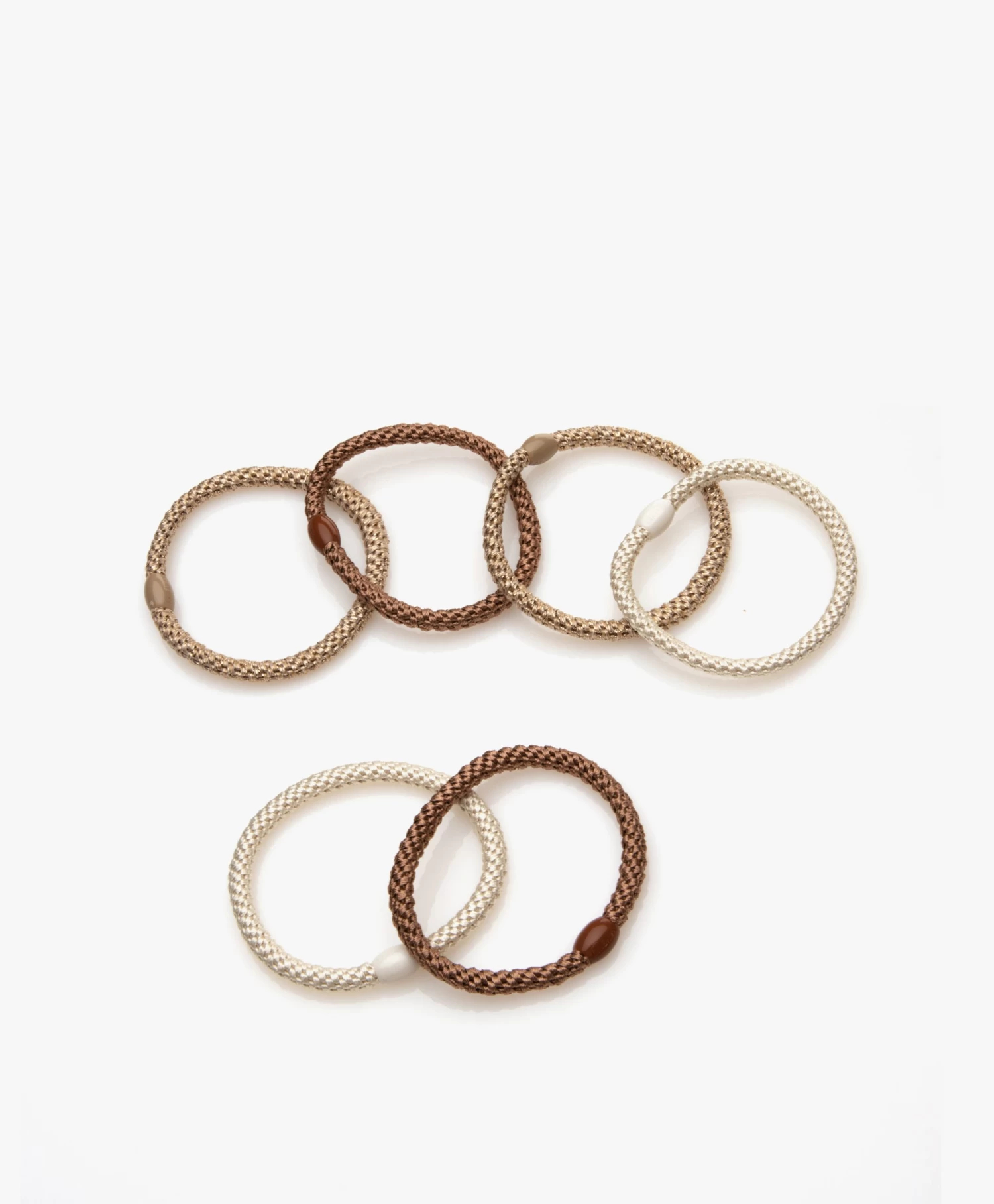 Niet alleen praktisch, maar ook stijlvol – Kknekki’s by Bon Dep zijn kleurrijke haarelastiekjes die je net zo goed als armbandje draagt. De smalle elastiekjes in dit setje van zes – met nude, bruin en off-white als hoofdkleuren en lurex details – zijn ultra-zacht voor elk type haar en geweven van meer dan 60 draden met een unieke techniek om elasticiteit te behouden.