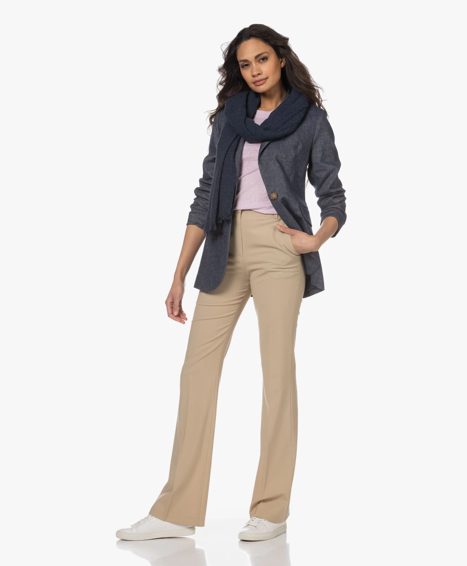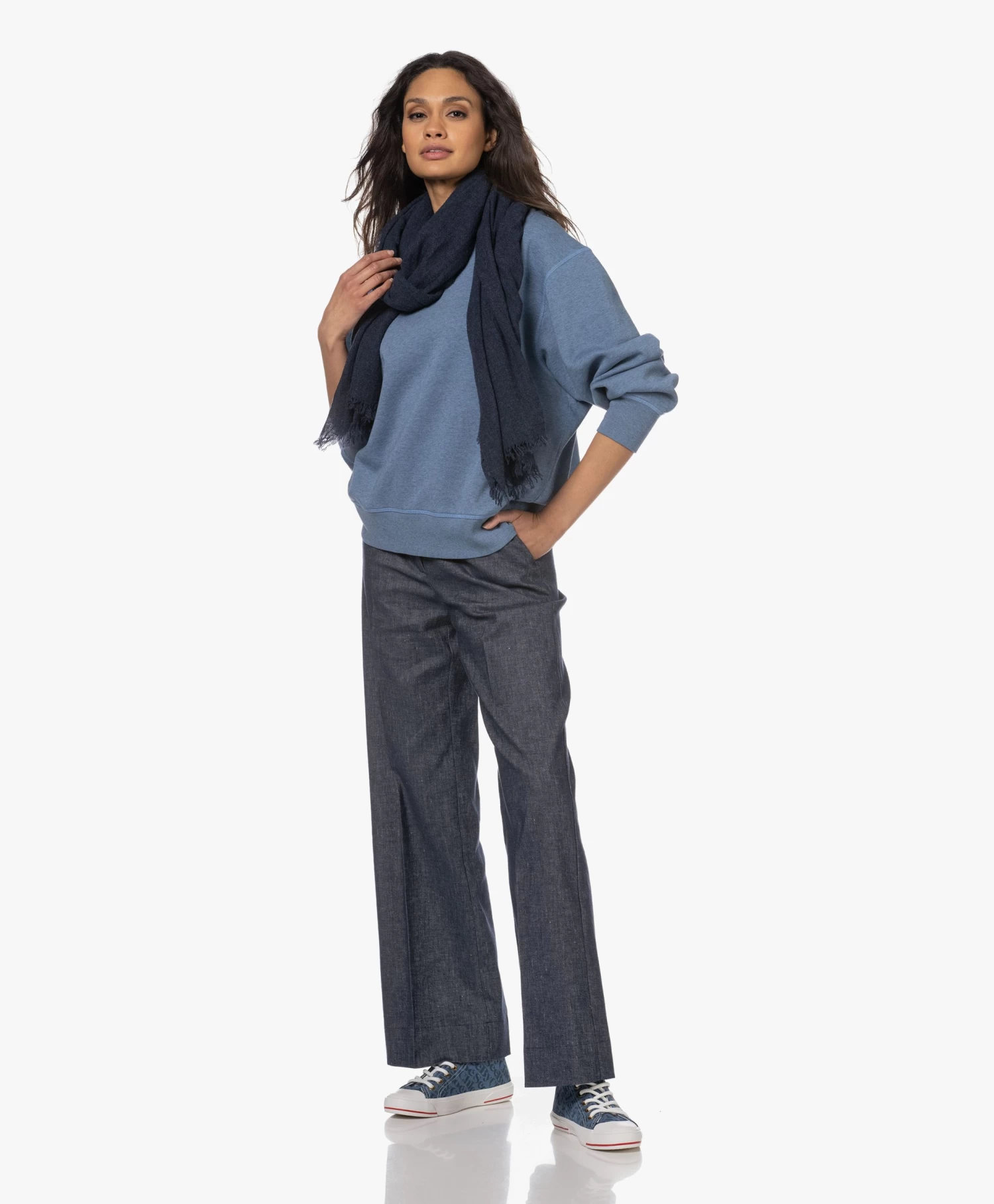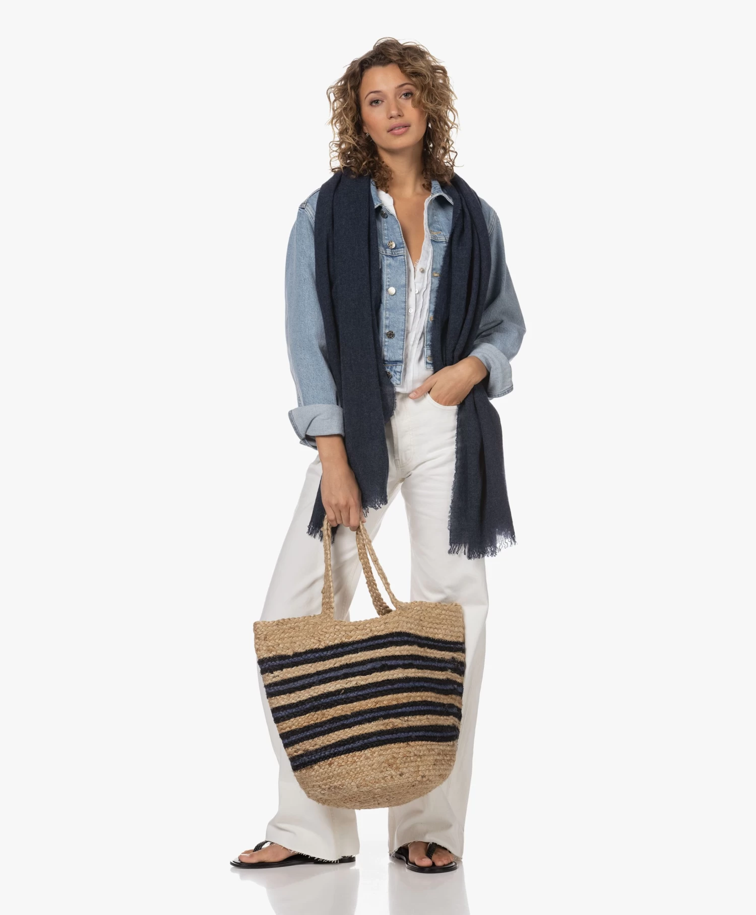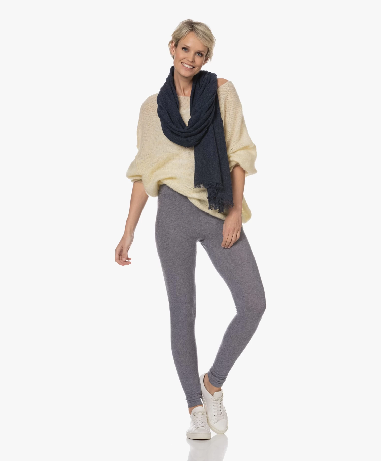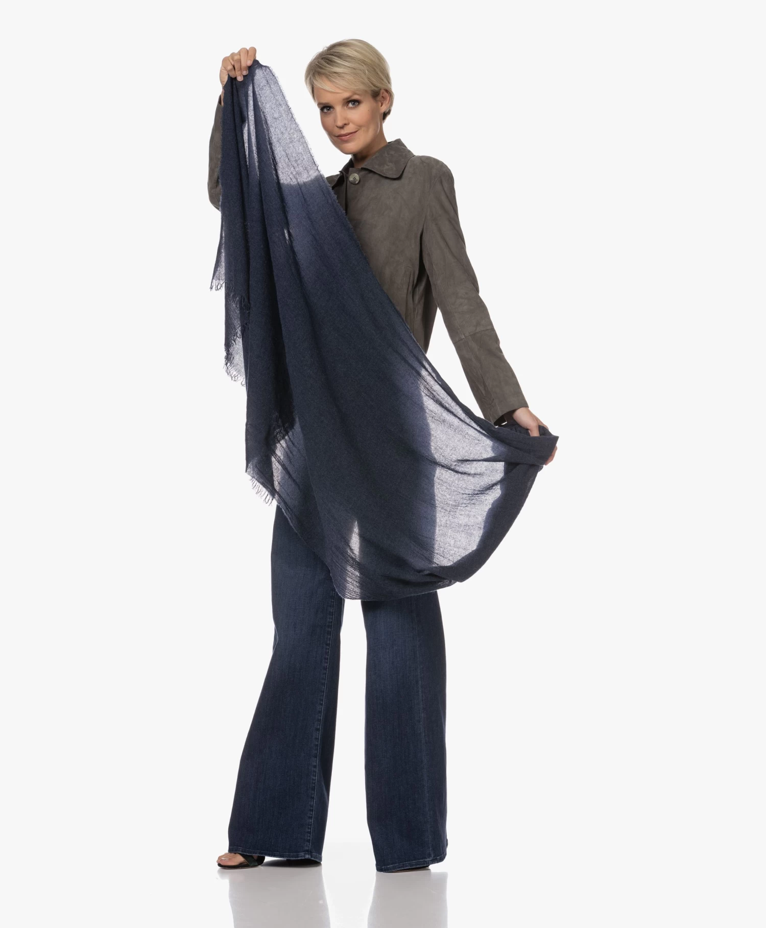 Losjes geweven cashmere, net niet helemaal door-en-door ingeverfd waardoor de donkerblauwe kleur iets zachter overkomt. Knap, hoe LaSalle een superdeluxe cashmere Pasmina sjaal met bestudeerde nonchalance nog rijker maakt.