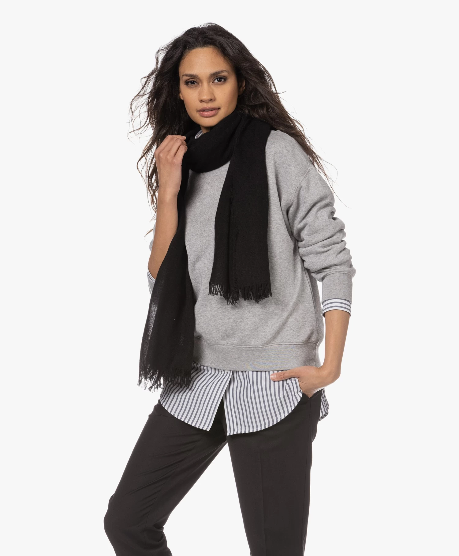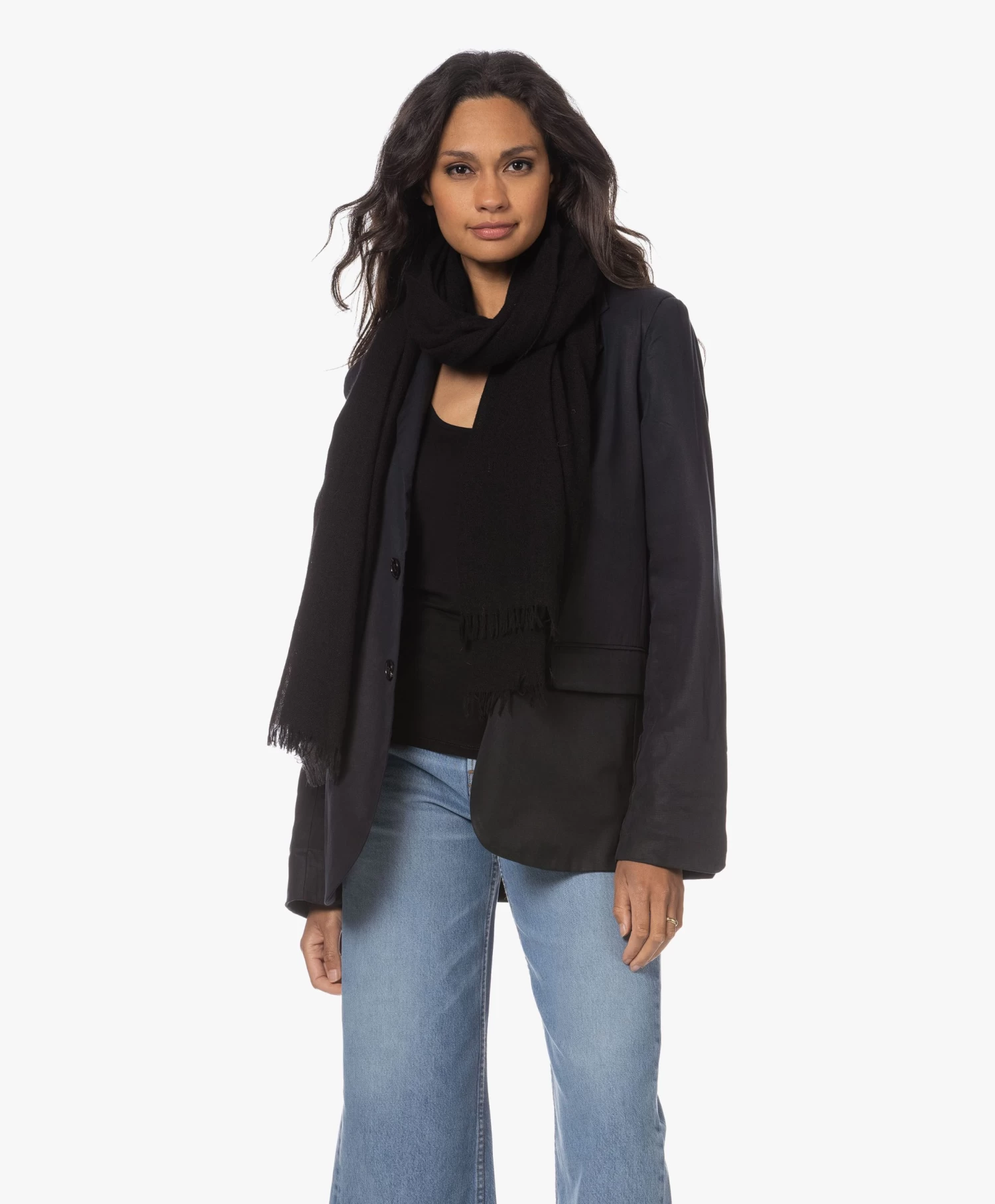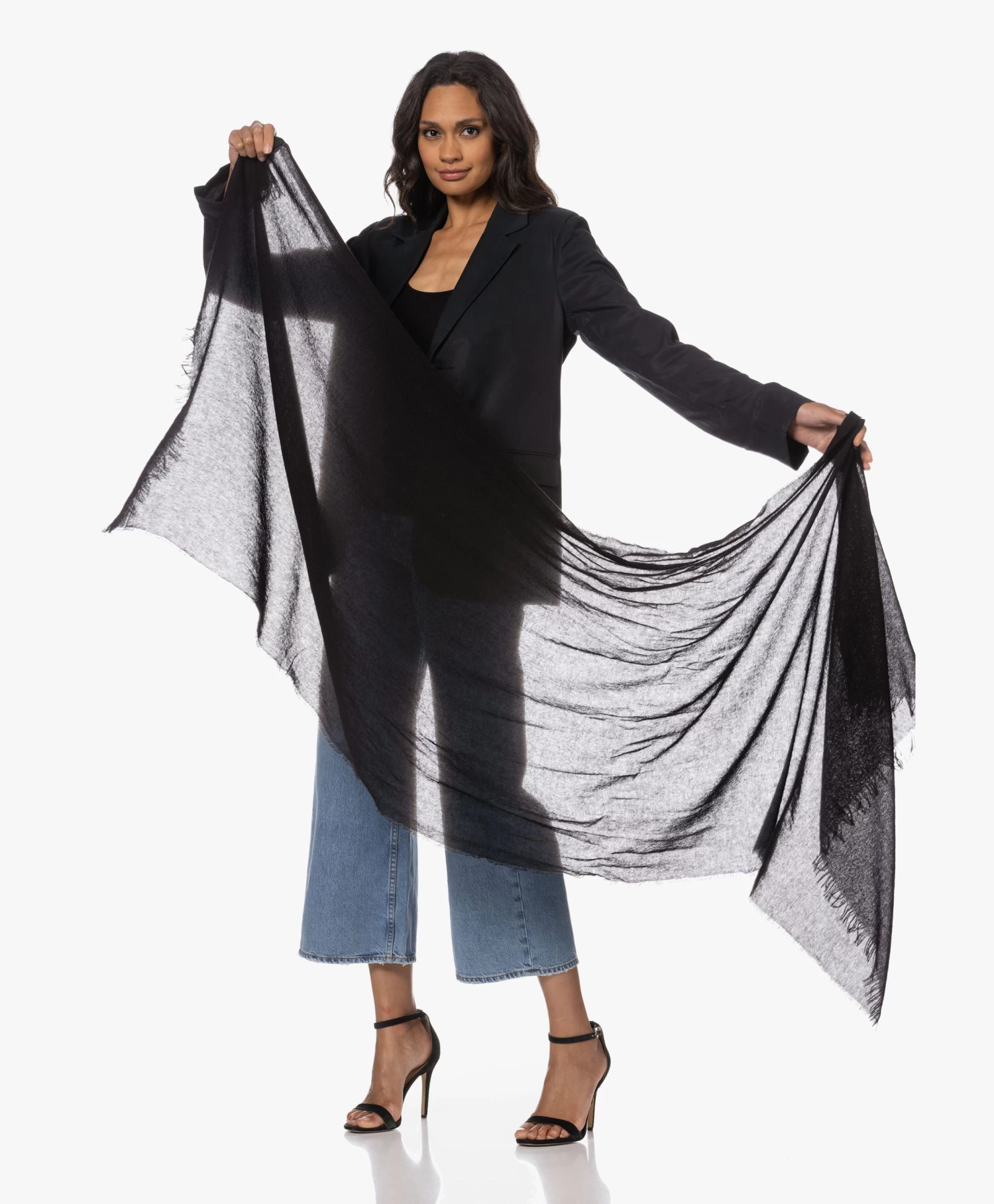 Losjes geweven cashmere, net niet helemaal door-en-door ingeverfd waardoor de zwarte kleur iets zachter overkomt. Knap, hoe LaSalle een superdeluxe cashmere Pasmina sjaal met bestudeerde nonchalance nog rijker maakt.