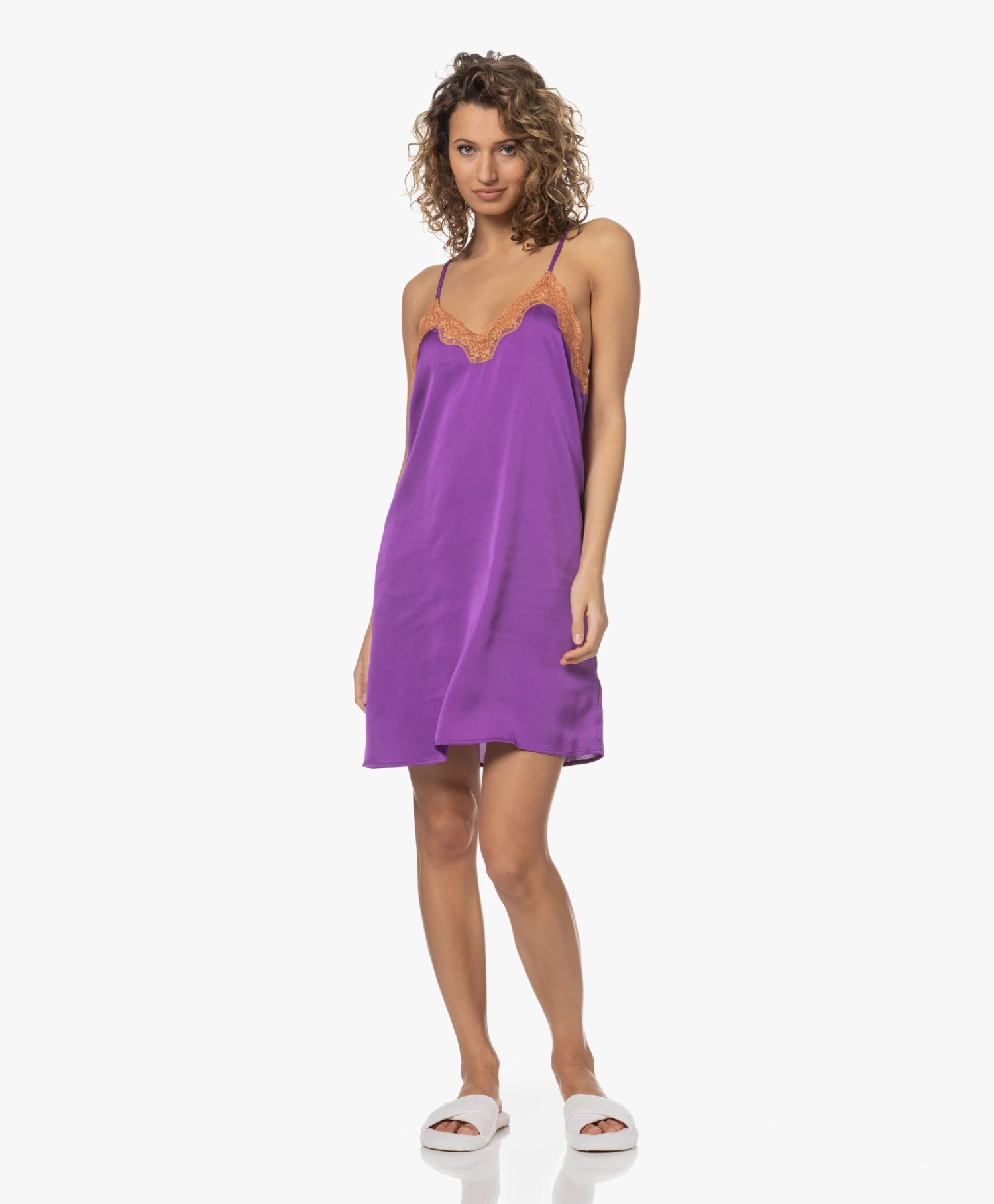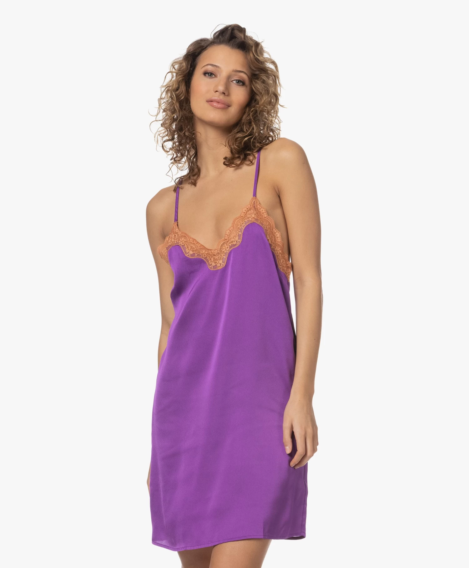 Maak je eigen Love Stories met slipdress Willow. Met de klassieke slipdress met kantafwerking als uitgangspunt, geeft het merk er met een paars kleur een vernieuwende draai aan. De crêpe-satijnen kwaliteit draagt glad op de huid en houdt het midden tussen mat en glanzend. Afgewerkt met geschulpt kant in oranje.