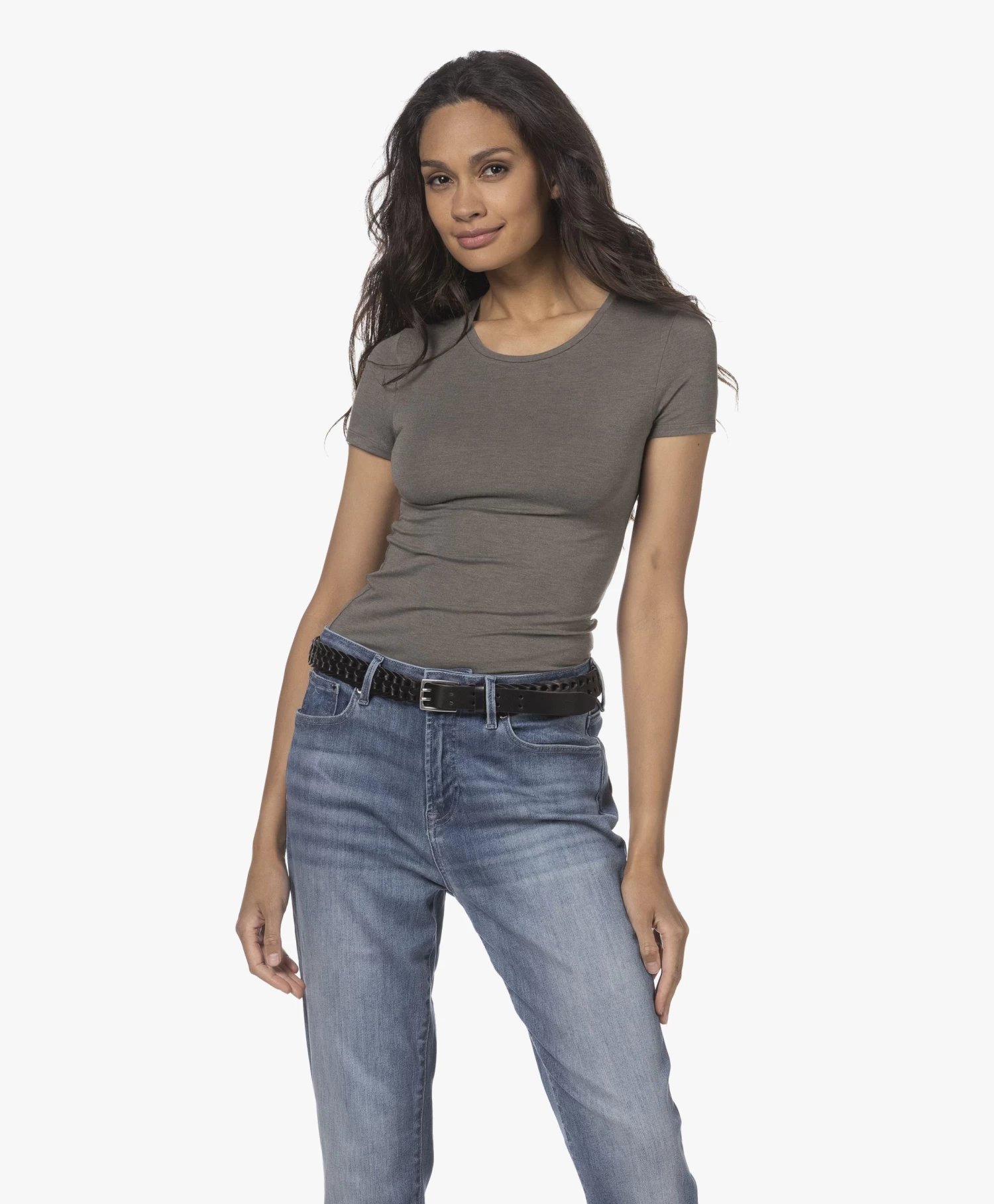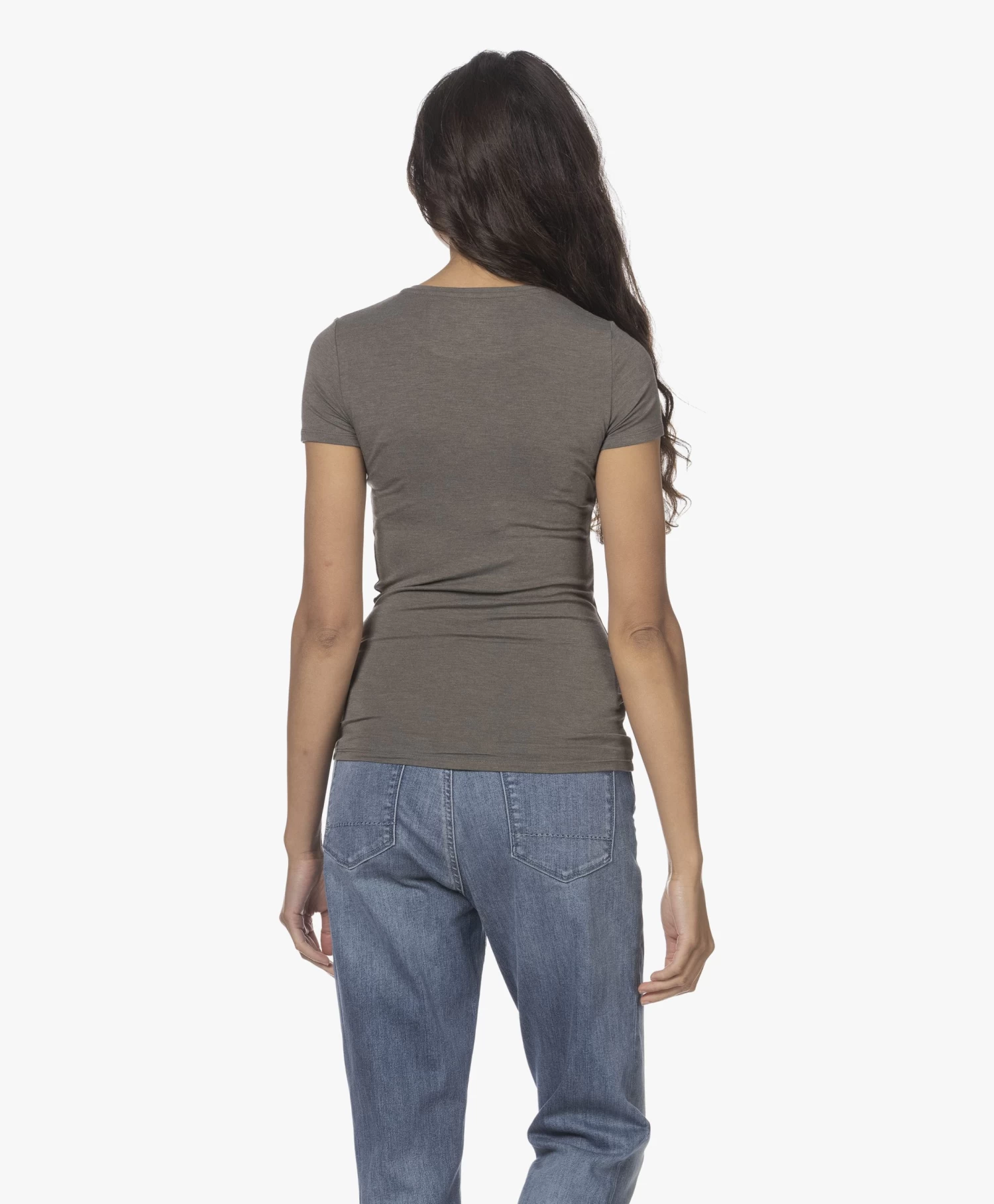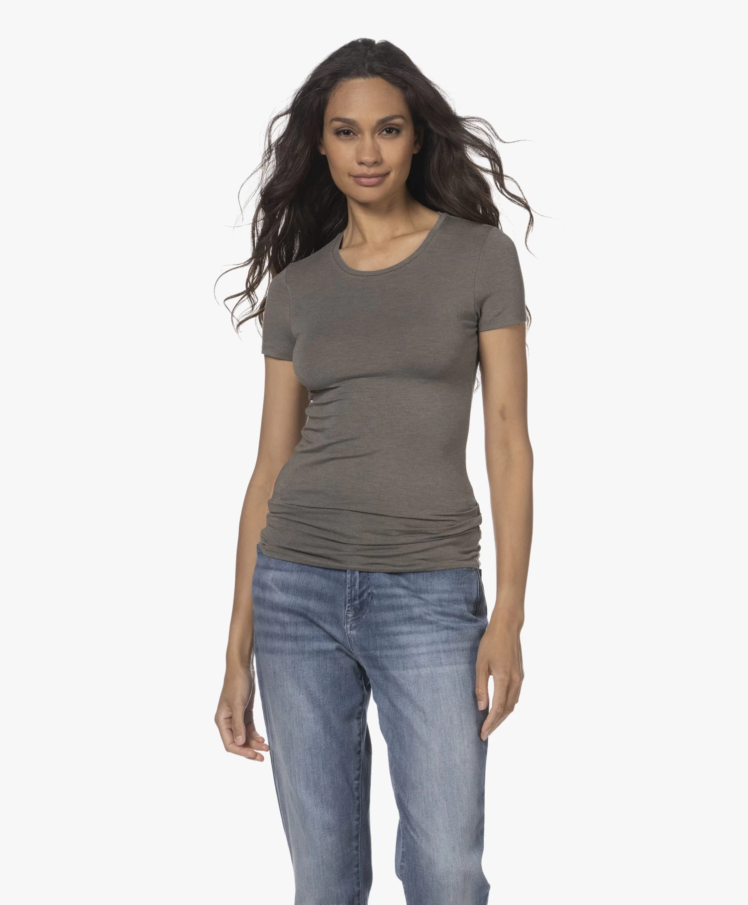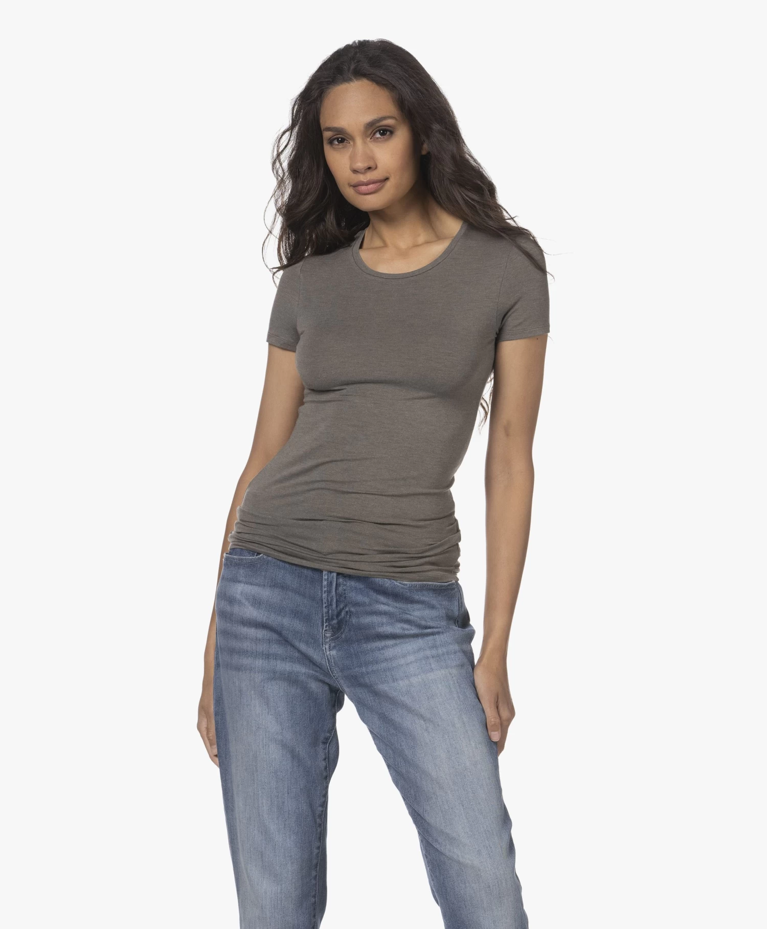 Hoe een slim-fit T-shirt toch groots kan zijn: het is Majestic Filatures’ superwashed ‘soft touch’ stretchviscose single-jersey die het ‘m doet. Dit basic T-shirt met ronde hals en korte mouwen roept een instant gevoel van comfort en luxe op. Uitgevoerd in tijdloos grijsgroen voor optimaal combinatiegemak.