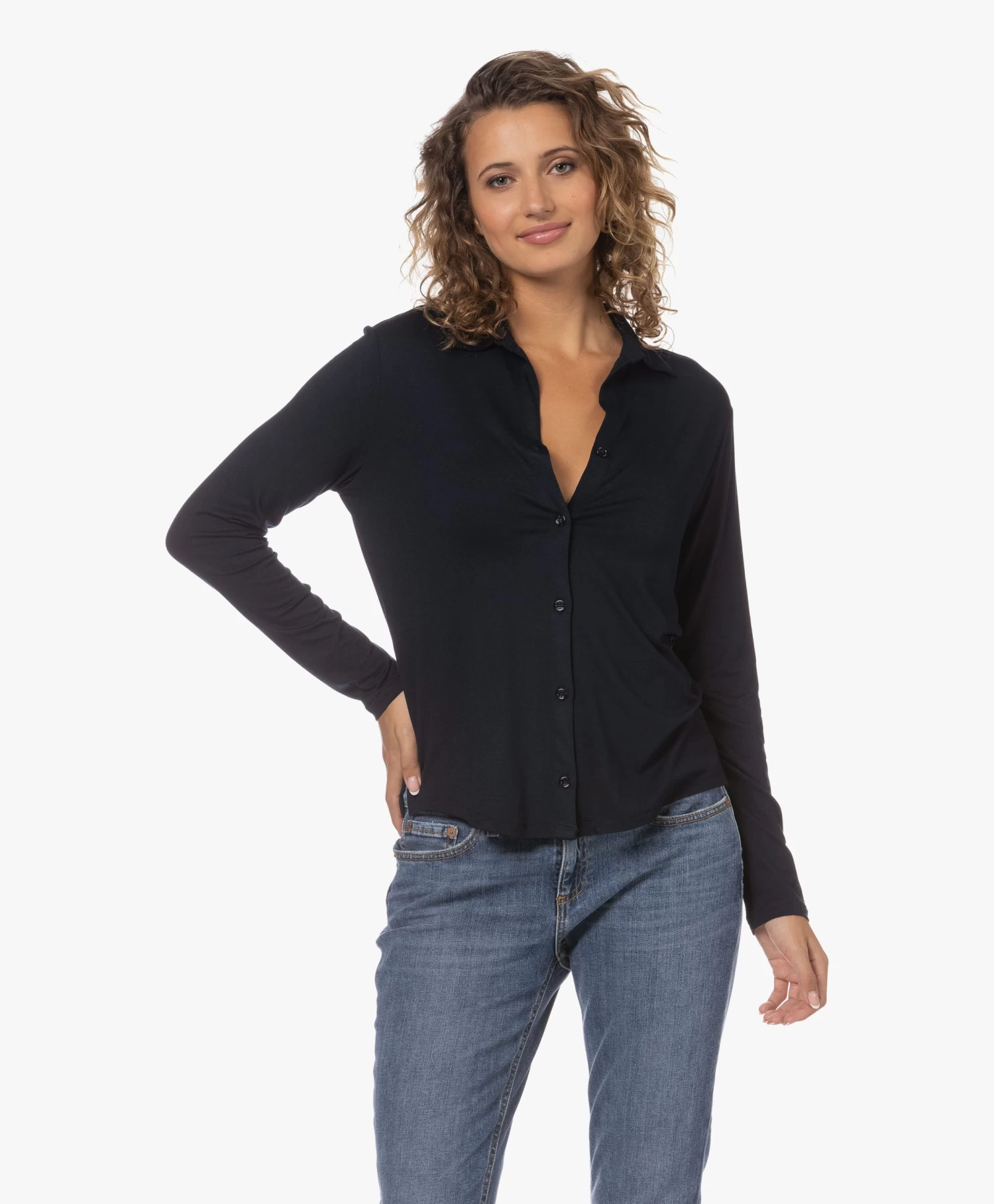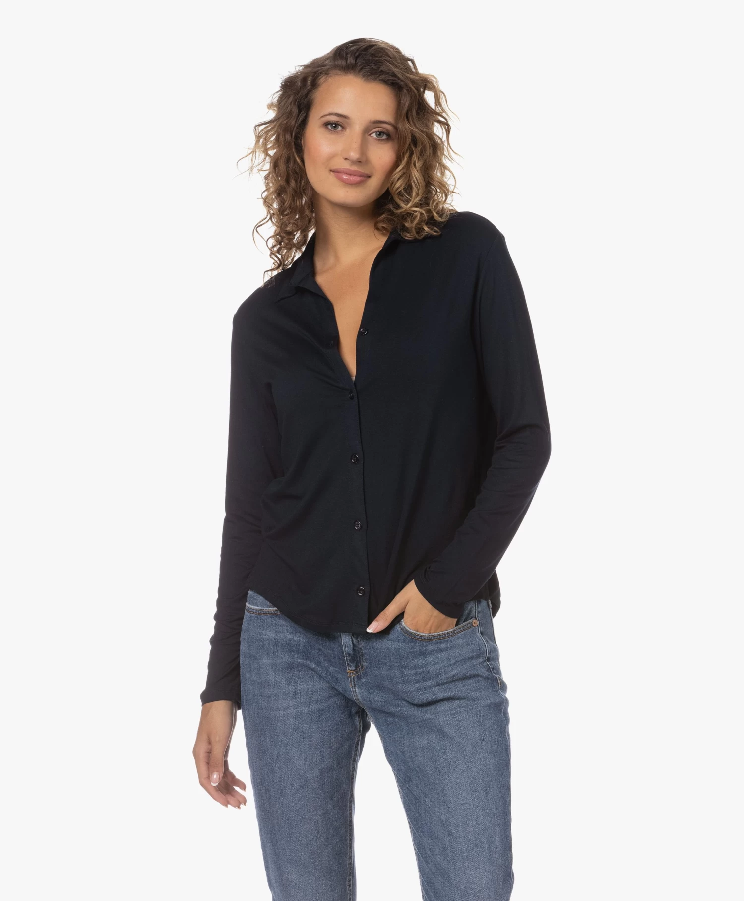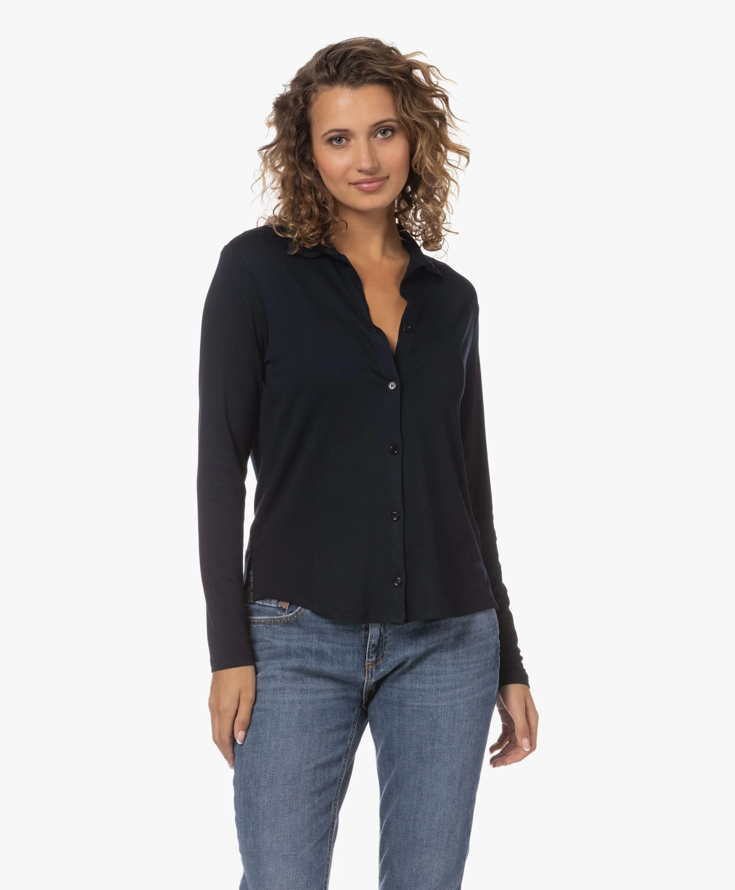Met een blouse van stretch-jersey voorzie je je gelaagde outfit van extra comfort. Dit fraaie item van Majestic Filatures is uitgevoerd in een diep donkerblauw, voorzien van een overhemdkraag, een V-vormige halsuitsnijding en lange slanke mouwen. De rond gevormde zoom en de zijsplitjes geeft dit semi slim-fit item een vrouwelijke uitstraling.
