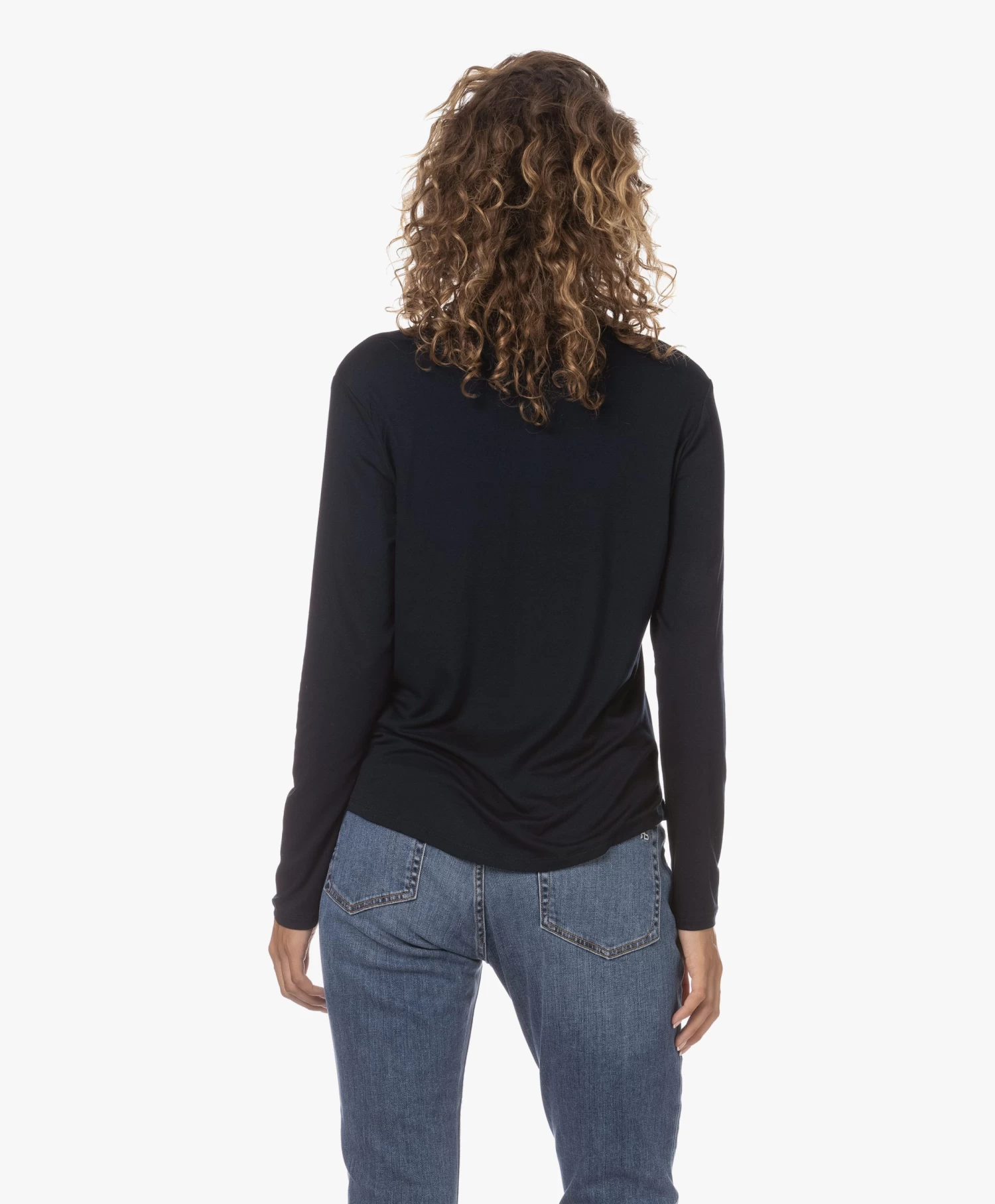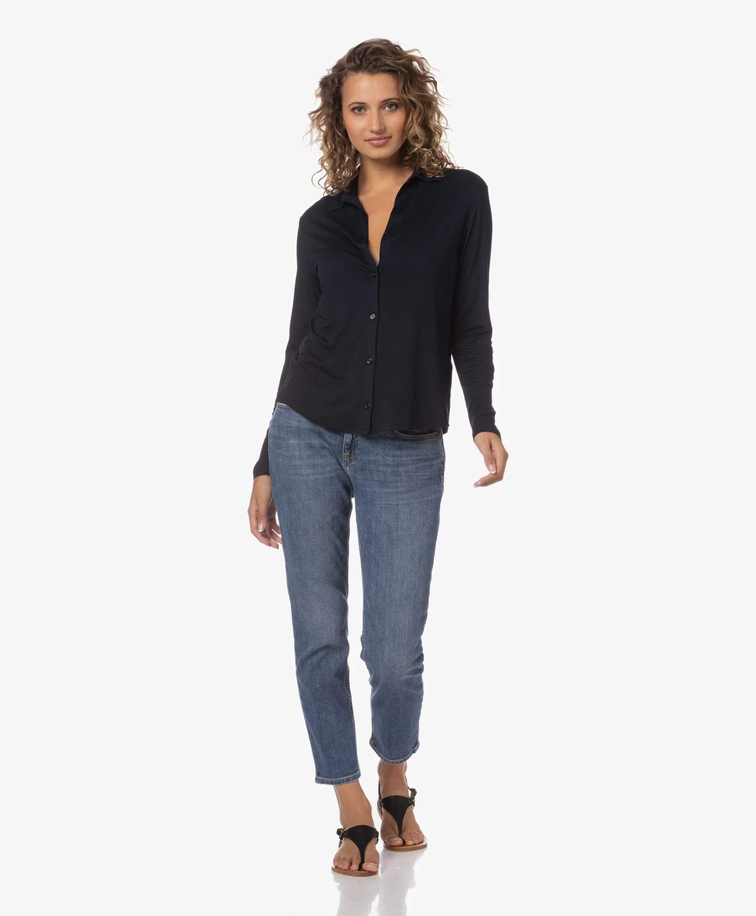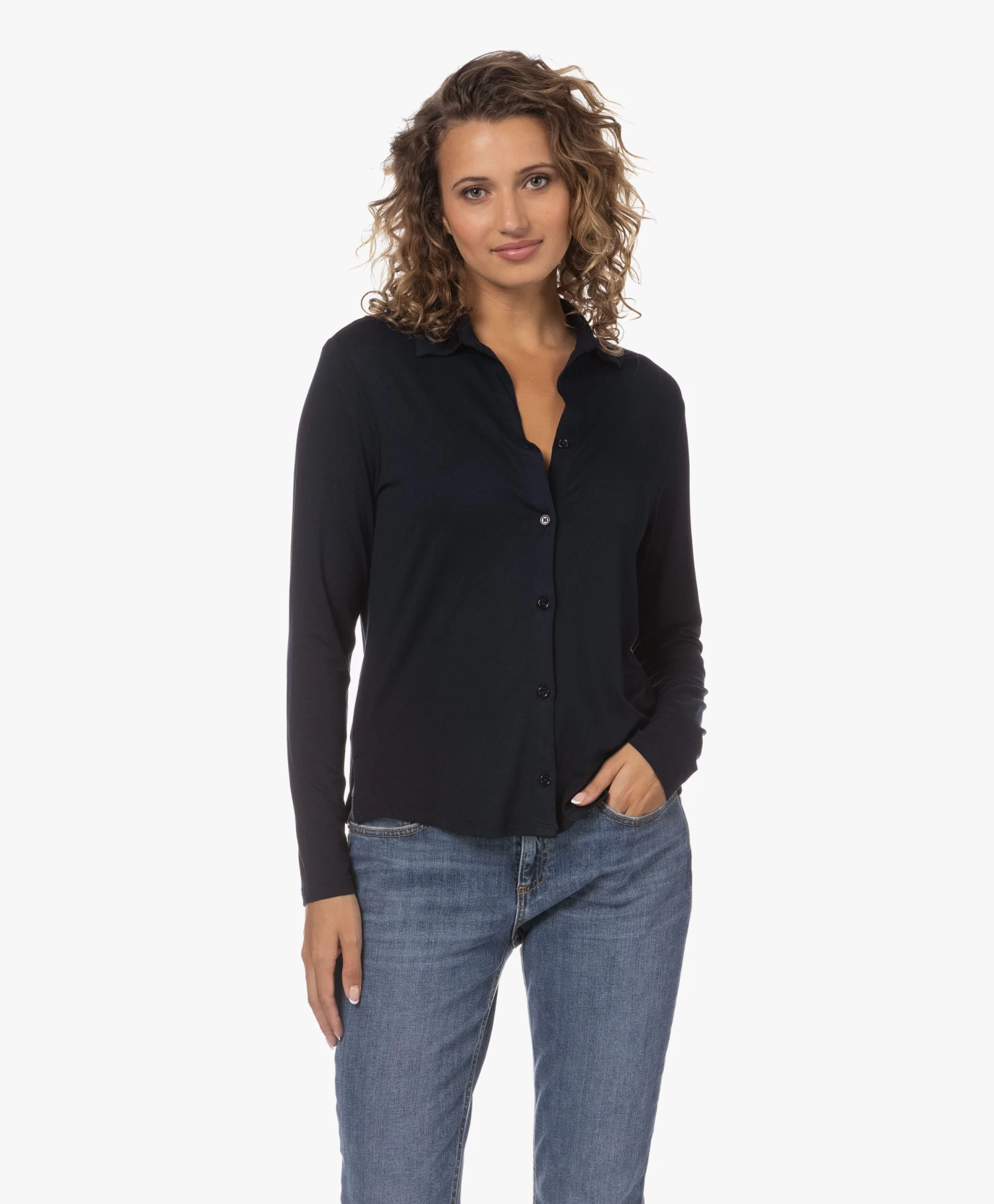 Met een blouse van stretch-jersey voorzie je je gelaagde outfit van extra comfort. Dit fraaie item van Majestic Filatures is uitgevoerd in een diep donkerblauw, voorzien van een overhemdkraag, een V-vormige halsuitsnijding en lange slanke mouwen. De rond gevormde zoom en de zijsplitjes geeft dit semi slim-fit item een vrouwelijke uitstraling.