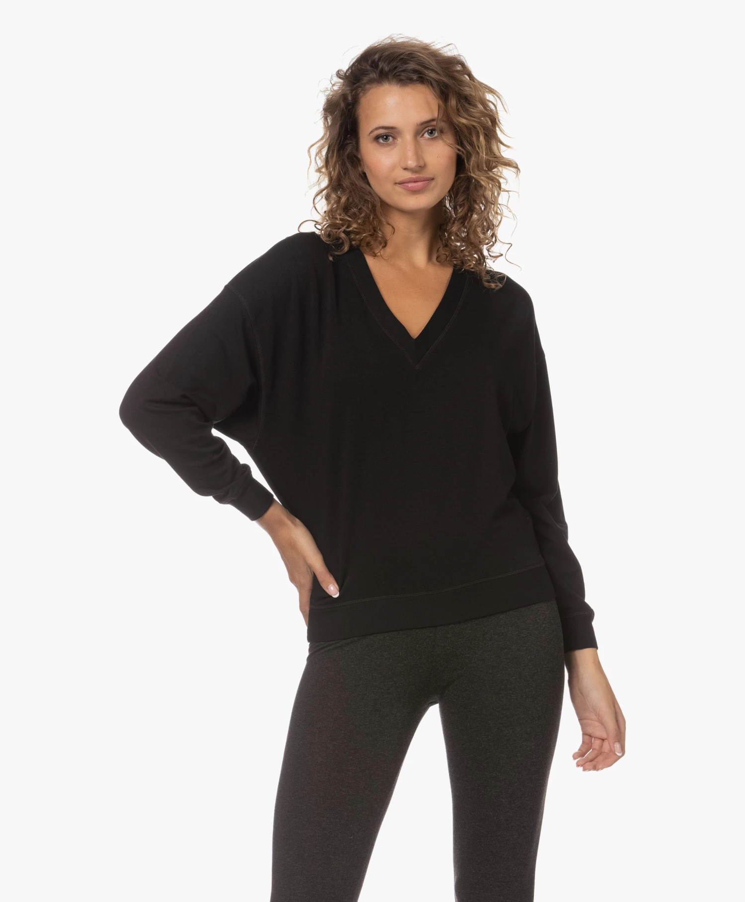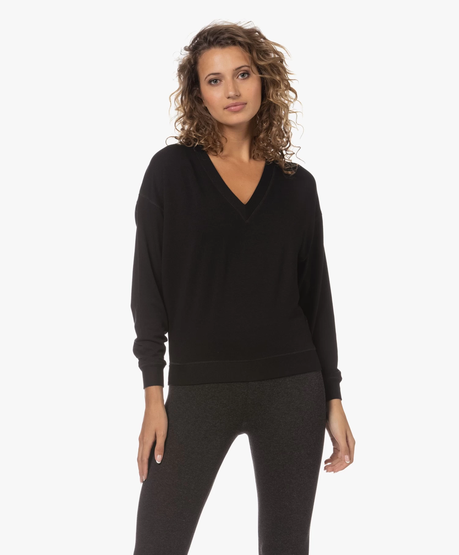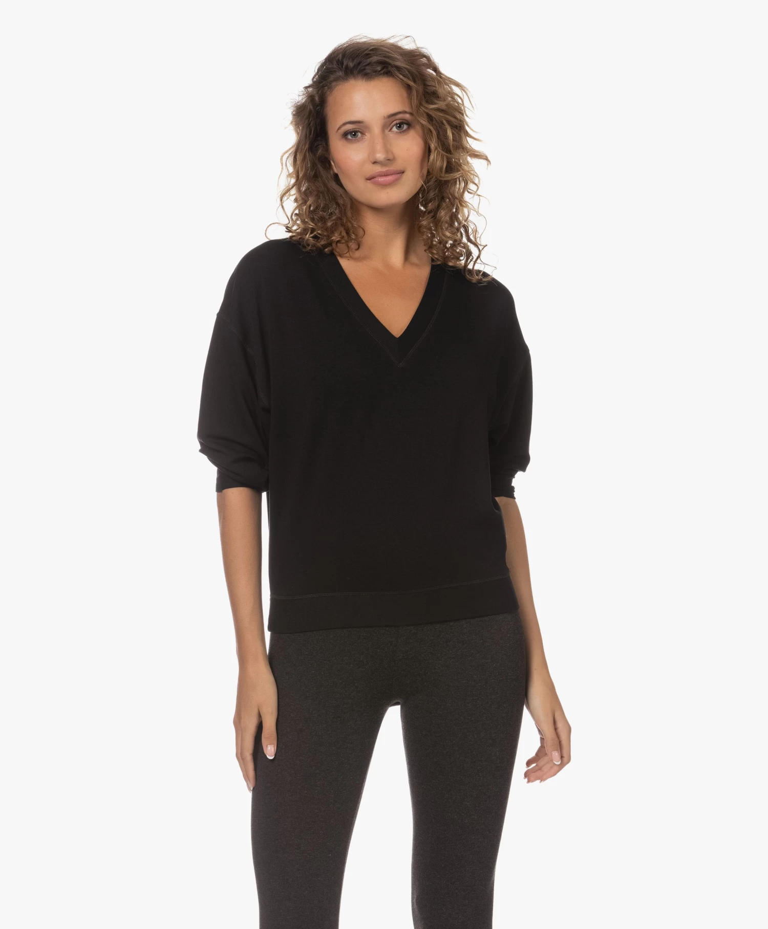 Nieuw in de Soft Touch-lijn van Majestic Filatures: een zwarte V-hals longsleeve van lichtgewicht stretch-viscose French terry. Met de looks van een sweatshirt, inclusief aangesloten zoomboord en manchetten, en het gewicht van een wat zwaarder T-shirt is dit een essential voor elk seizoen.
