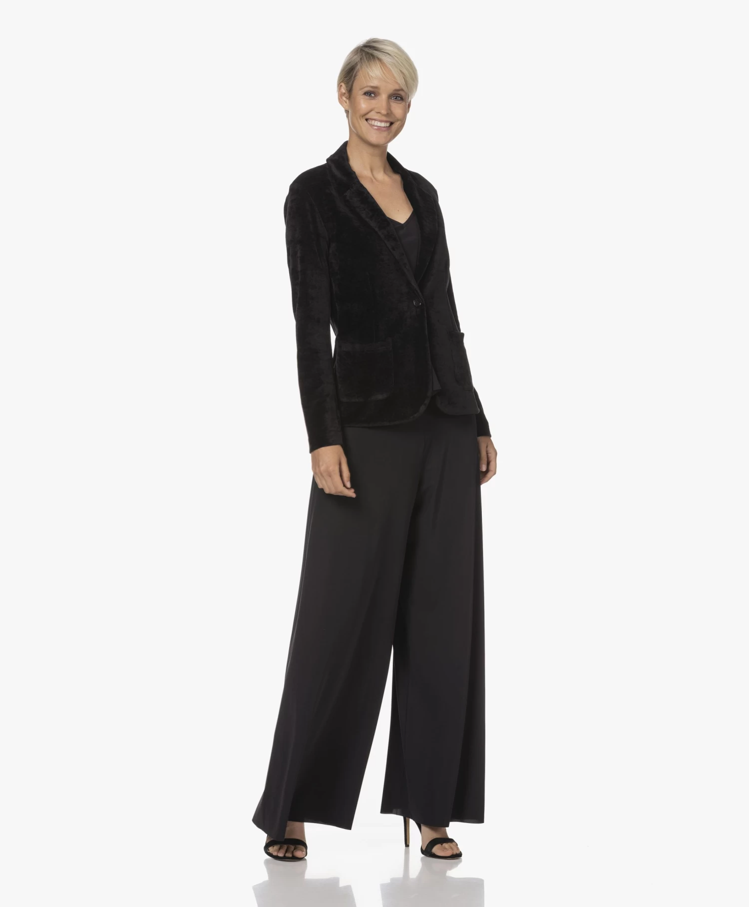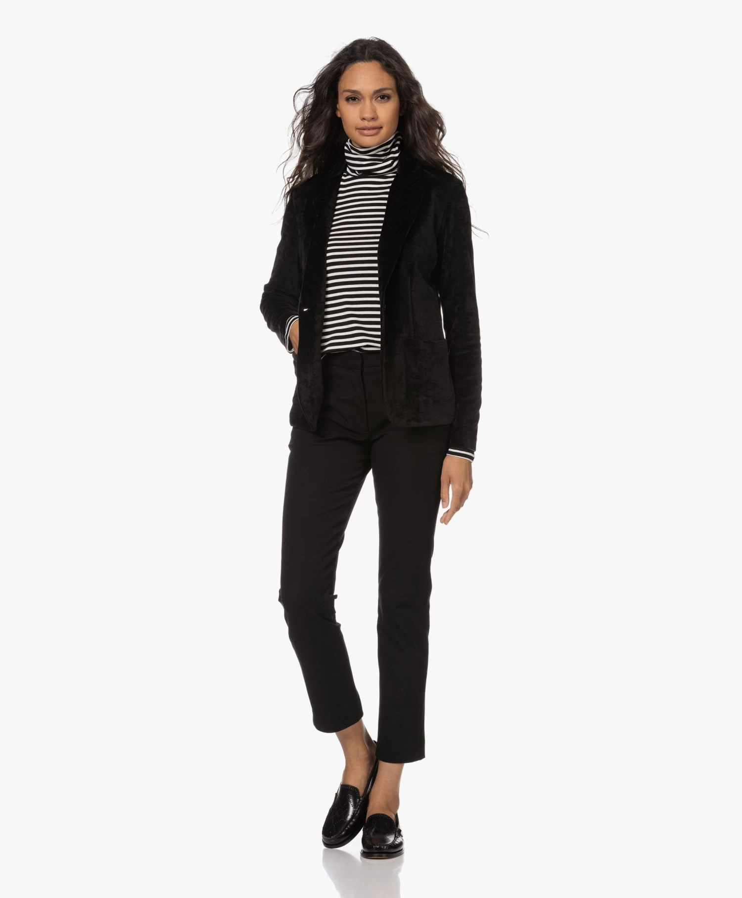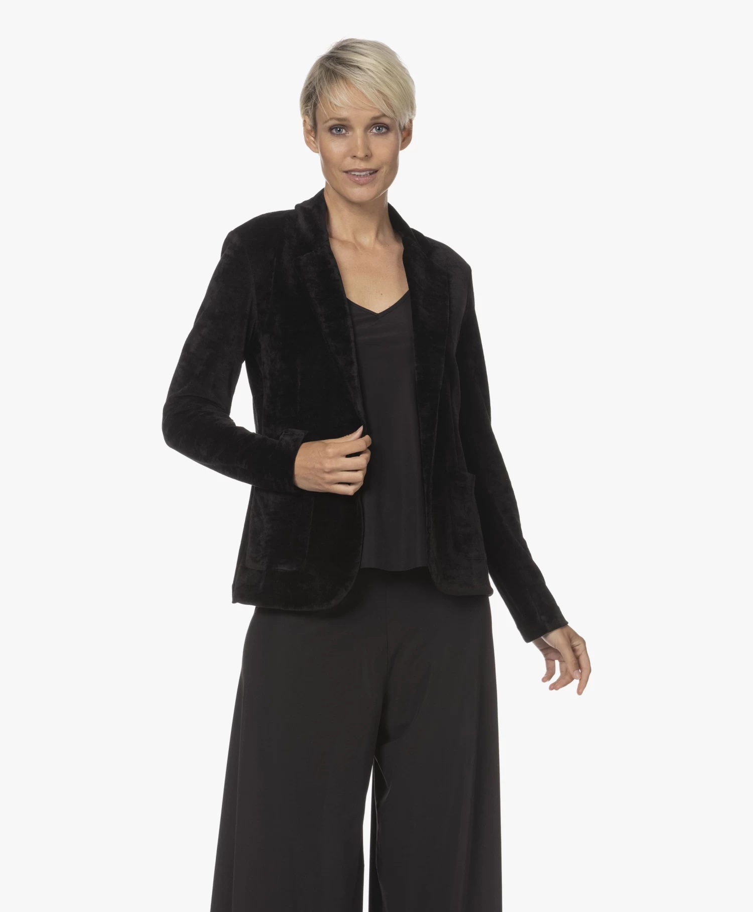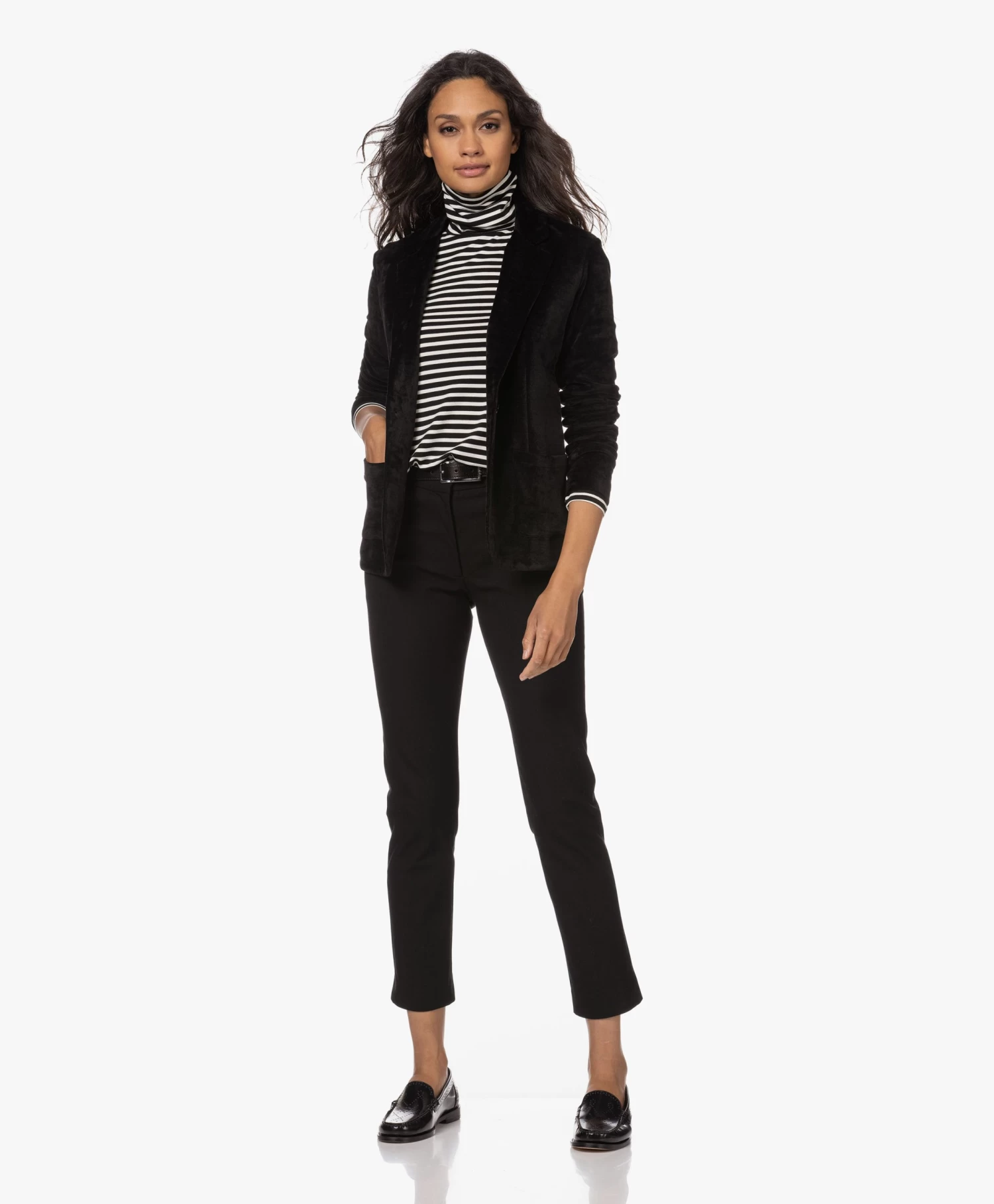 Nieuwste aanwinst in Majestic Filatures’ capsule-collectie essentials van modalmix stretch-velours: een slim-fit blazer. Het ontwerp is ongecompliceerd elegant, met een laag in de taille geplaatste knoopsluiting, slanke mouwen en afgeronde voorpanden. In tijdloos zwart een item waar je jarenlang plezier van gaat hebben!