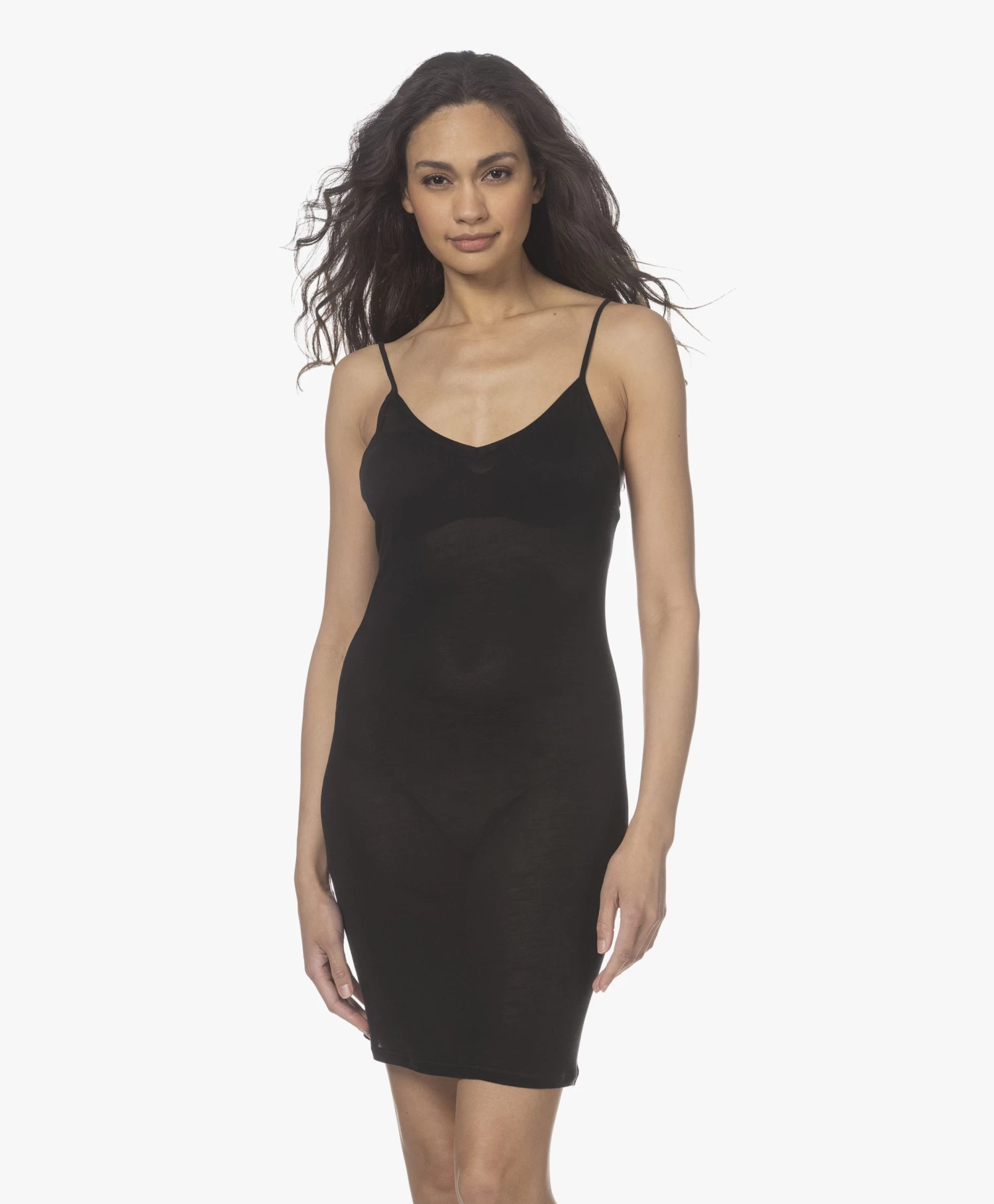 Deze zwarte slip dress van Majestic Filatures is uitgevoerd in een soepele lichtgewicht viscose jersey. De iconische belijning met spaghettibandjes en licht aangesloten pasvorm maakt de jurk perfect geschikt voor een laag-over-laag outfit: draag onder een jurk of combineer met een legging en een comfortabel open vest.