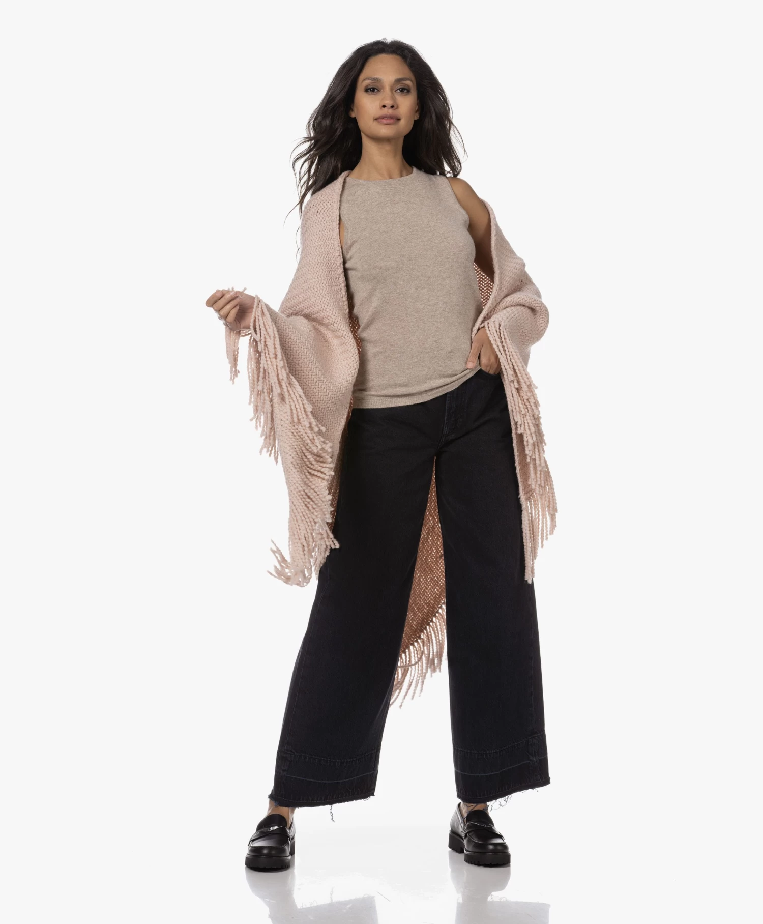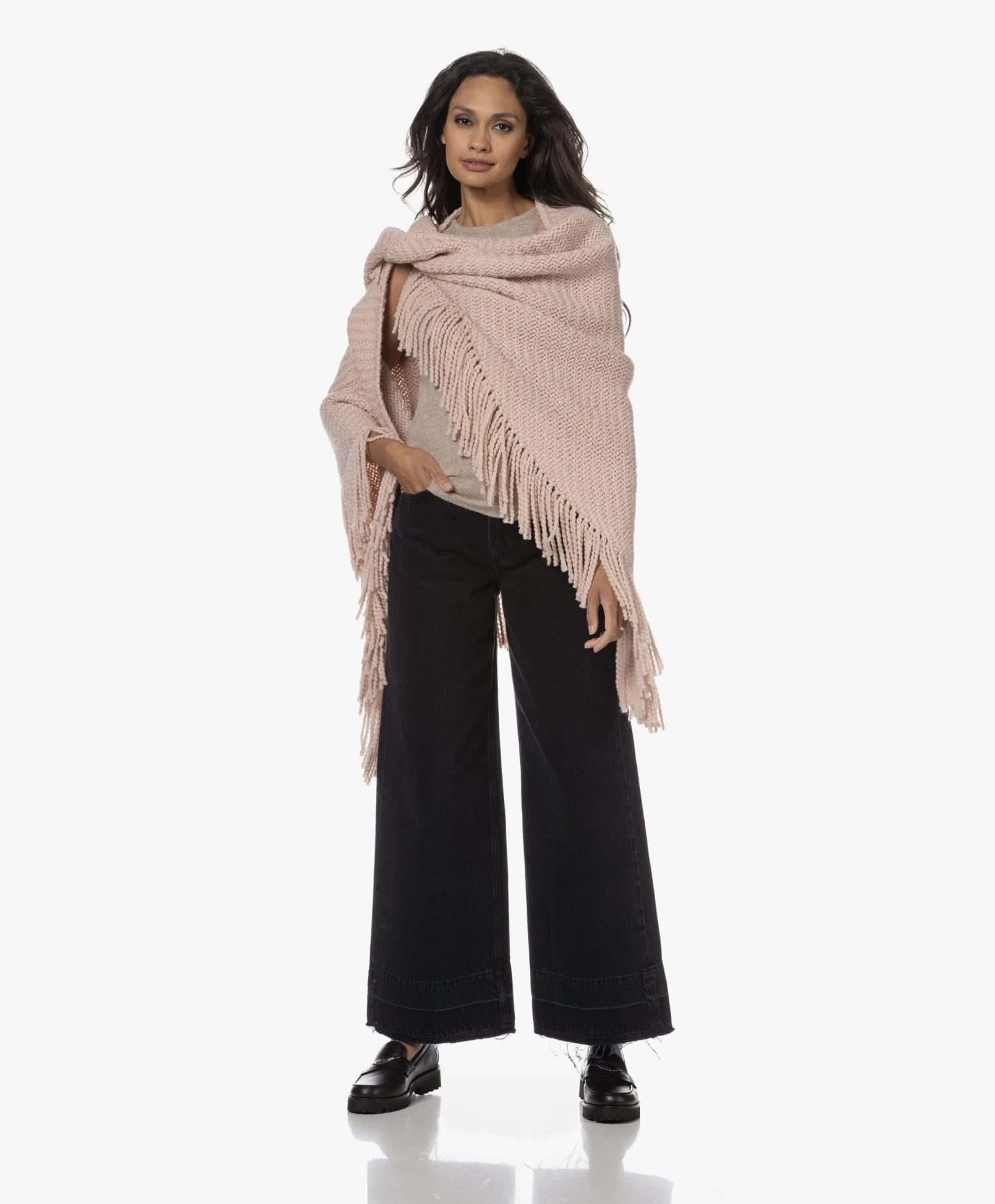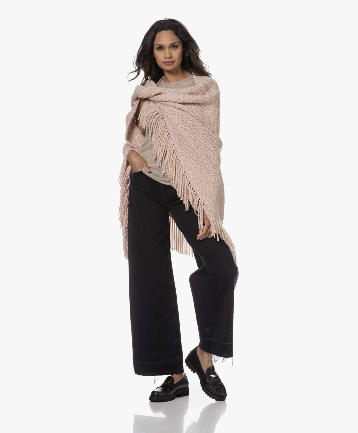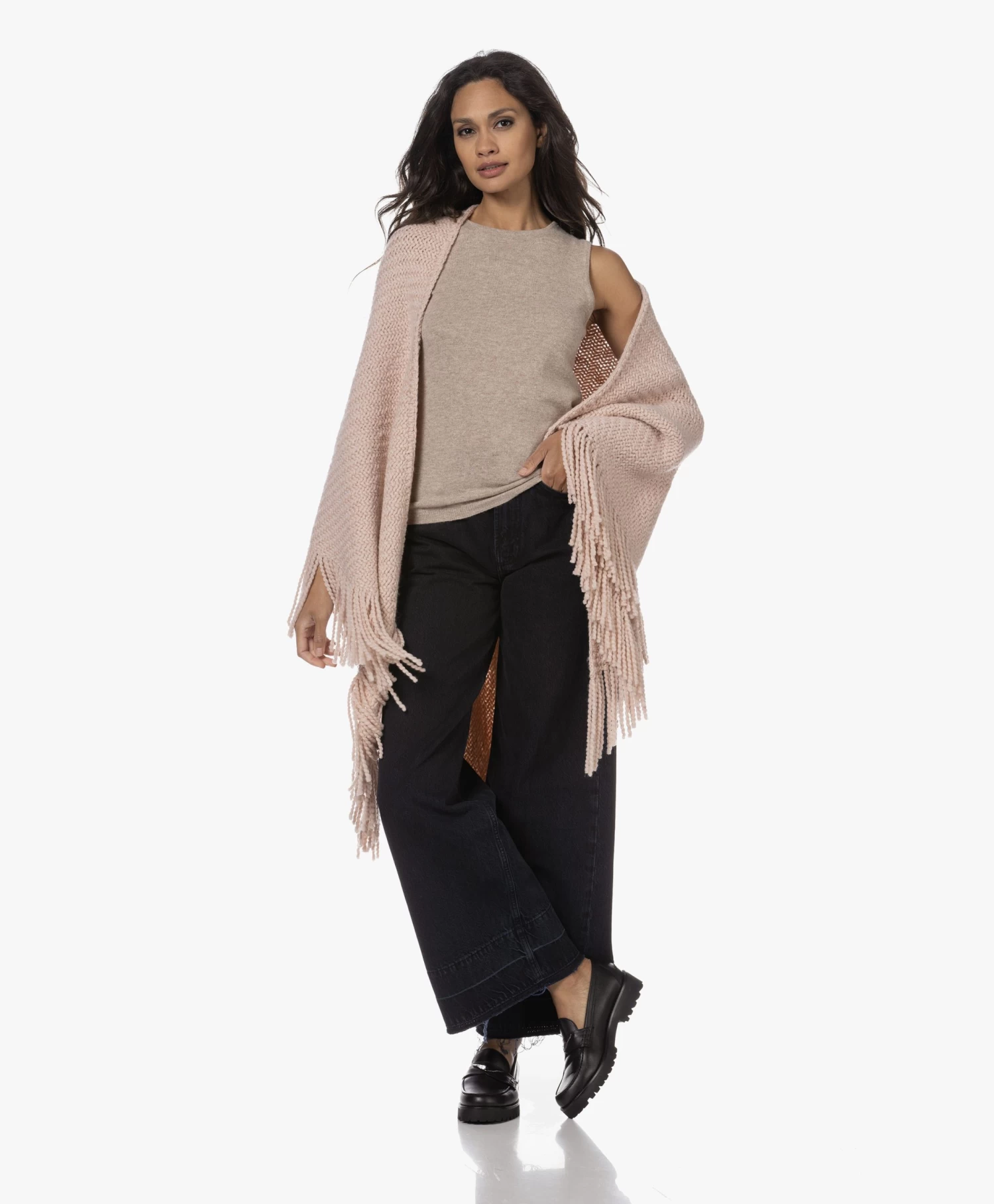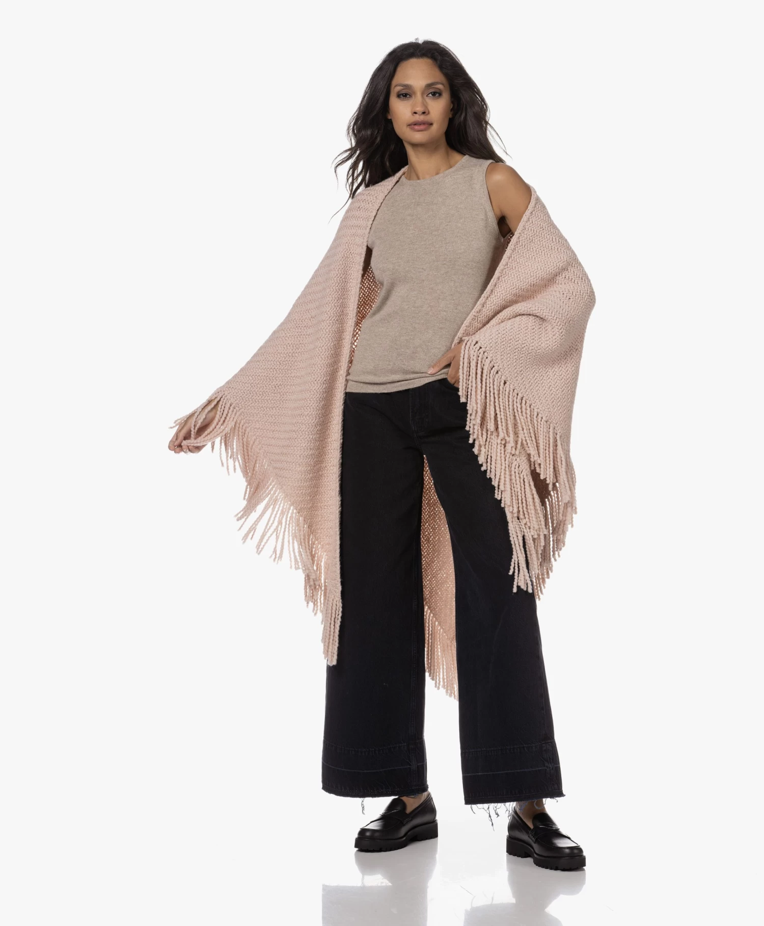Unieke, handgemaakte stukken geven je garderobe karakter. Dat is, naast ultieme veelzijdigheid in gebruik, de toegevoegde waarde van deze handgeweven poncho van Manos del Uruguay. Gemaakt van de fijnste merinowol en linnen, gesponnen tot een zacht en dik garen in licht oudroze. Draagmomenten te over, variërend van relaxen op de bank tot power naps in het vliegtuig of een rondje met de hond. De fairtrade insteek komt met een persoonlijk tintje: de hangtag vermeldt de naam van de trotse maker.