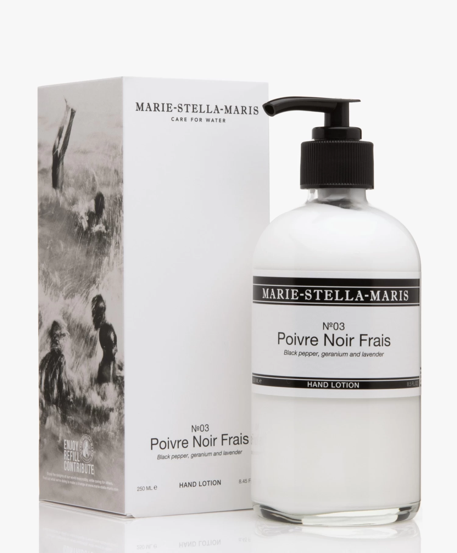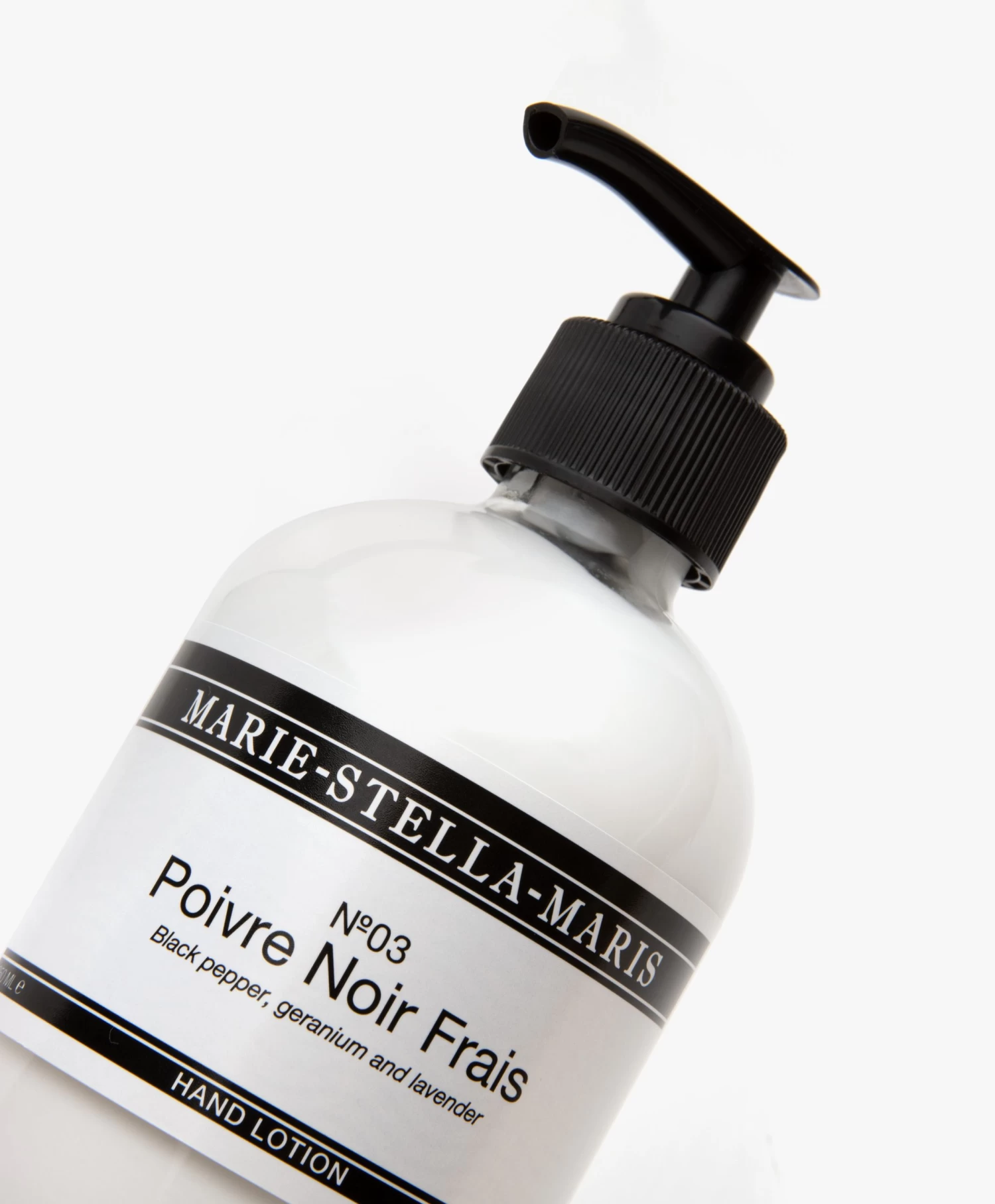 Zachte, perfect verzorgde handen gaat bij Marie-Stella-Maris standaard gepaard met een verrijking van je interieur. De No.03 Poive Noir Frais Hand Lotion komt in een glazen pompfles met het klassieke – en inmiddels iconische – zwart/witte etiket. Met natuurlijke ingrediënten zoals glycerine, sheaboter en zonnebloemolie voedt deze handcrème de huid optimaal terwijl de kruidige, warme tonen van zwarte peper, geranium en lavendel een delicate geur achterlaat die je steeds weer opnieuw wilt ruiken.