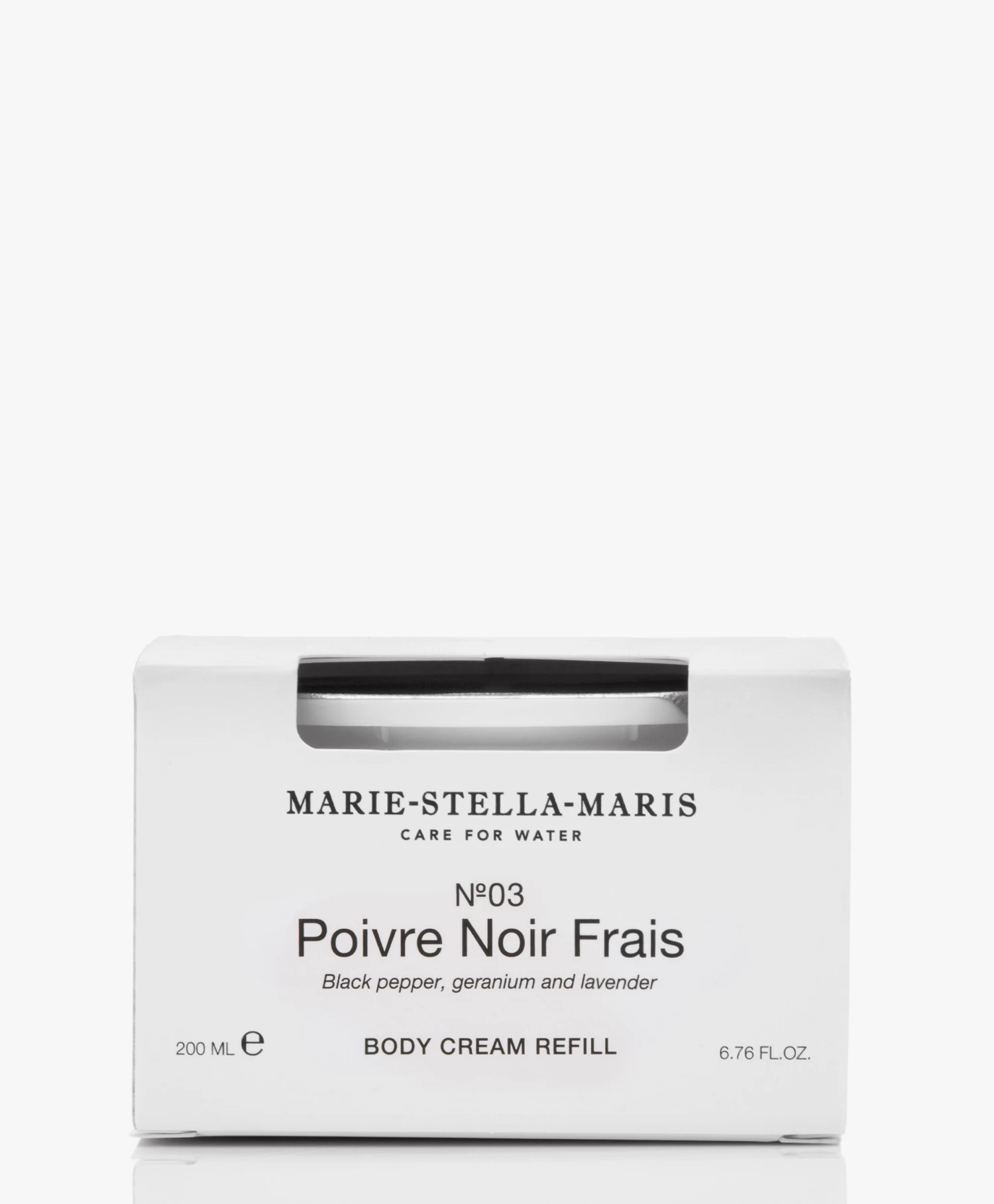 Refill nodig van je favoriete Marie-Stella-Maris Body Cream in de No.03 Poivre Noir Frais geur? We’ve got you covered! De crème vormt de basis voor een soepele, zachte en verzorgde huid dankzij de hydraterende formule met onder meer voedende shea boter en amandelolie. Verzorg droge plekken met deze snel absorberende, niet-plakkende body crème voor een gehydrateerde en gezonde huid – ideaal voor dagelijks gebruik. Deze body crème komt in de No.03 Poivre Noir Frais geur – een klassieke, krachtige unisex geur met tonen van zwarte peper, geranium en lavendel.