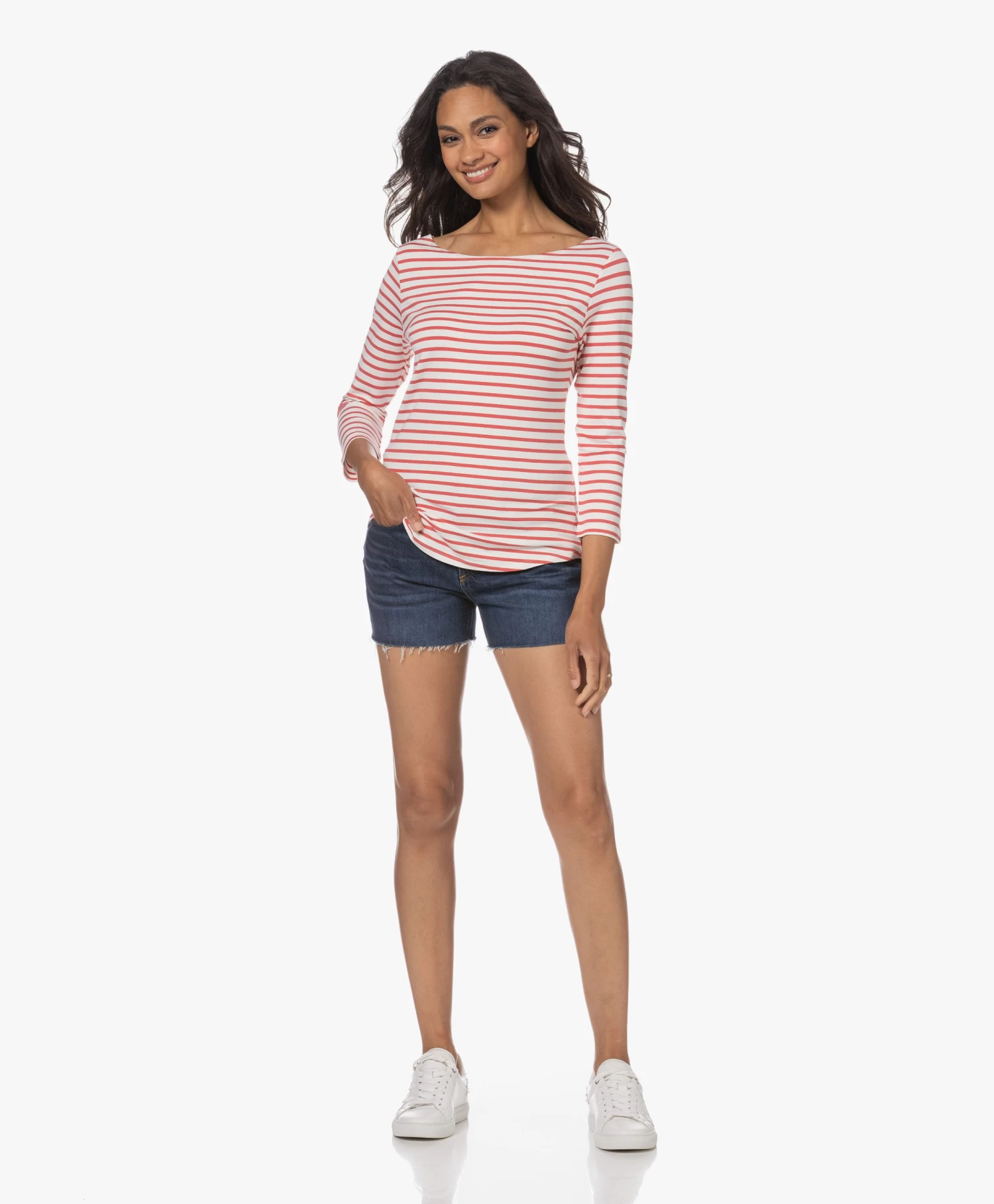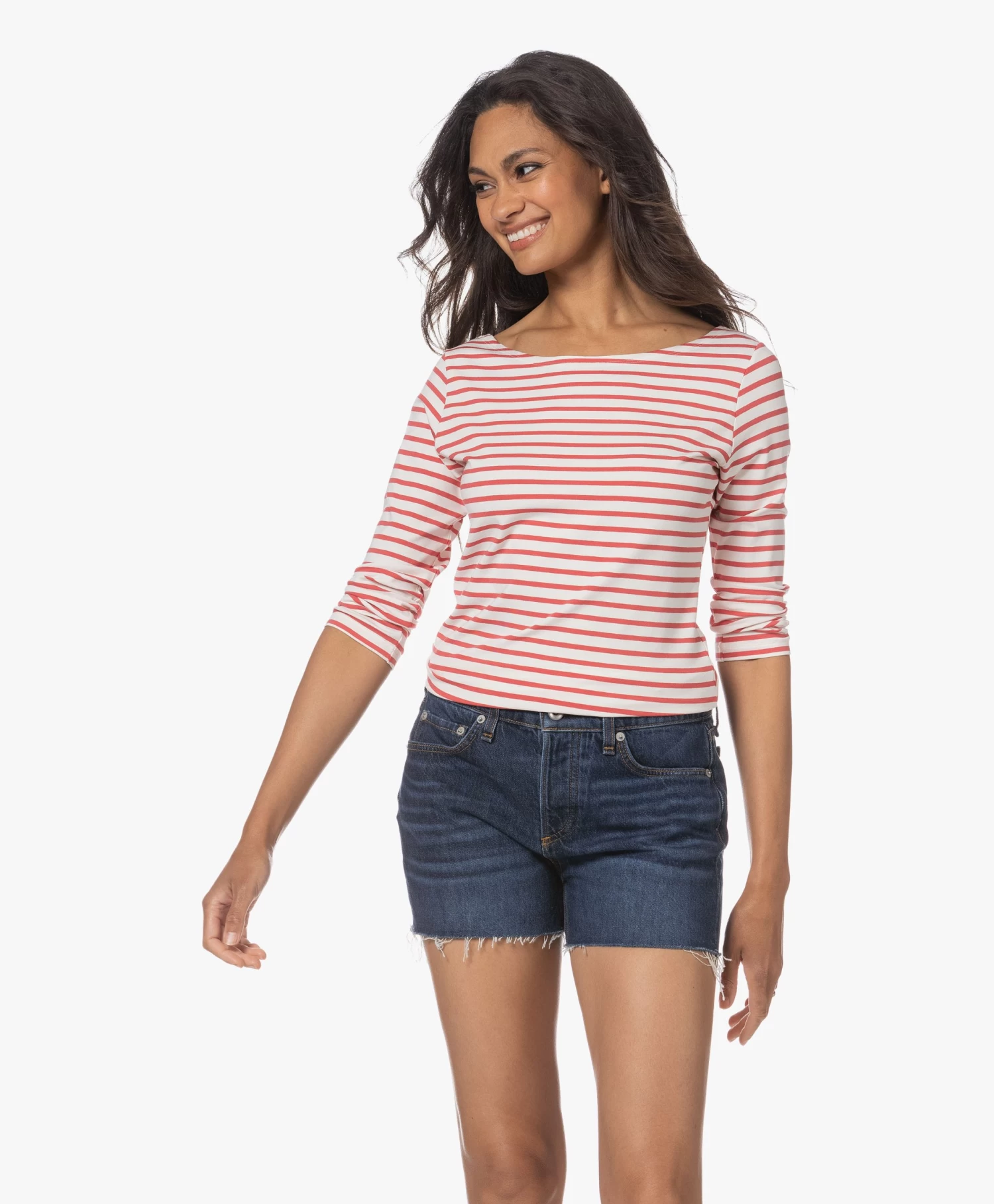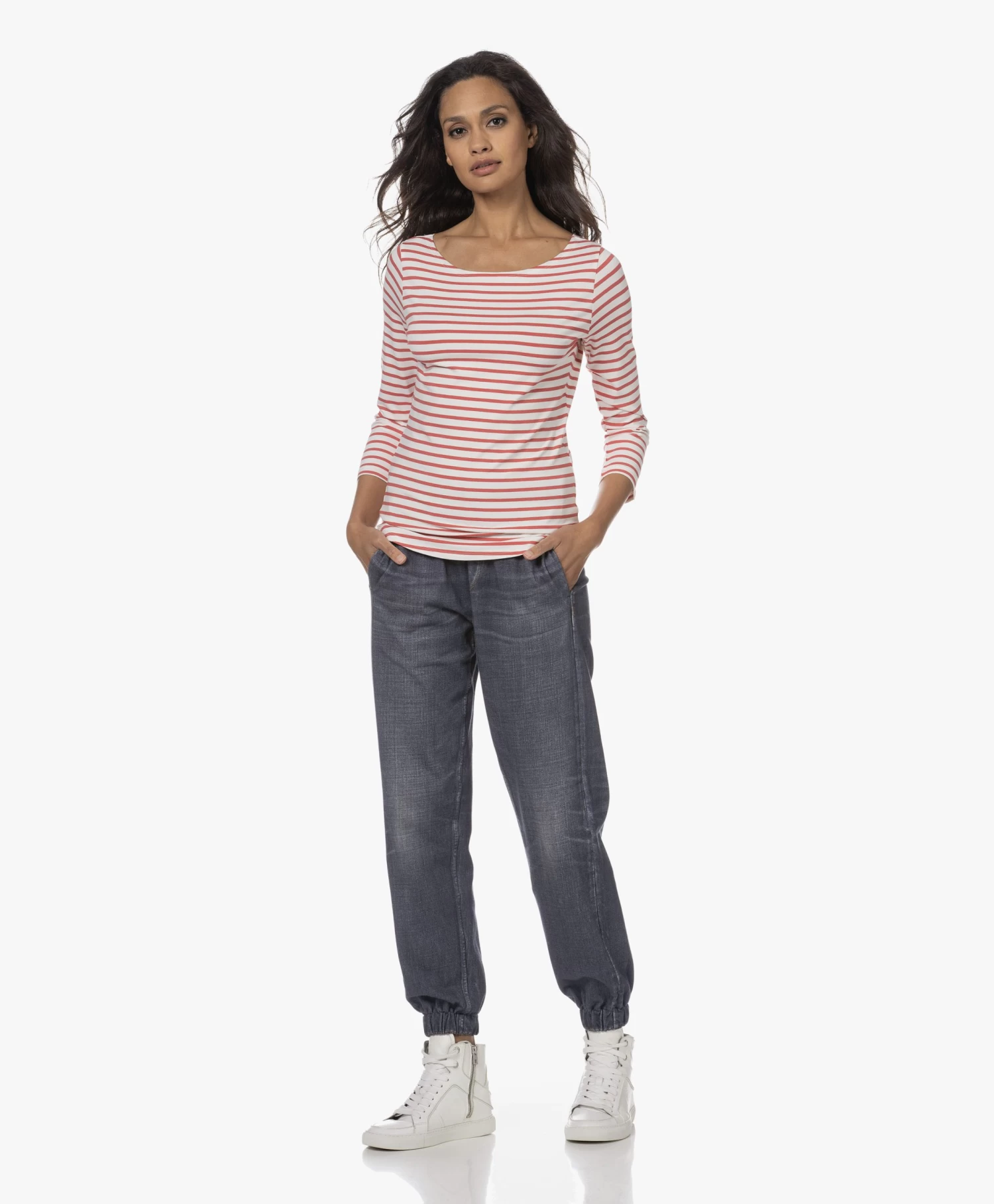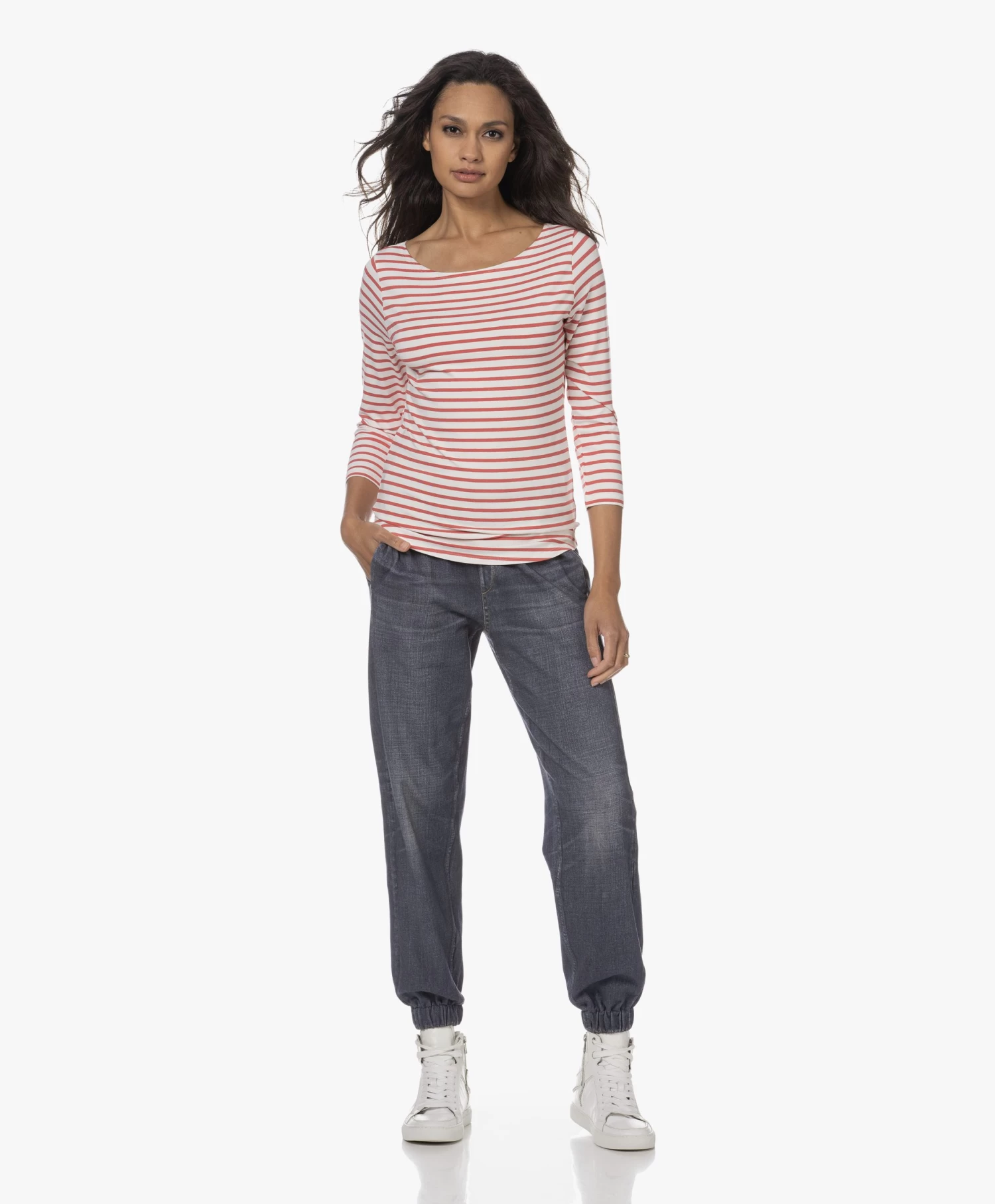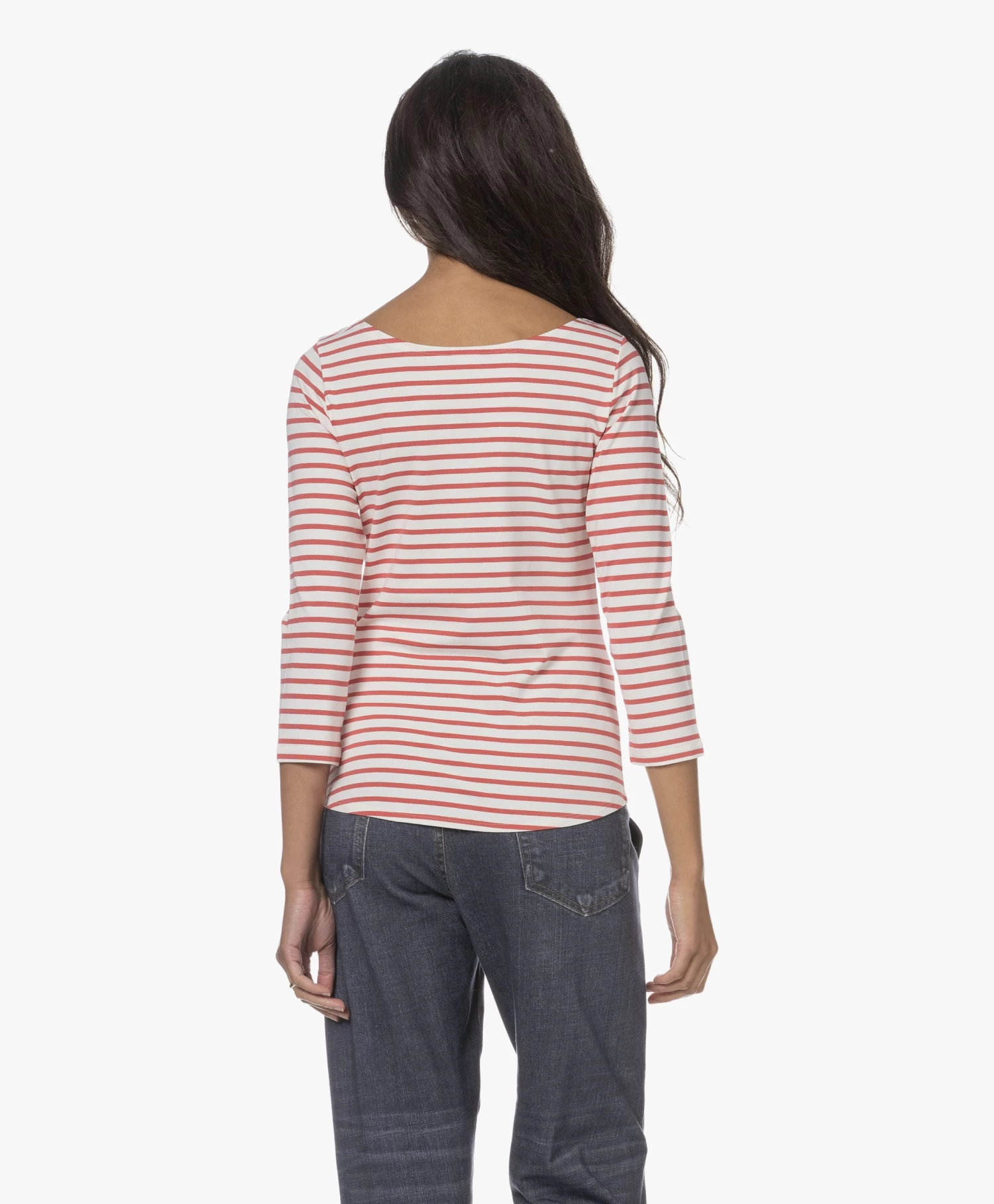 no man’s land weet dit T-shirt met vrouwelijke boothals nog aantrekkelijker te maken door een donkerroze streepdessin toe te voegen aan de witte basis. Het T-shirt met driekwart mouwen is gemaakt van een zachte en soepele viscose kwaliteit met stretch voor een perfecte pasvorm. Â