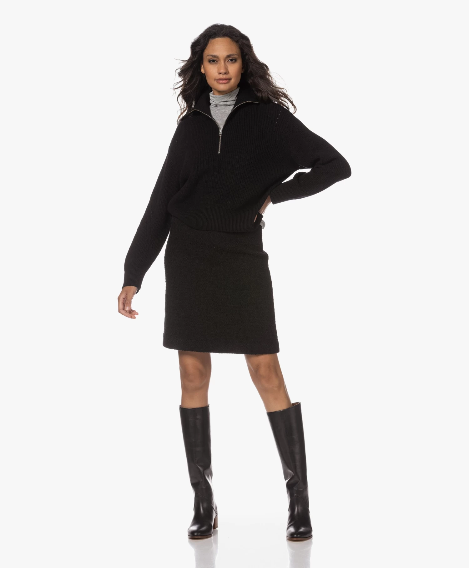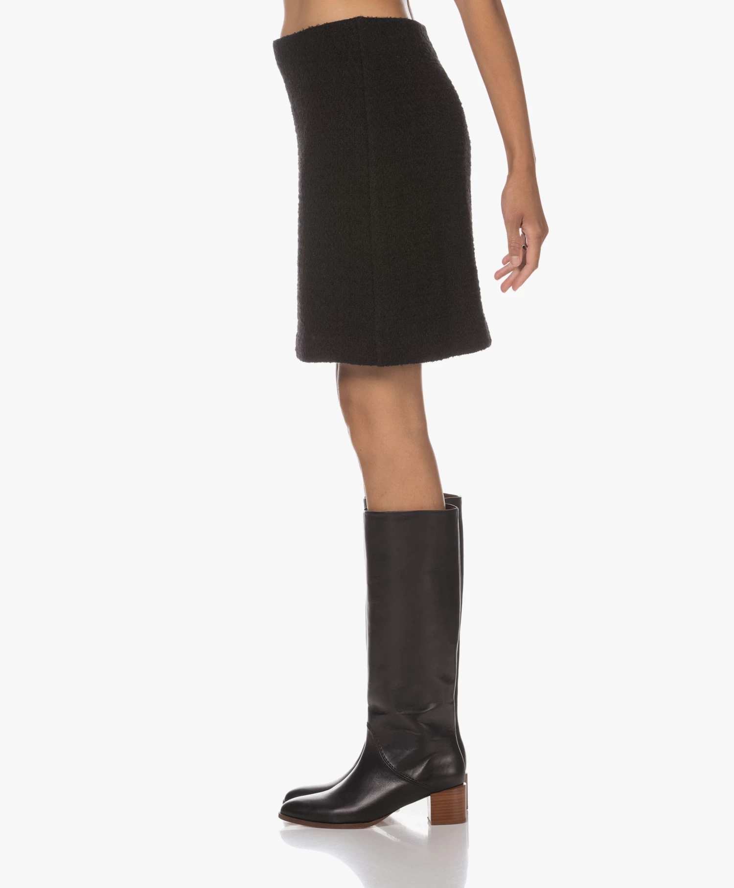 Met een stof zo stijlvol als deze zijn details overbodig. no man’s land’s rechte zwarte rok is gemaakt van middelzware bouclé in een blend met scheerwol en katoen, grofgeweven in een onregelmatige wafelstructuur. Zin in een office look nieuwe-stijl? Er is ook een bijpassend jasje met ronde hals.