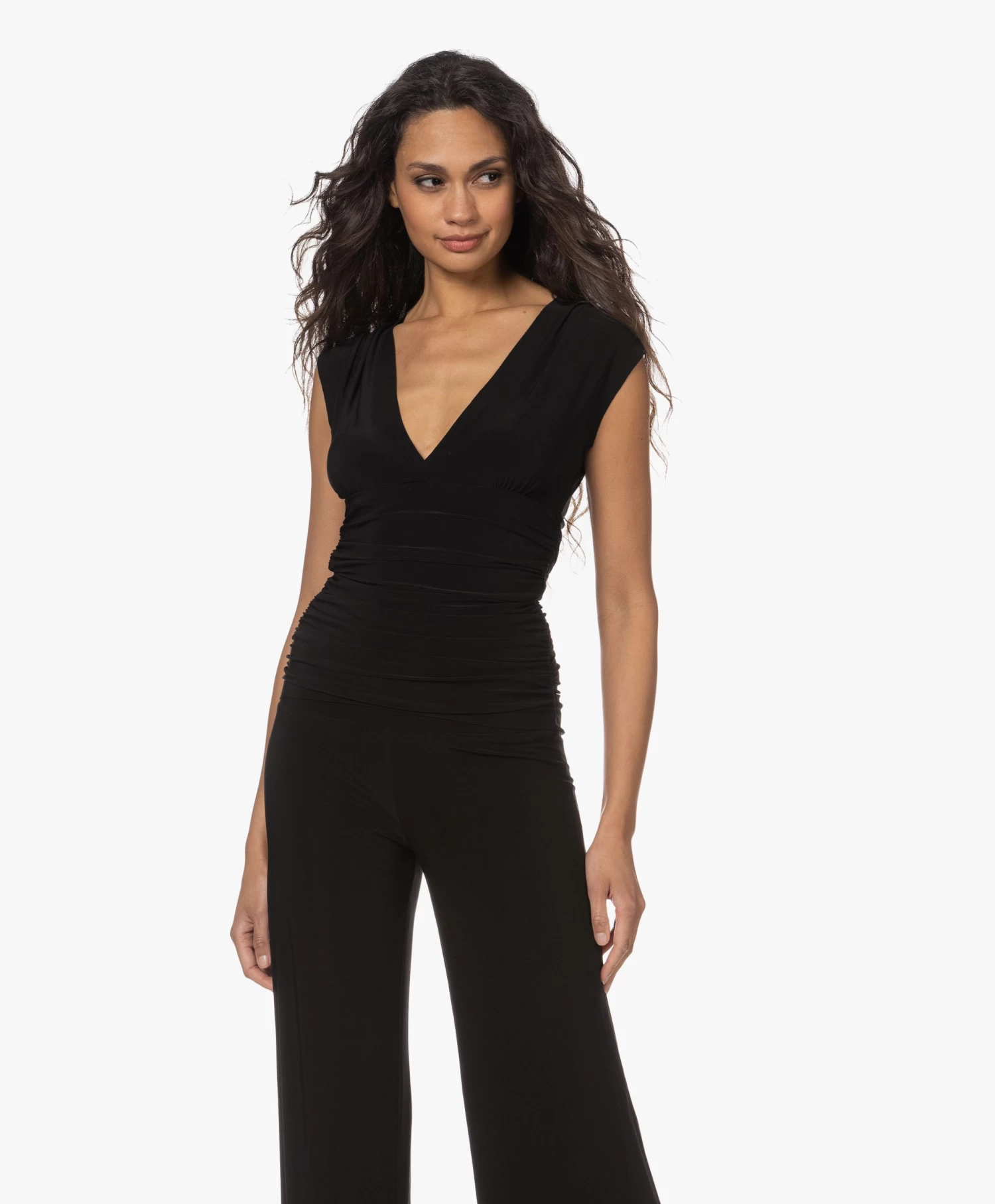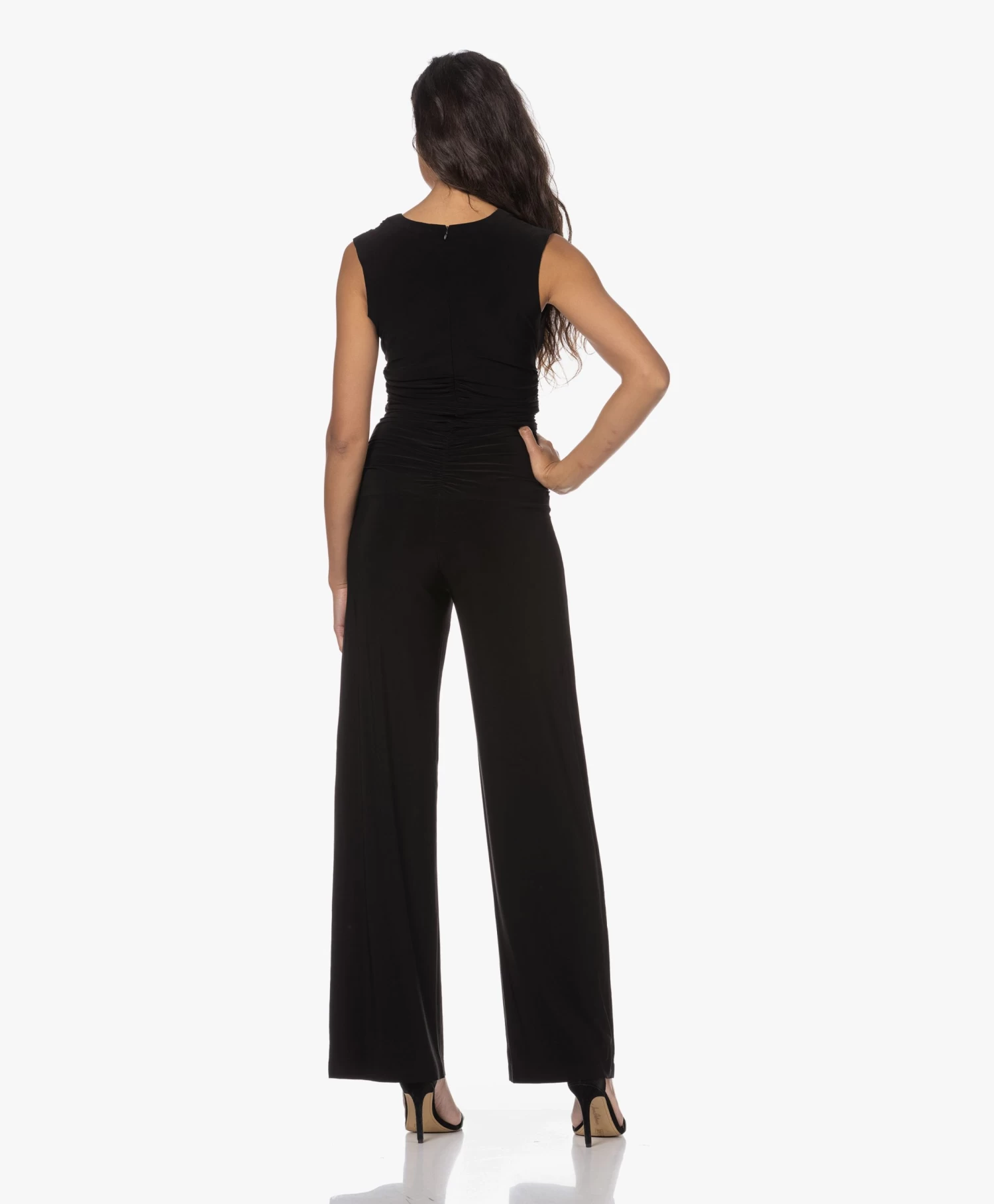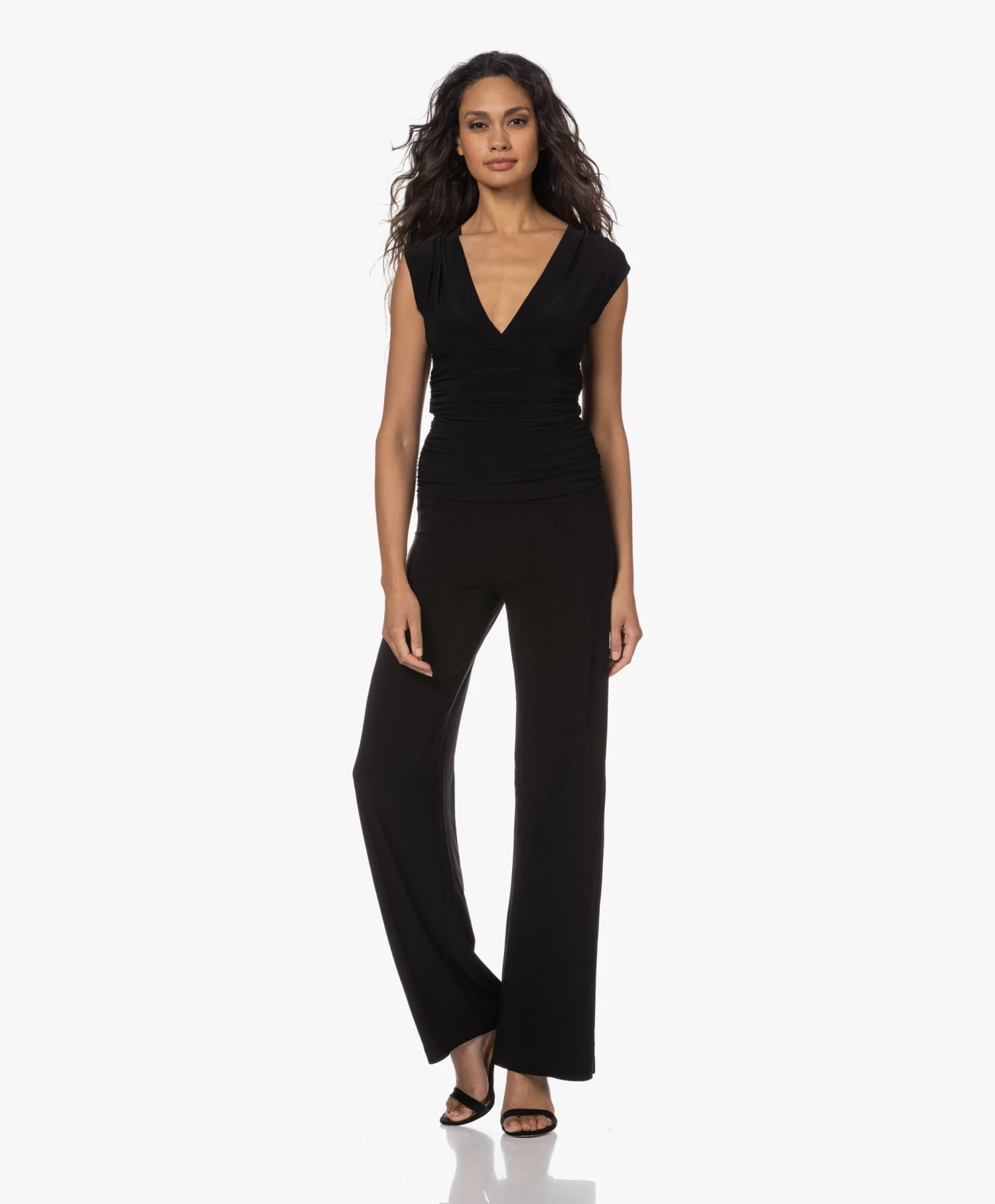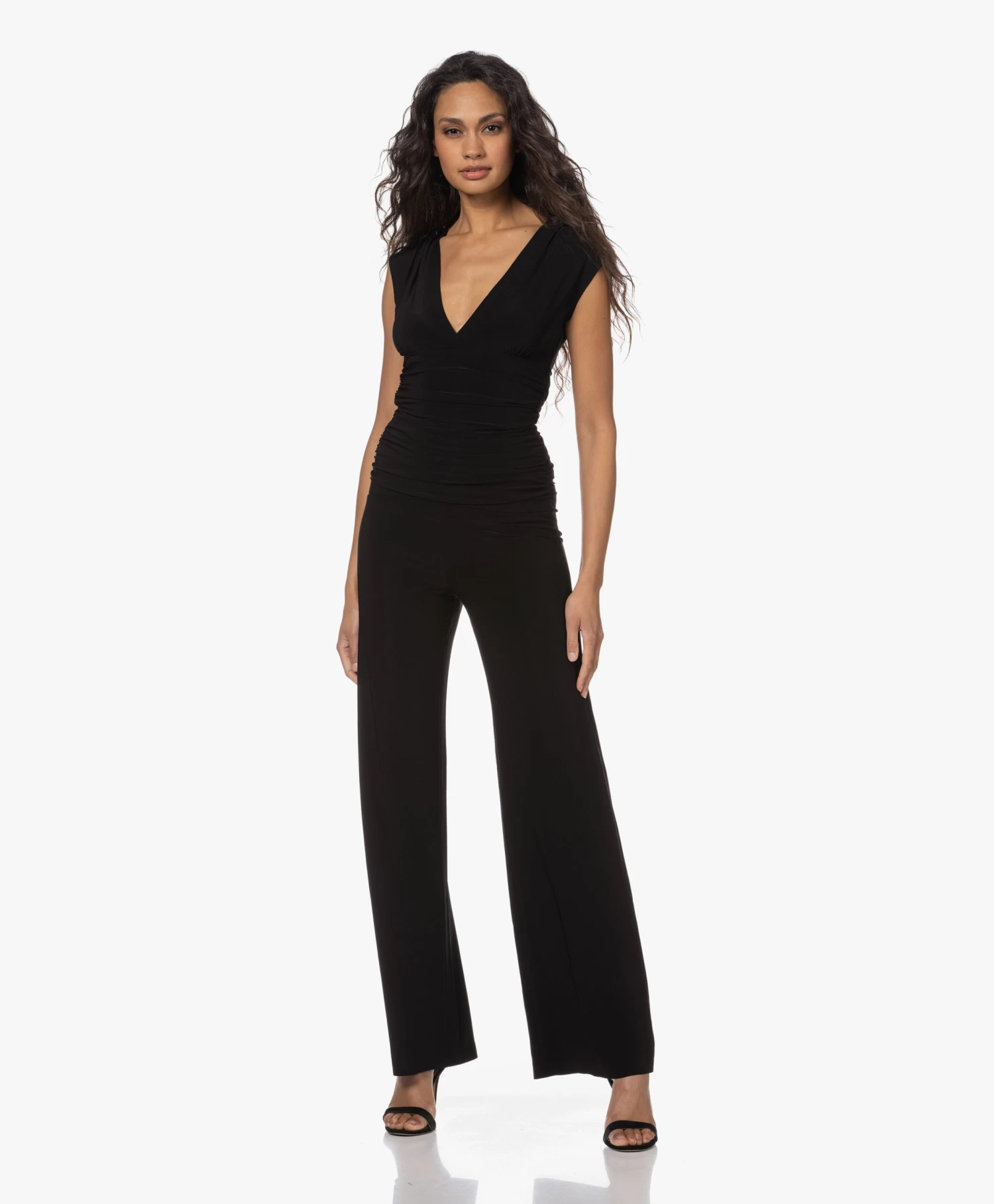 Een ontwerp om indruk mee te maken, seizoen na seizoen, jaar na jaar. Norma Kamali brengt deze zwarte jumpsuit met een ultra-diepe V-hals en een gelaagd paneel met plooien bij de taille die de minder geliefde aspecten van je figuur camoufleren terwijl ze tegelijkertijd het vrouwelijke silhouet accentueren. Gemaakt van een ultra-soepele, stretchy en gladde travel jersey kwaliteit.