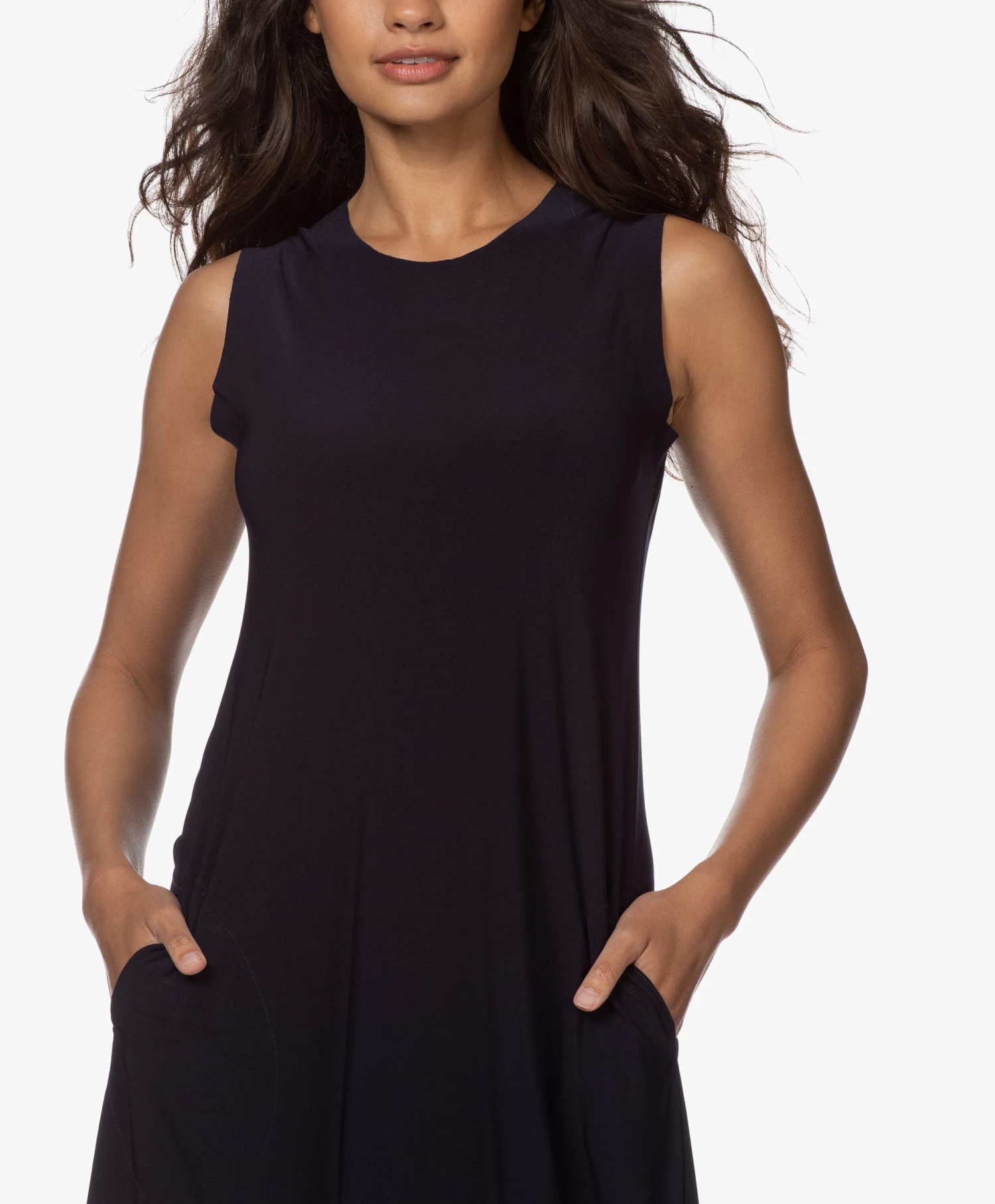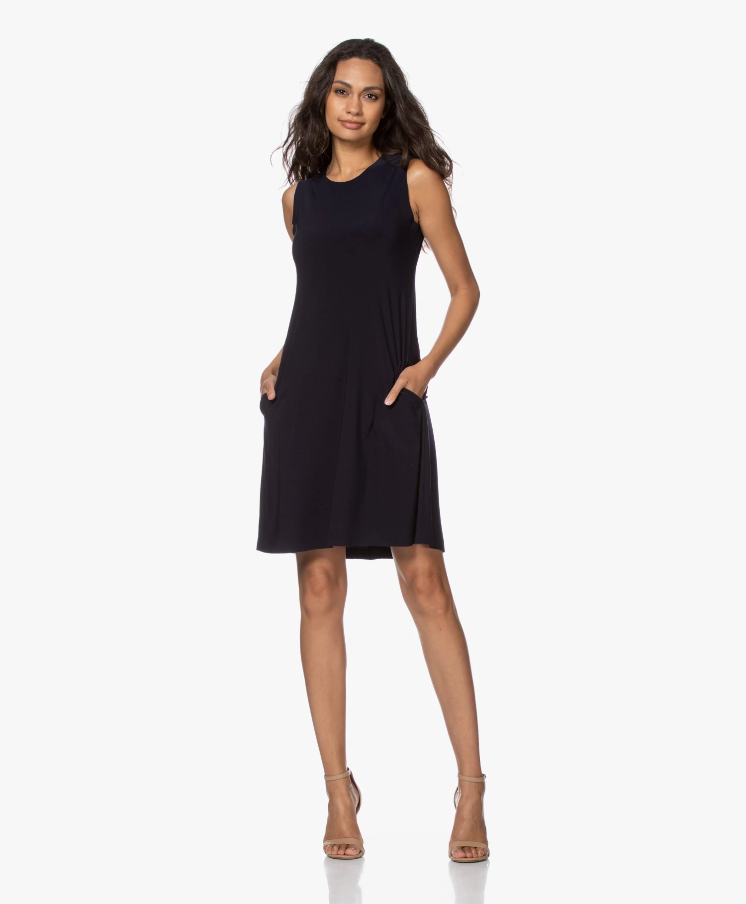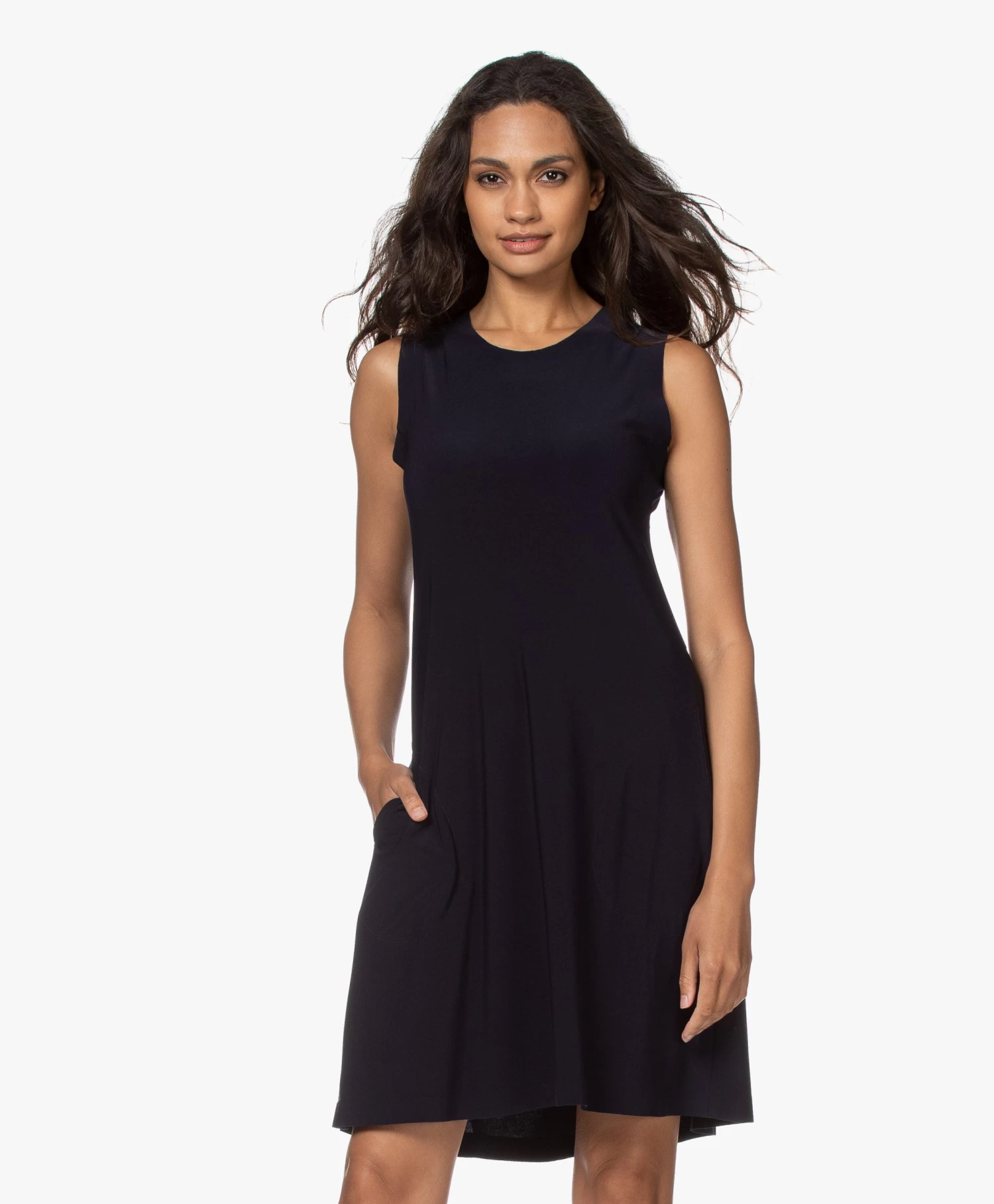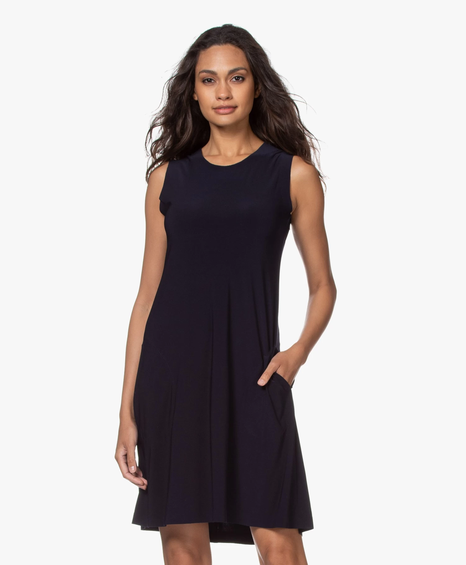 Flatterend voor elk figuur, deze donkerblauwe mouwloze Swing jurk van Norma Kamali. De knielange jurk is ontworpen met een speels fit & flare silhouet en komt in een comfortabele en gladde tech stretch jersey kwaliteit met een matte afwerking die nauwelijks kreukt. Laser-cut afwerkingen bij de hals, armsgaten en zoom benadrukken het minimalistische karakter.