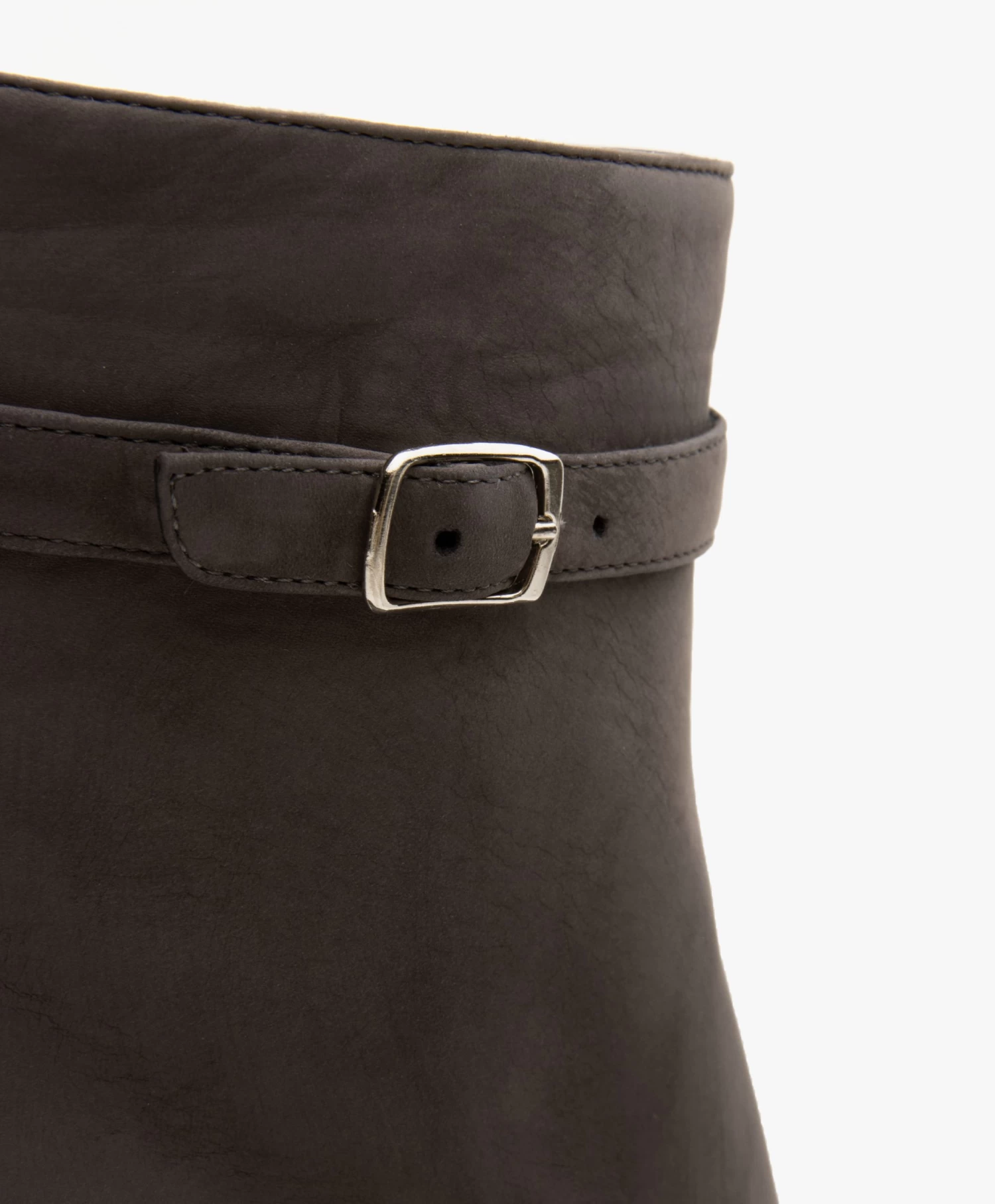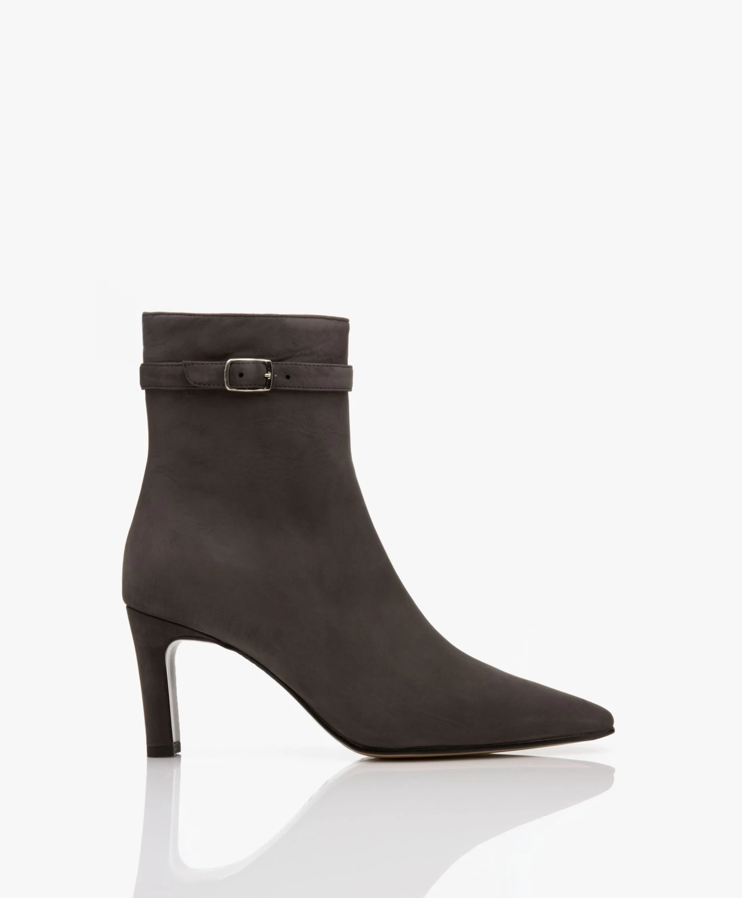 Deze stijlvolle enkellaarzen van Panara zijn uitgevoerd in een donkergrijze, hoogwaardige suède kwaliteit. Ontworpen met een decoratief gespbandje, een met suède bekleedde middelhoge hak, een elegante schachthoogte en een puntige neus voor een vrouwelijke uitstraling. Door de ritssluiting aan de binnenkant zijn de laarzen gemakkelijk aan te trekken.