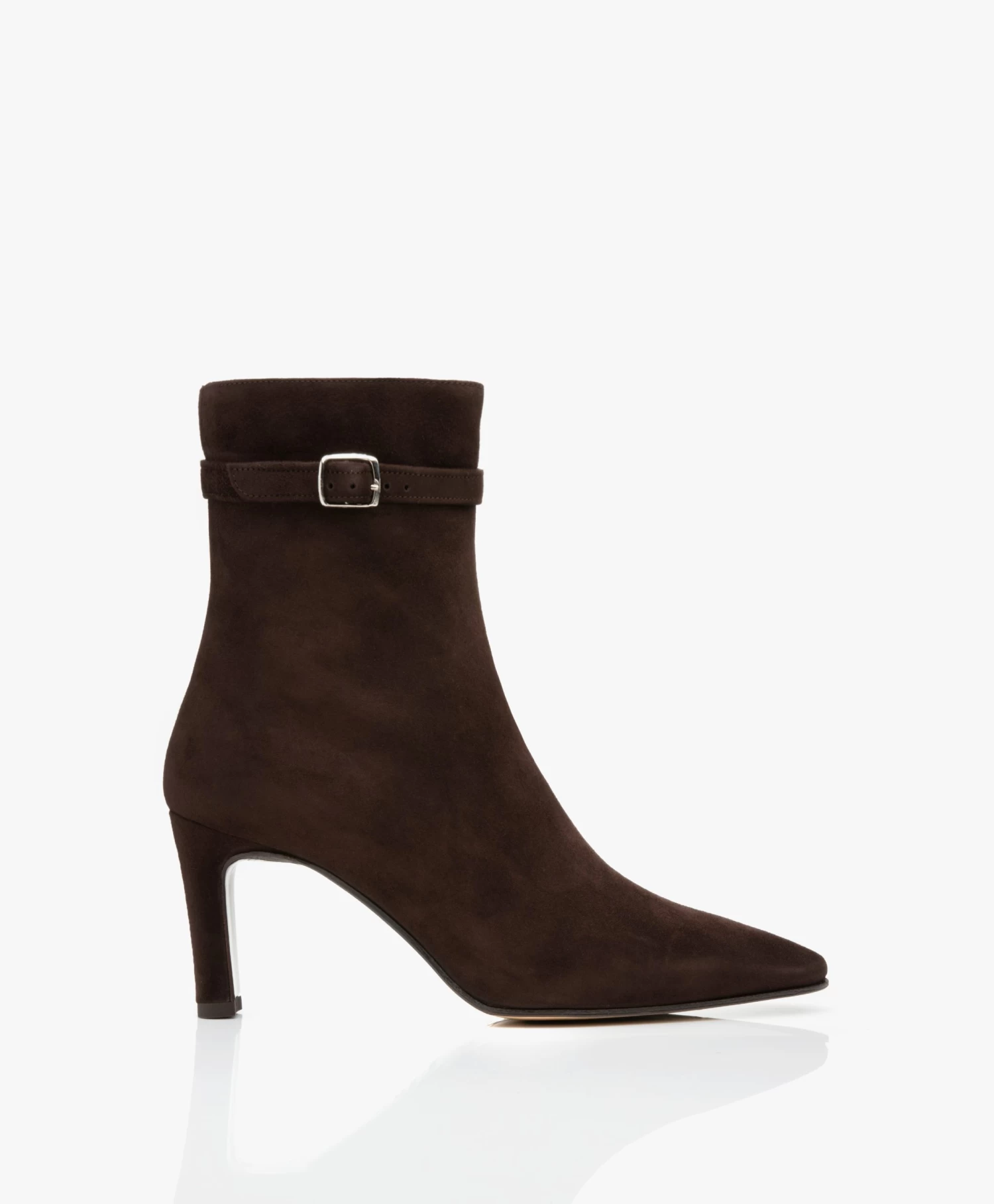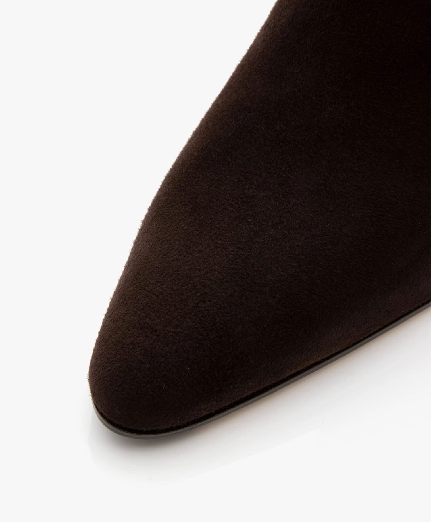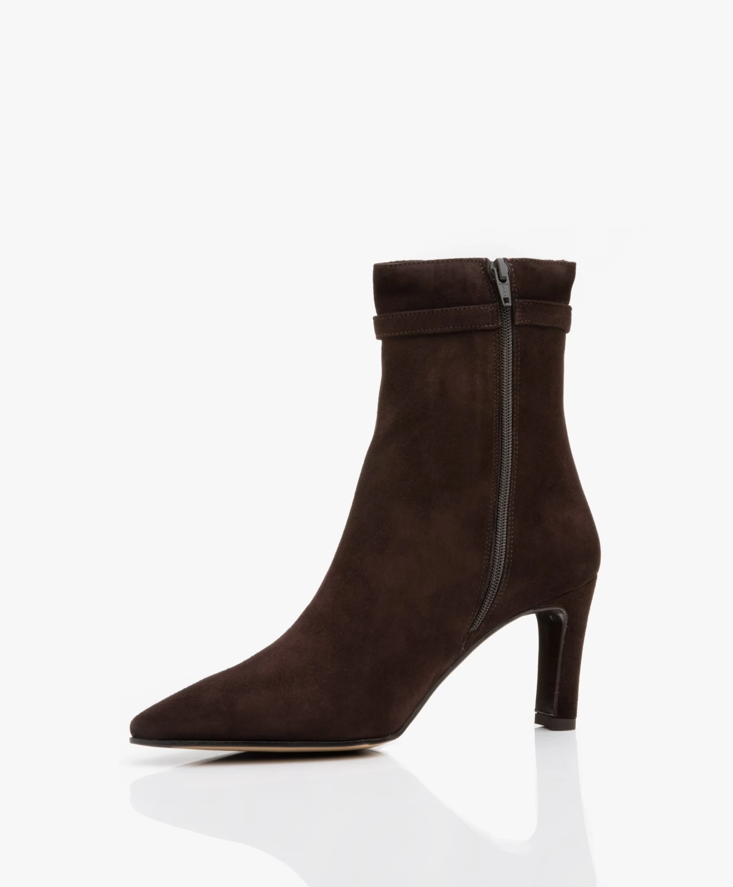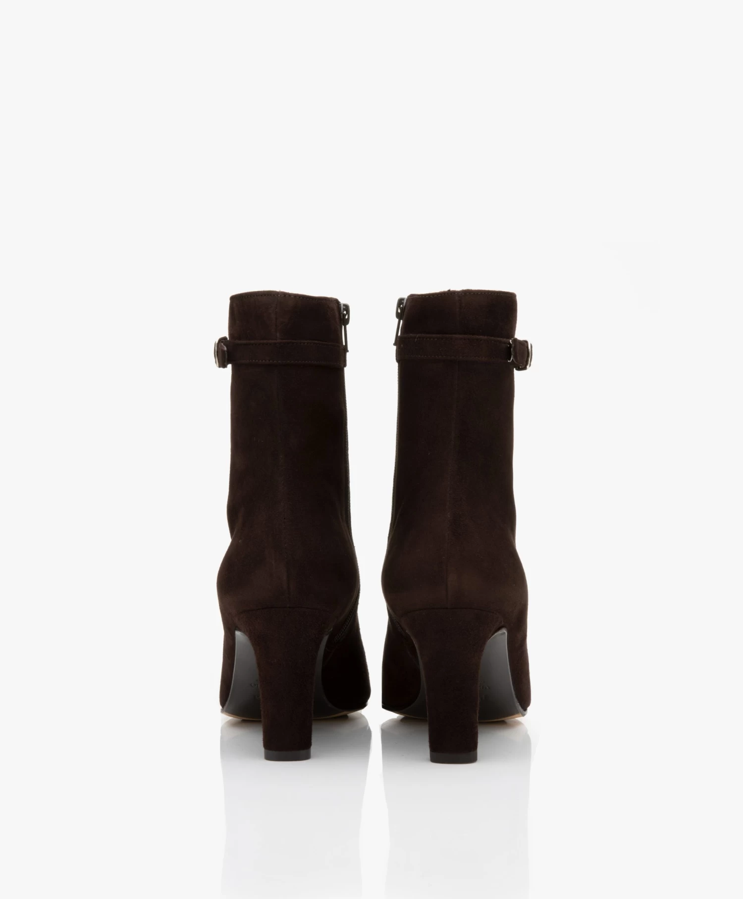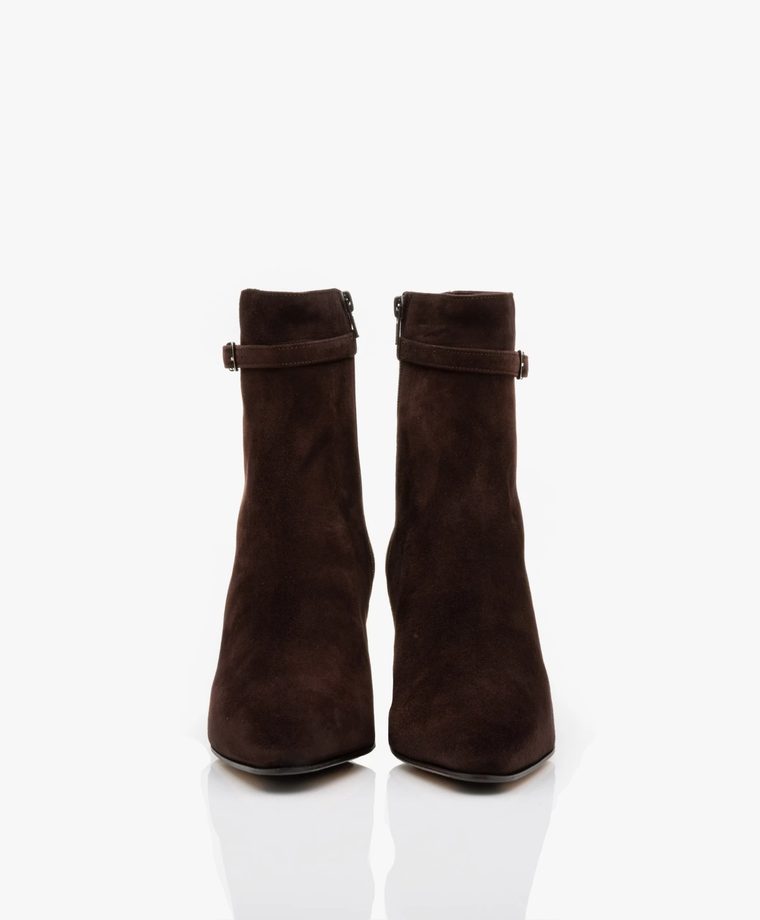 Deze stijlvolle enkellaarzen van Panara zijn uitgevoerd in een donkerbruine, hoogwaardige suède kwaliteit. Ontworpen met een decoratief gespbandje, een met suède bekleedde middelhoge hak, een elegante schachthoogte en een puntige neus voor een vrouwelijke uitstraling. Door de ritssluiting aan de binnenkant zijn de laarzen gemakkelijk aan te trekken.