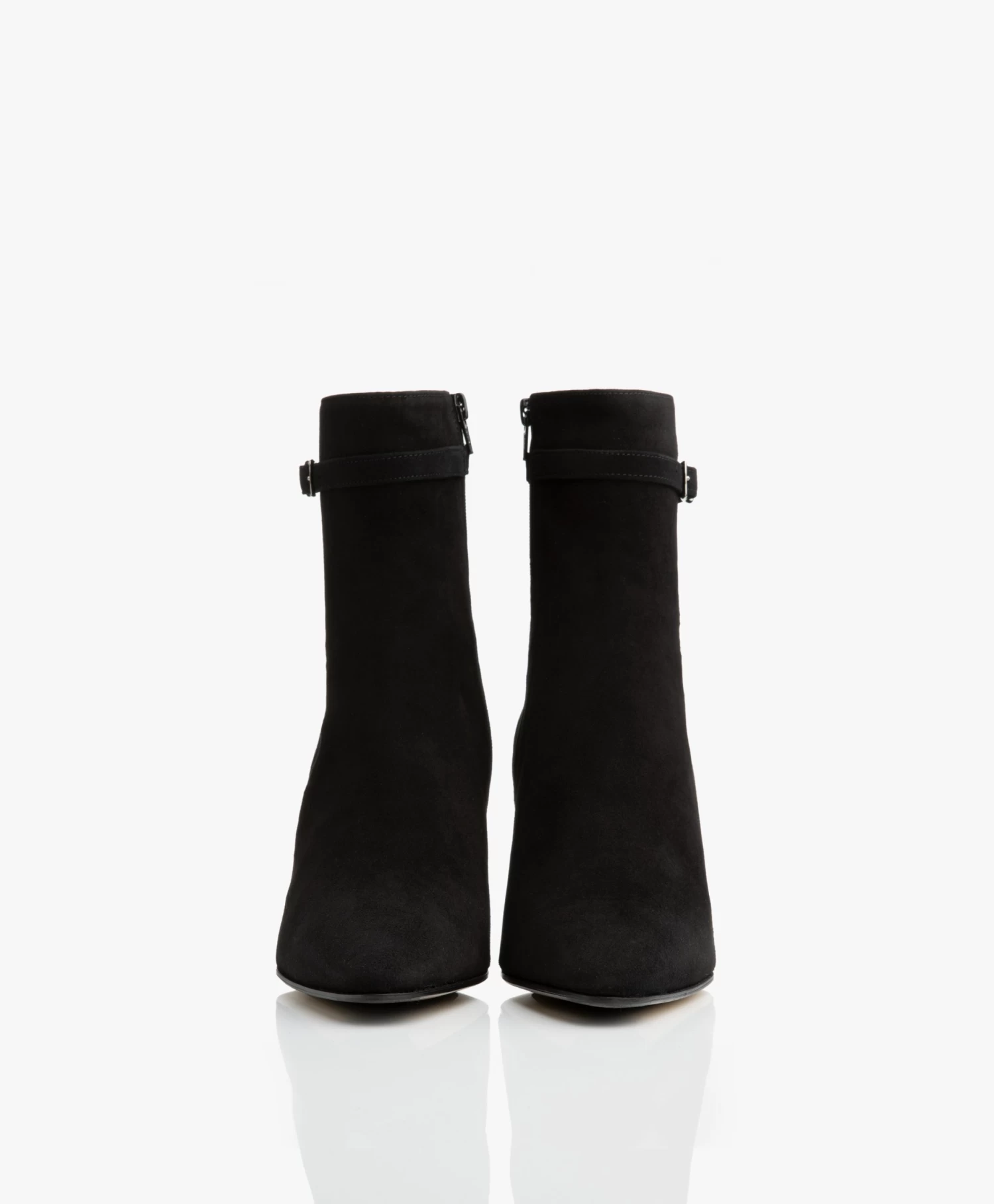 Deze stijlvolle enkellaarzen van Panara zijn uitgevoerd in een zwarte, hoogwaardige suède kwaliteit. Ontworpen met een decoratief gespbandje, een met suède bekleedde middelhoge hak, een elegante schachthoogte en een puntige neus voor een vrouwelijke uitstraling. Door de ritssluiting aan de binnenkant zijn de laarzen gemakkelijk aan te trekken.