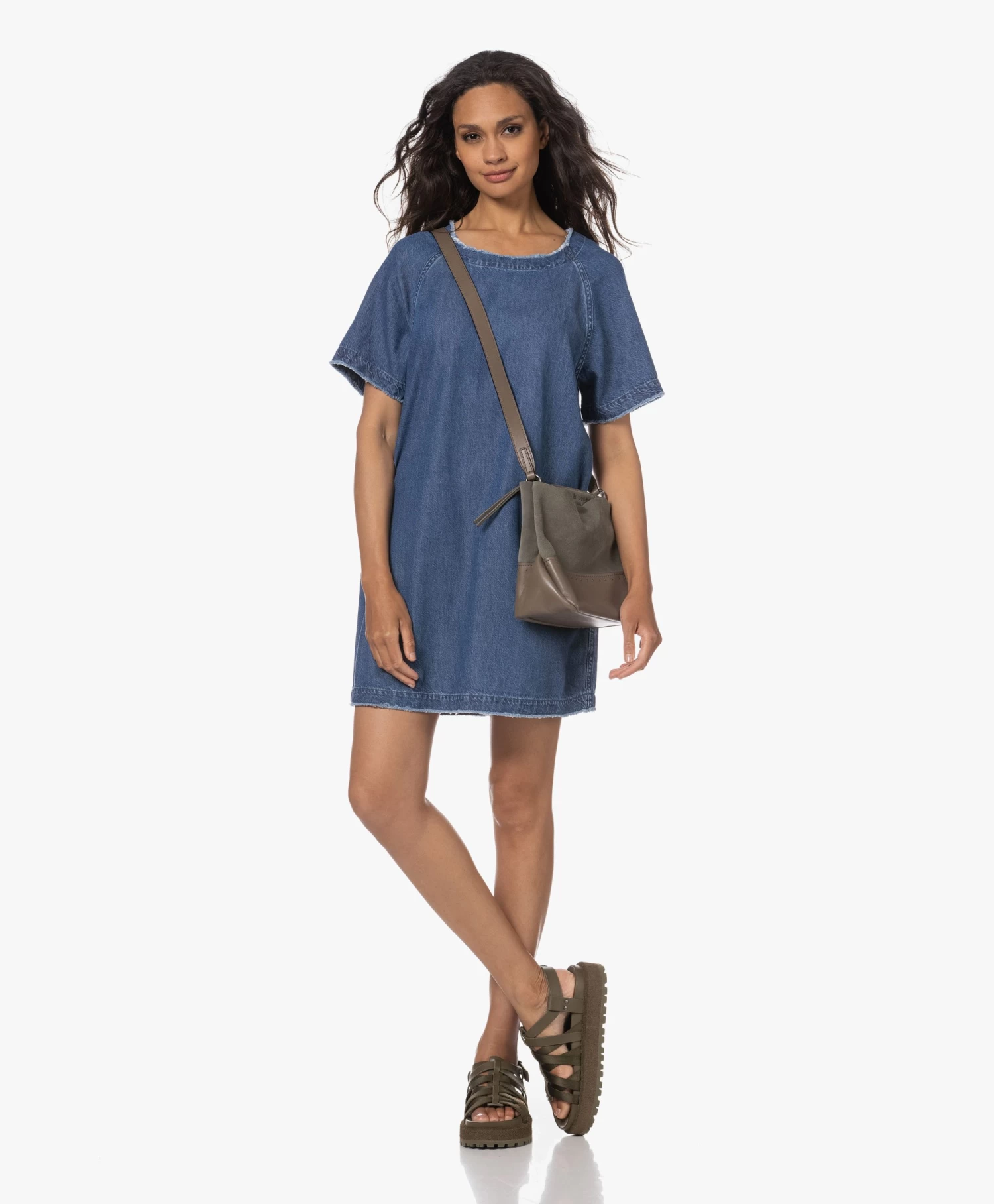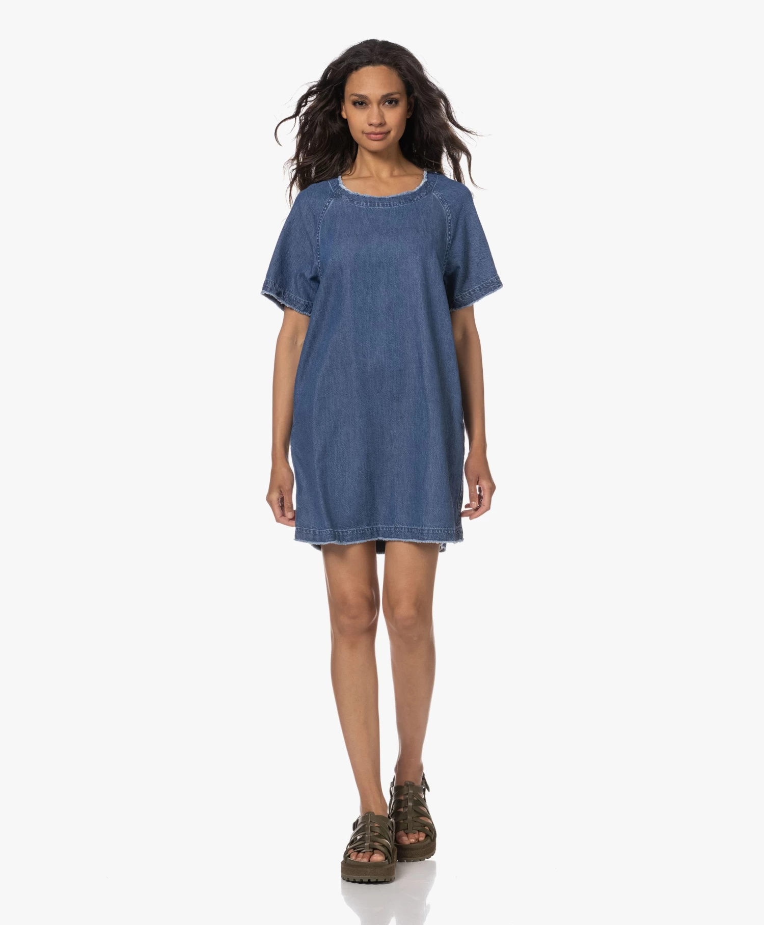 rag & bone is hét adres voor verrassende denim. Zoals de middenblauwe Justine denimjurk, een optisch rechte mini-jurk van extreem soepele en lichtgewicht denim in een blend van katoen en refibra, een op lyocell lijkende duurzame textielvezel. Met gerafelde randafwerkingen en een zichtbare ritssluiting op de rug straalt het ontwerp een en al relaxte vibes uit.