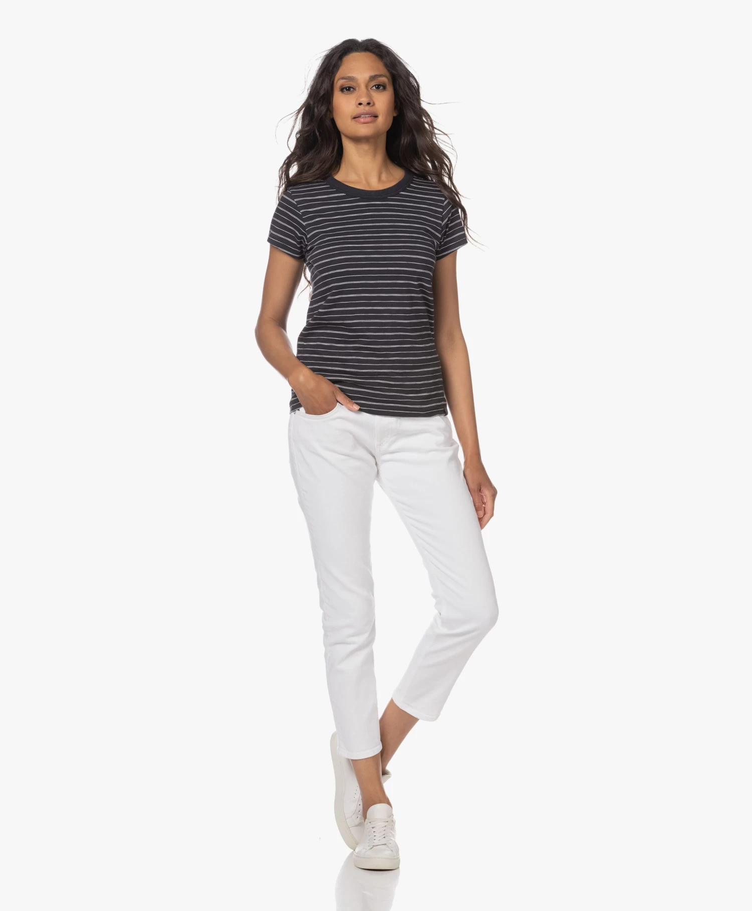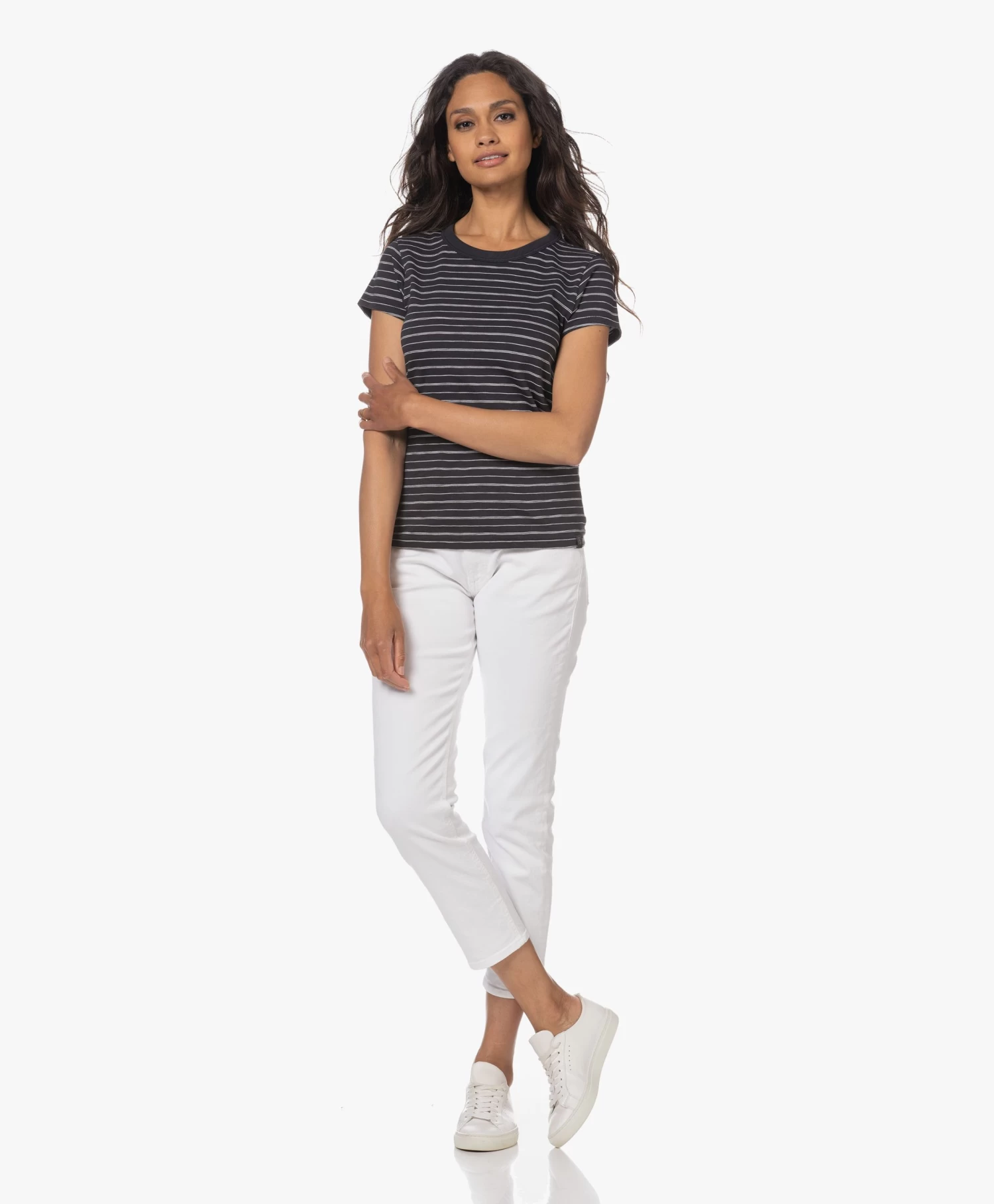 Je bent nergens zonder een goede basis.Het zwarte The Slub Stripe T-shirt van Rag & Bone toont een streepdessin in wit, dat zorgt voor een speels samenspel met de comfortabele slub-jersey kwaliteit van biologisch Pima katoen. Deze katoensoort staat bekend als één van de sterkste en zachtste katoensoorten die er bestaat en zorgt daarmee, samen met de slouchy aangesloten pasvorm, voor een tijdloze en veelzijdige stijl waar je jarenlang plezier van hebt.Â