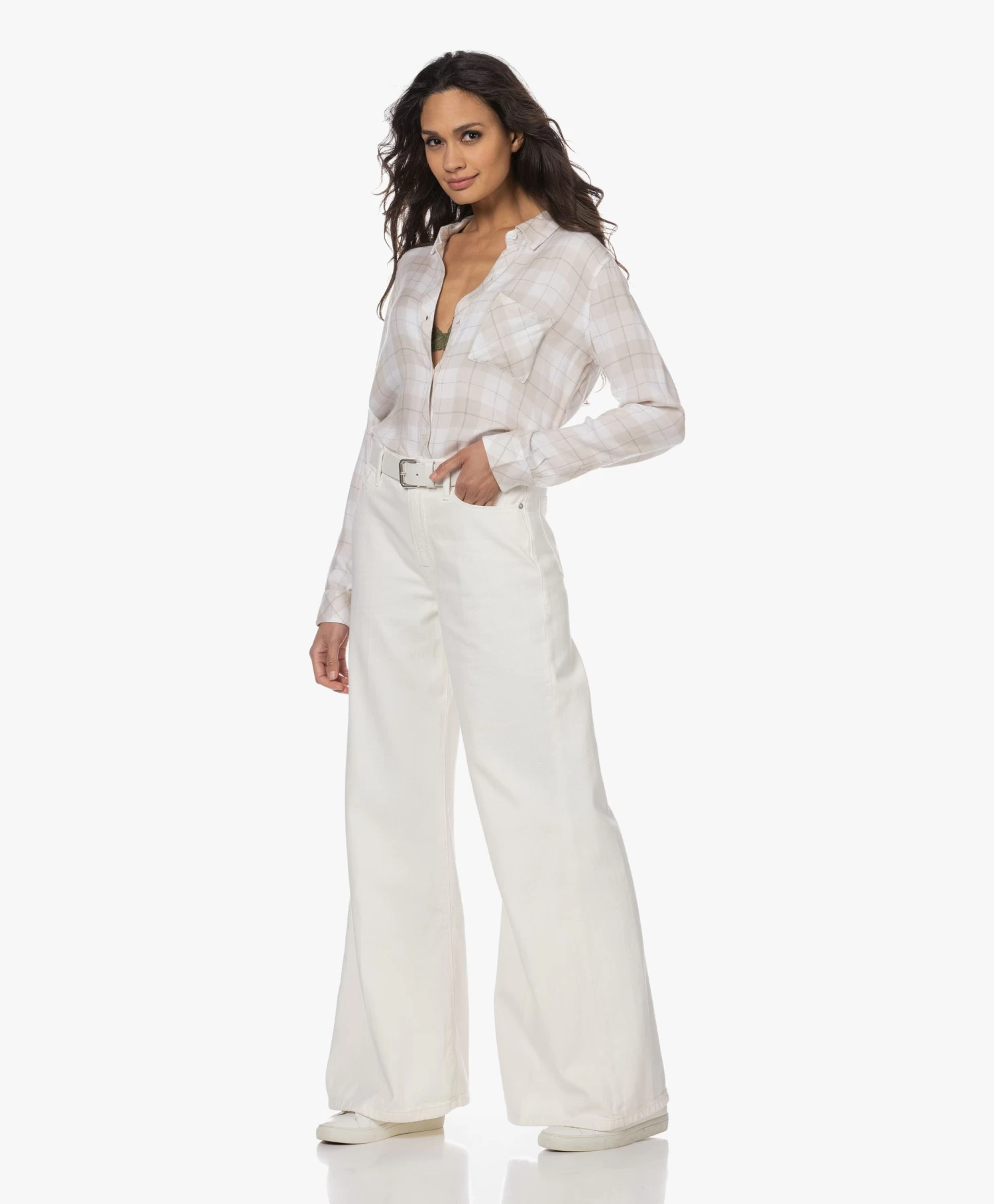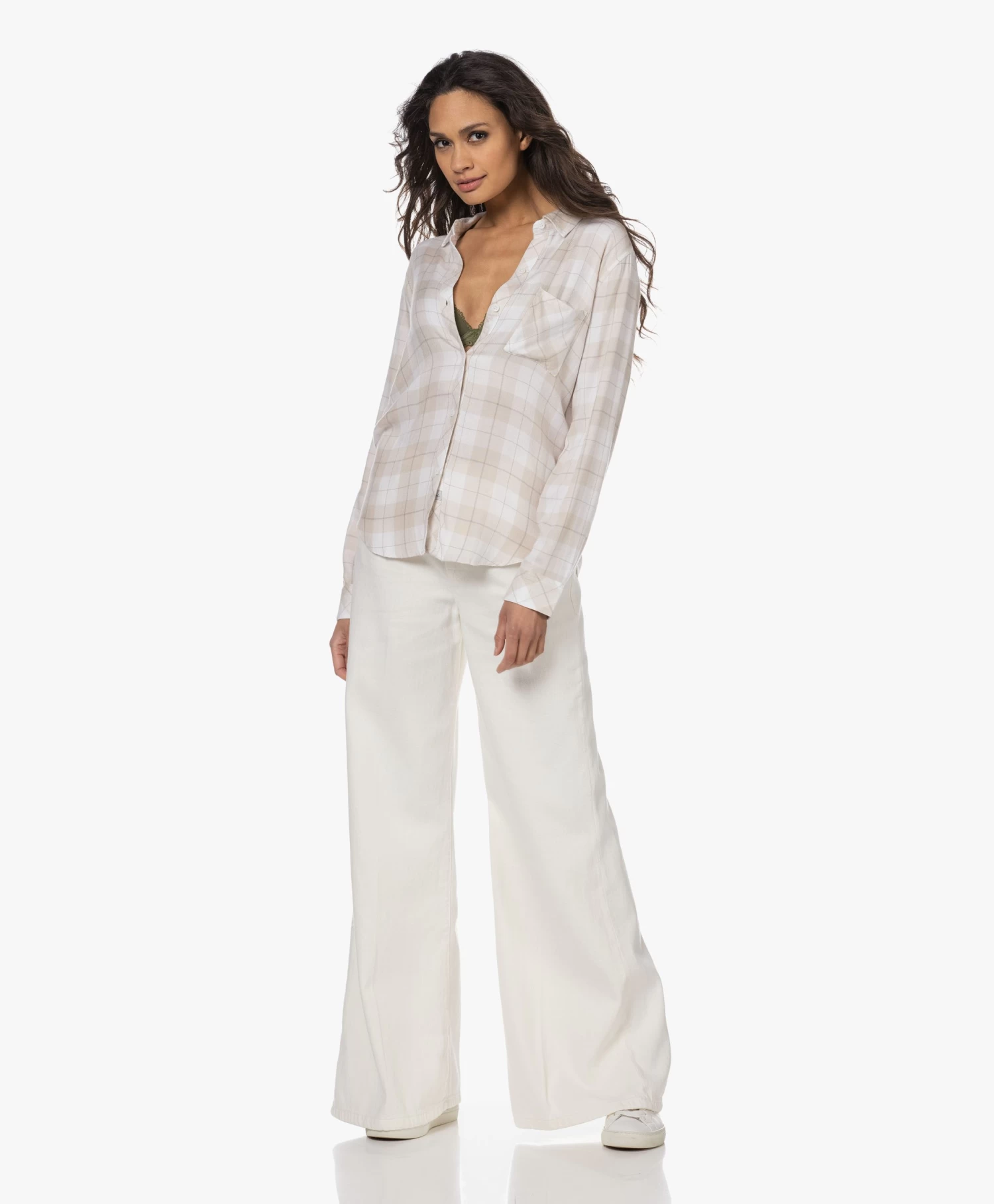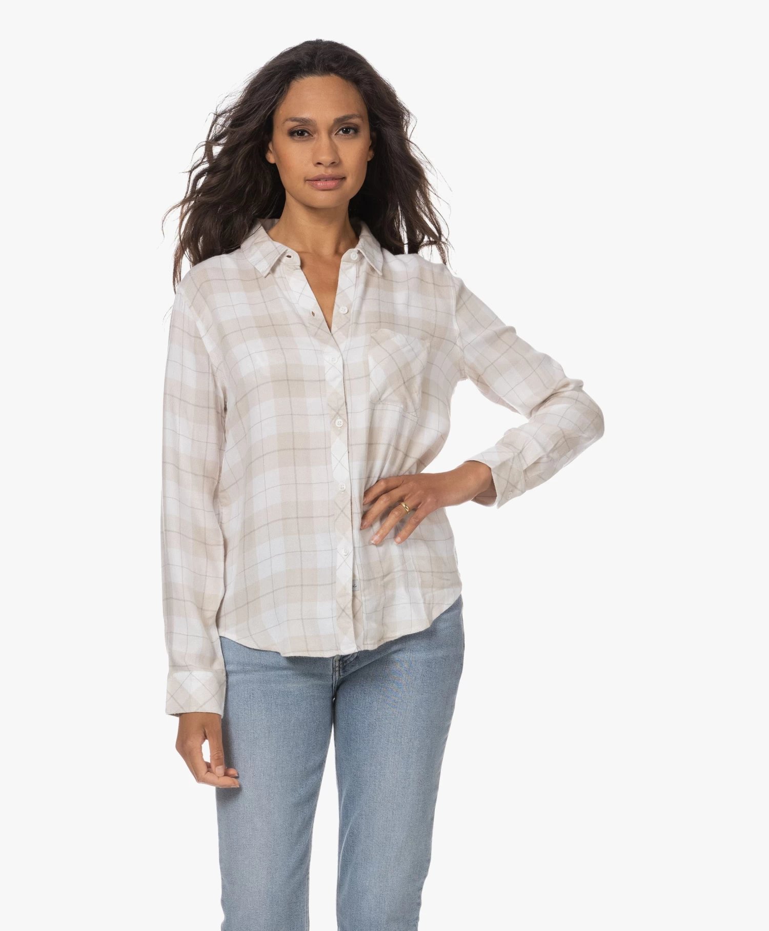 Overhemdblouse Hunter van Rails is gemaakt van een zachte, soepelvallende viscosekwaliteit in een herringbone weefsel met een ruitdessin in een frisse combinatie van off-white, beige en lichtgrijs. Door de zachtheid van de stof draag je dit relaxed-fit item zowel casual óver als girly Ãn de tailleband van je broek of rok.