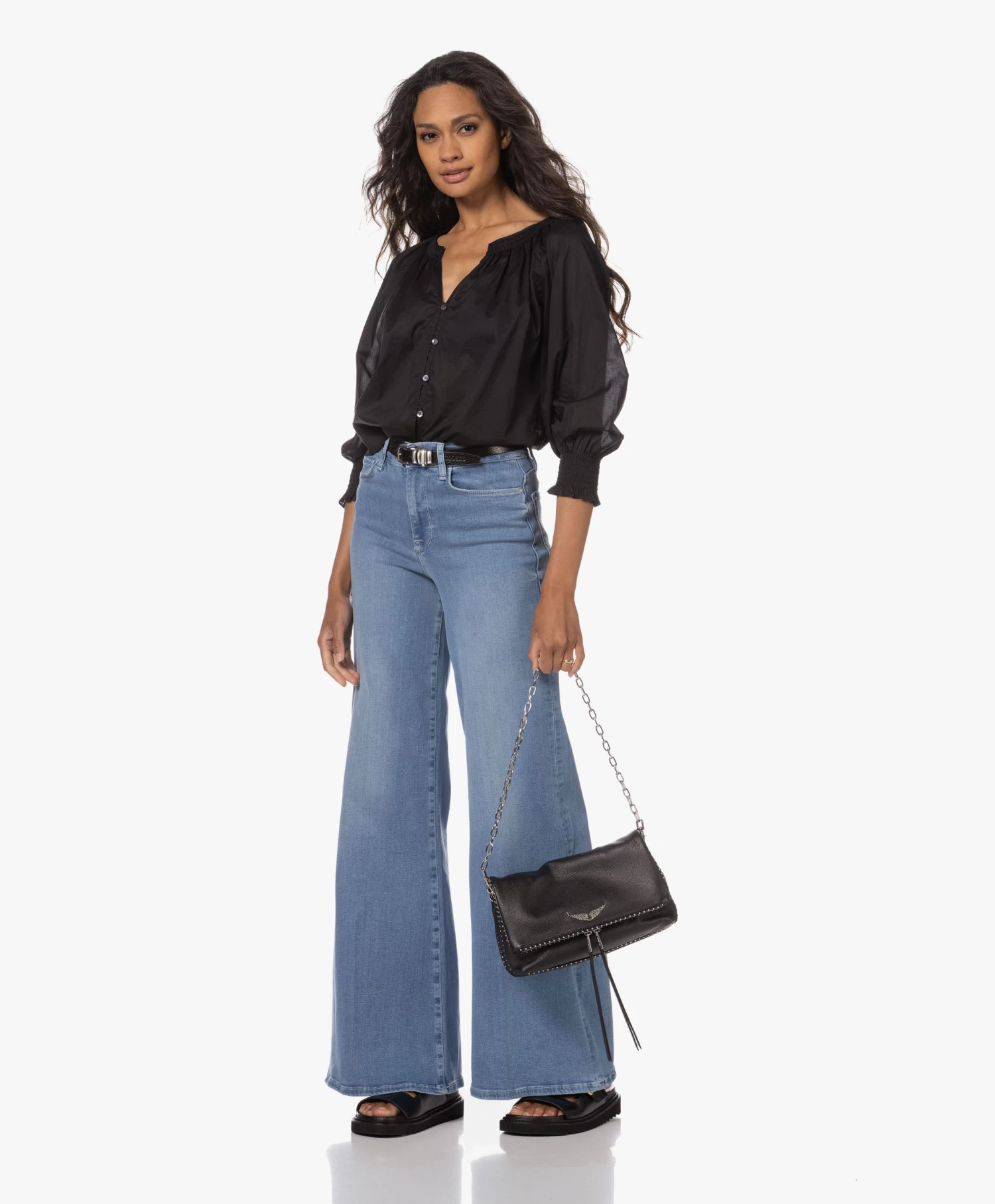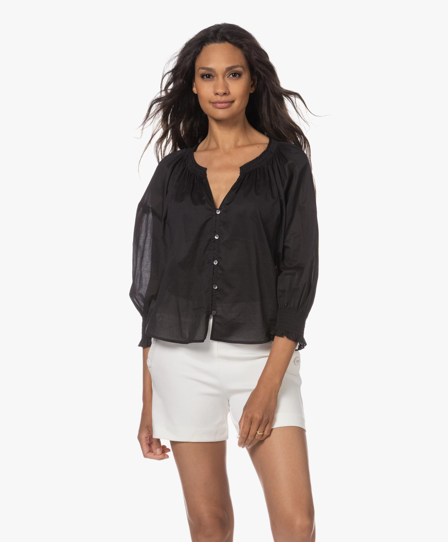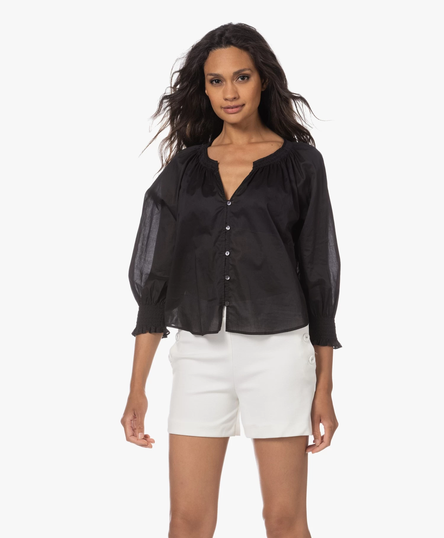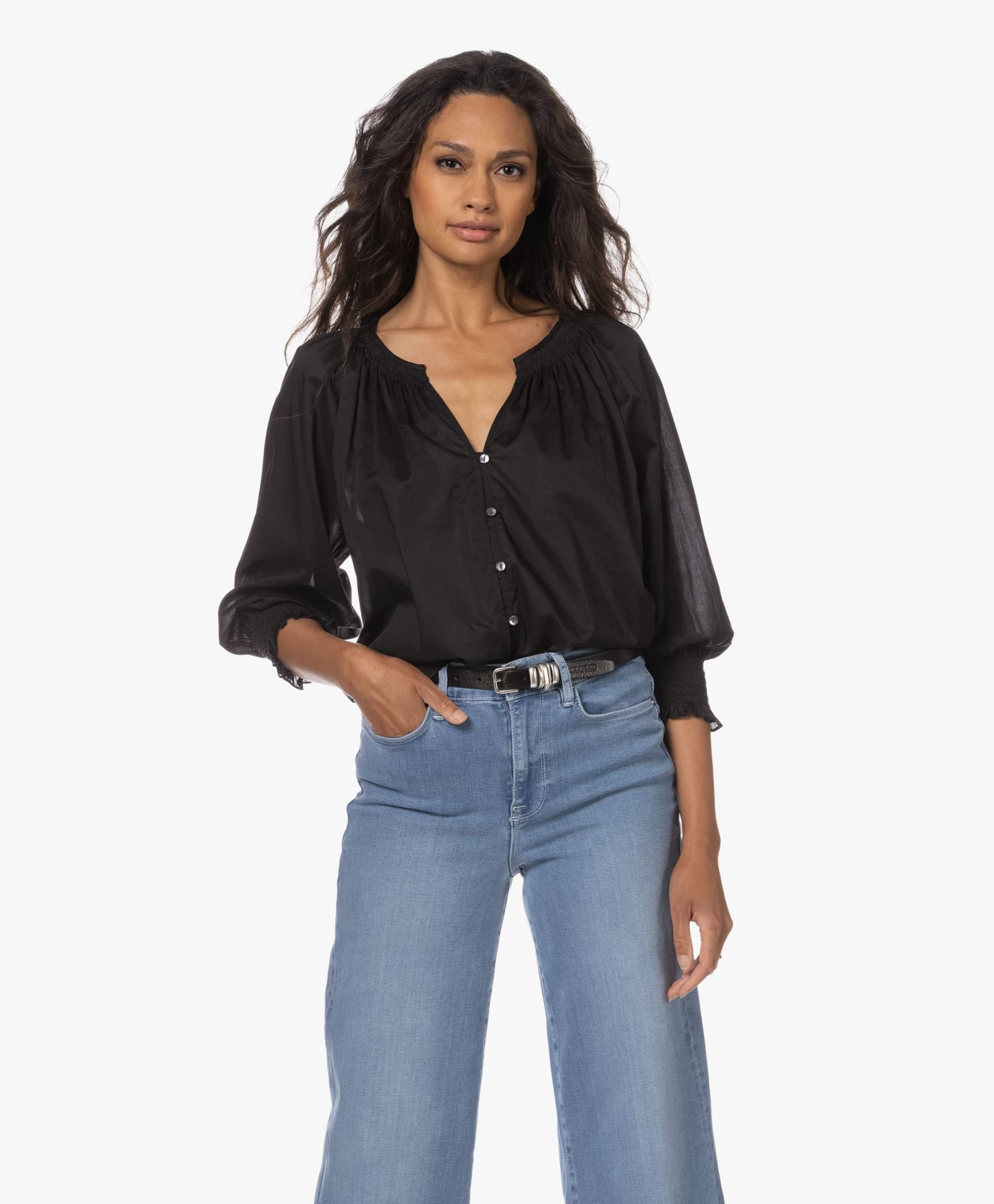 Voeg wat vrouwelijke flair toe aan je outfit met deze zwarte Mariah blouse van Rails. De gesmokte details bij de halslijn, manchetten en de relaxte pasvorm maken deze blouse een winnaar. Gemaakt van een lichtgewicht katoenen batist wat luchtig draagt en losjes om het lichaam heen valt.