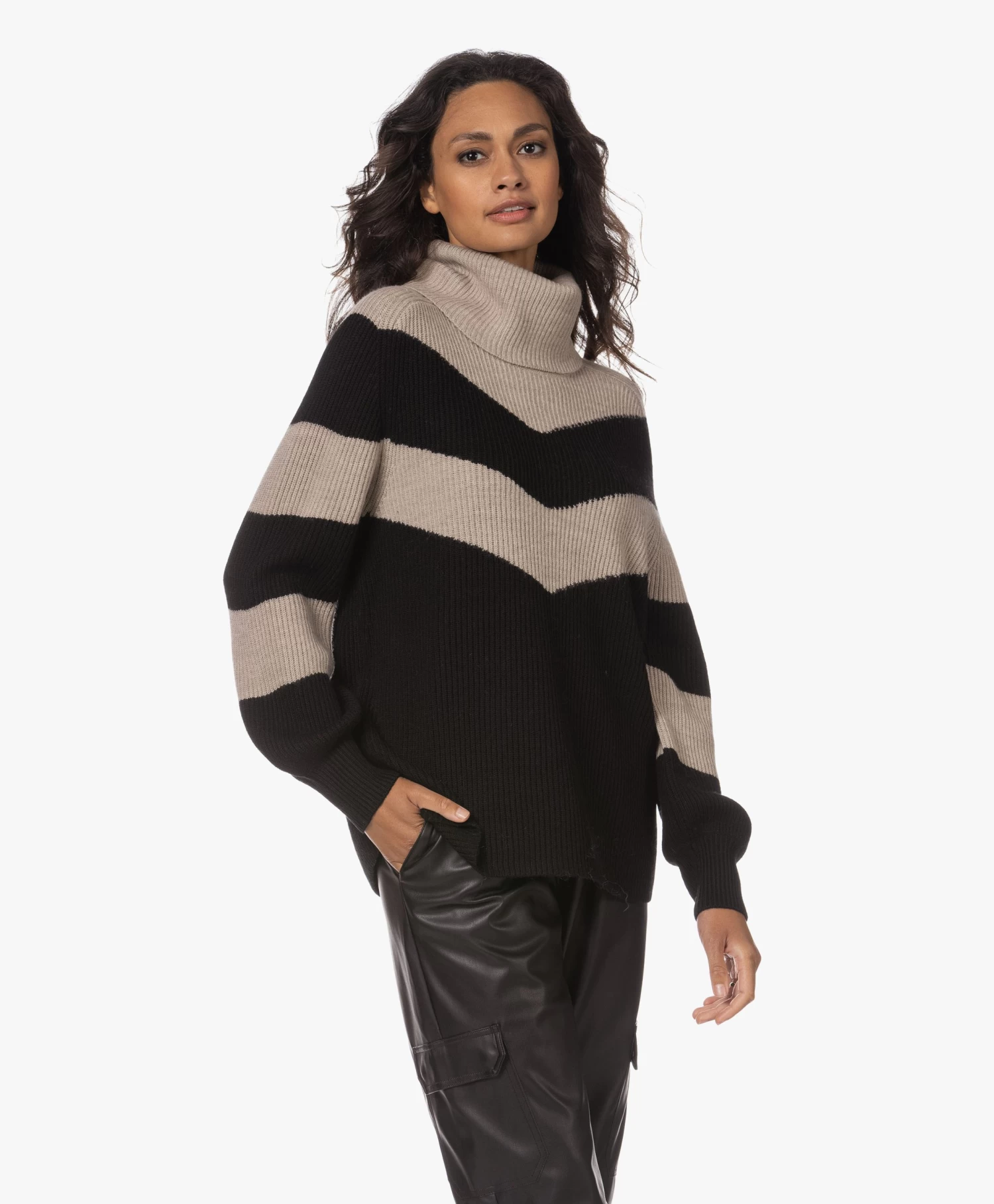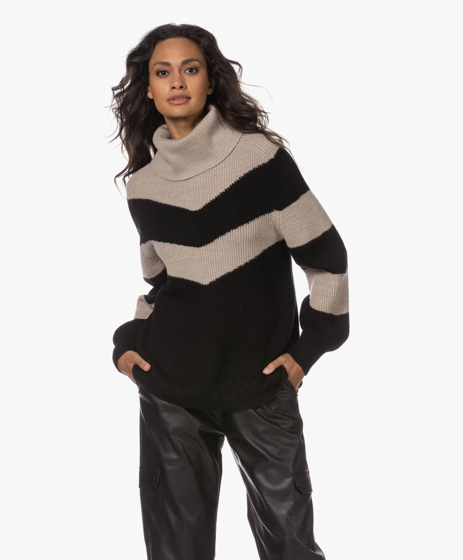 Net even anders dan een standaard streep, dezelfde tijdloze overtuigingskracht. De V-vormige zwarte en zandkleurige intarsia-vlakken máken deze merinowollen coltrui van Repeat. Ontworpen in een rechte relaxte pasvorm met omgeslagen col en licht poffende raglanmouwen.