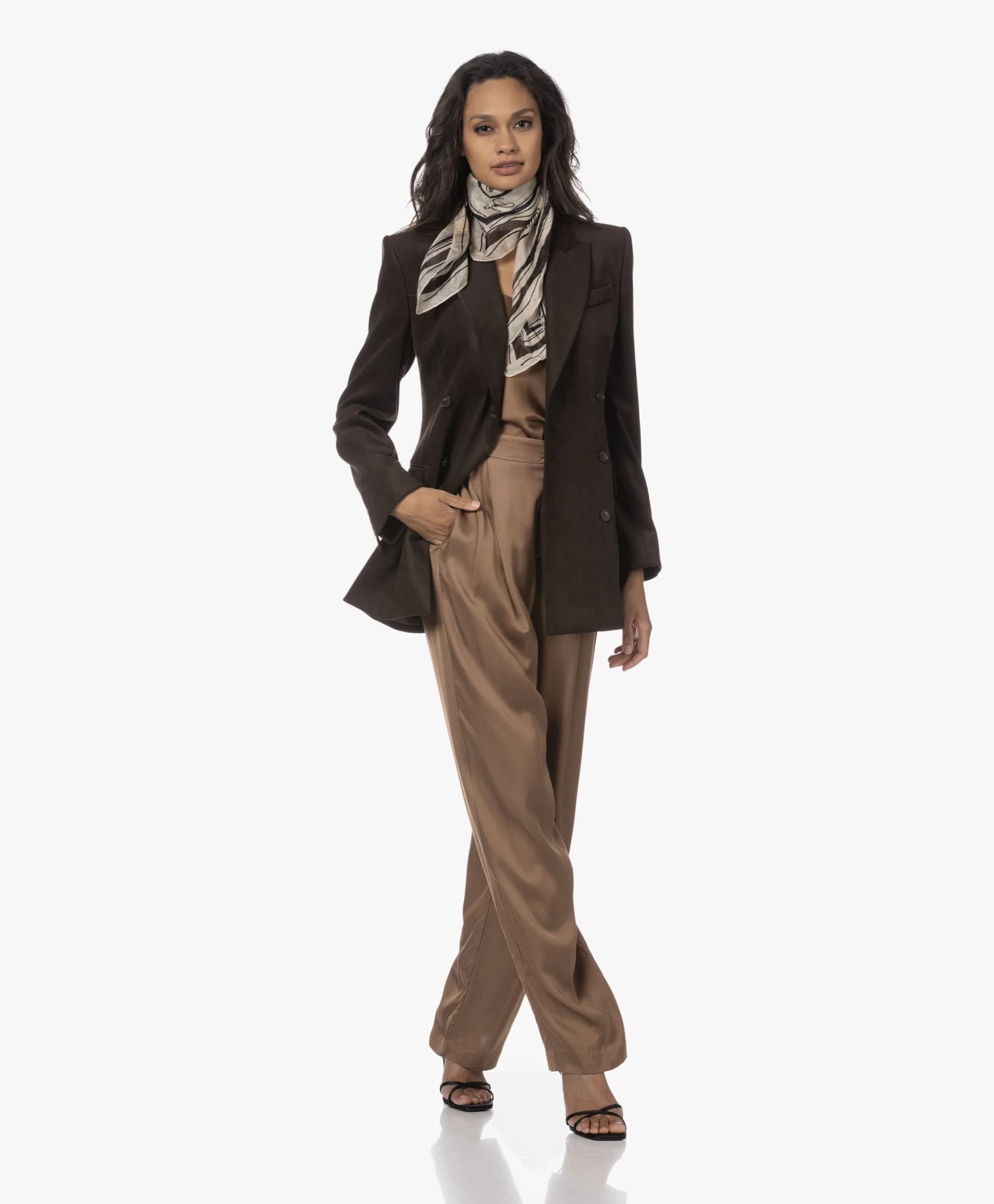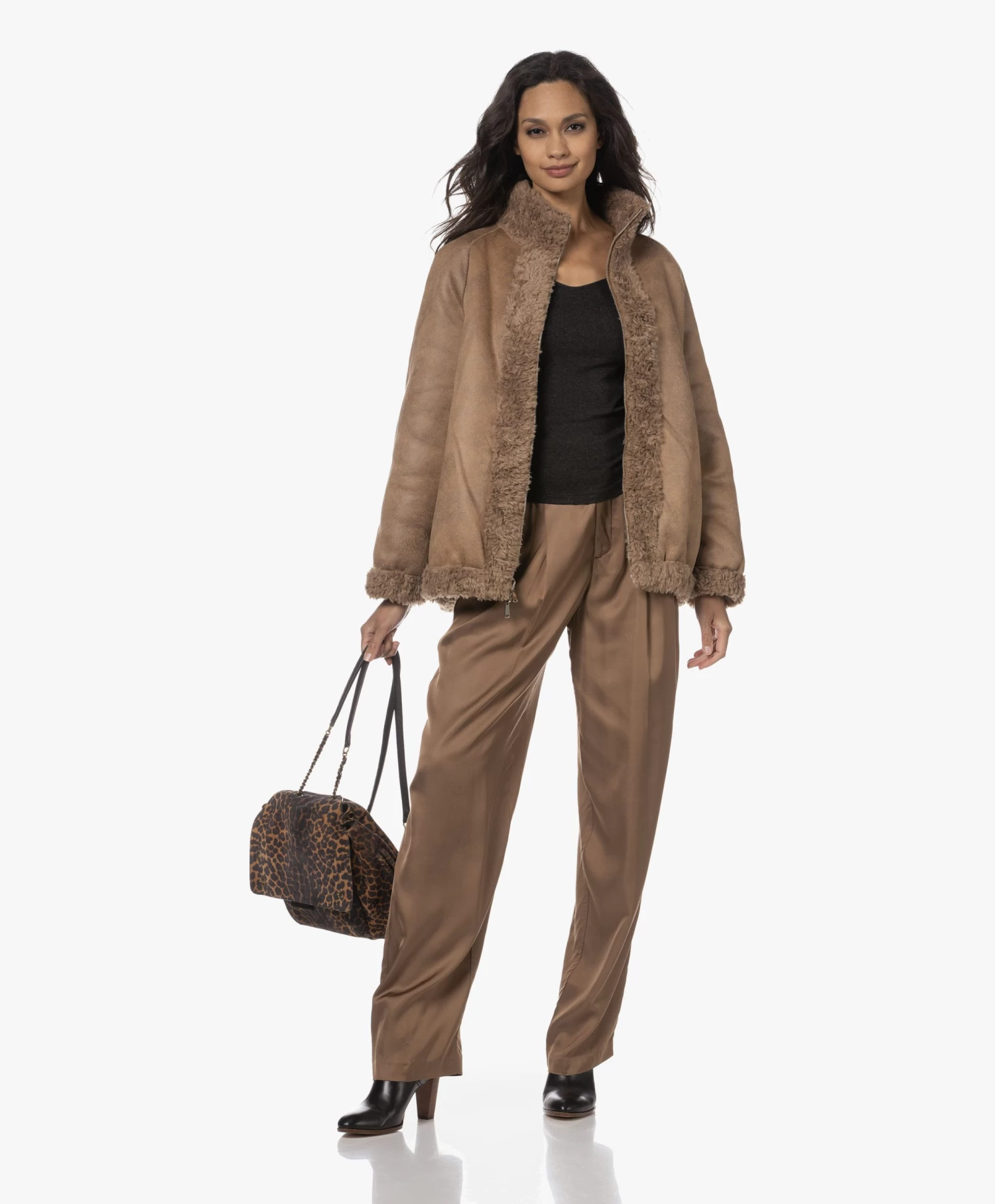 Oh la la, très chic: deze camelbruine Fico pantalon van Resort Finest. De verhoogde taille, wijde pijpen met bandplooien en de soepele viscose satijnkwaliteit leveren een silhouet dat vrijwel iedereen flatteert. Tip: ben je geen fan van een hoge taille, koop dan een maat groter en draag de broek op de heup.