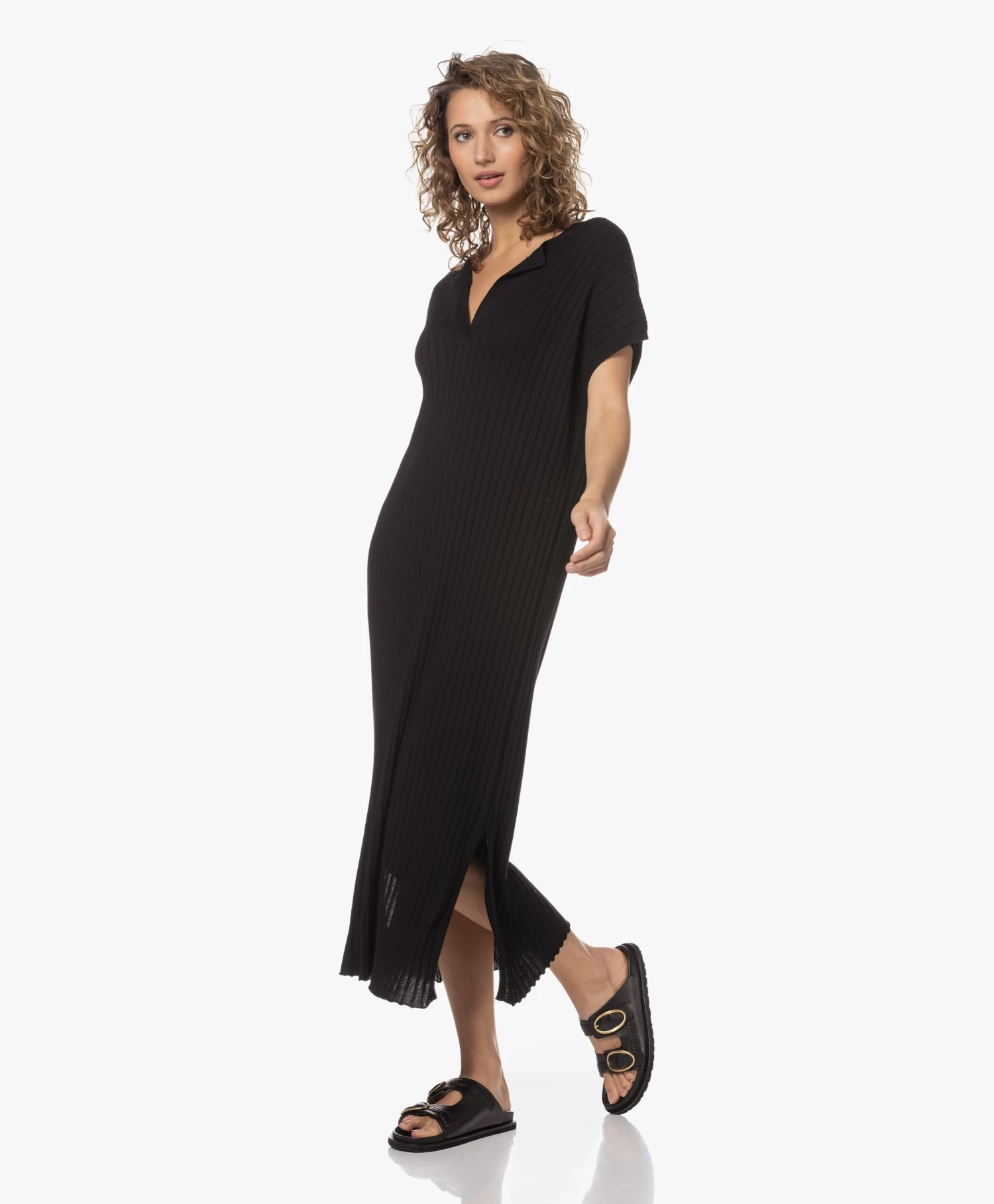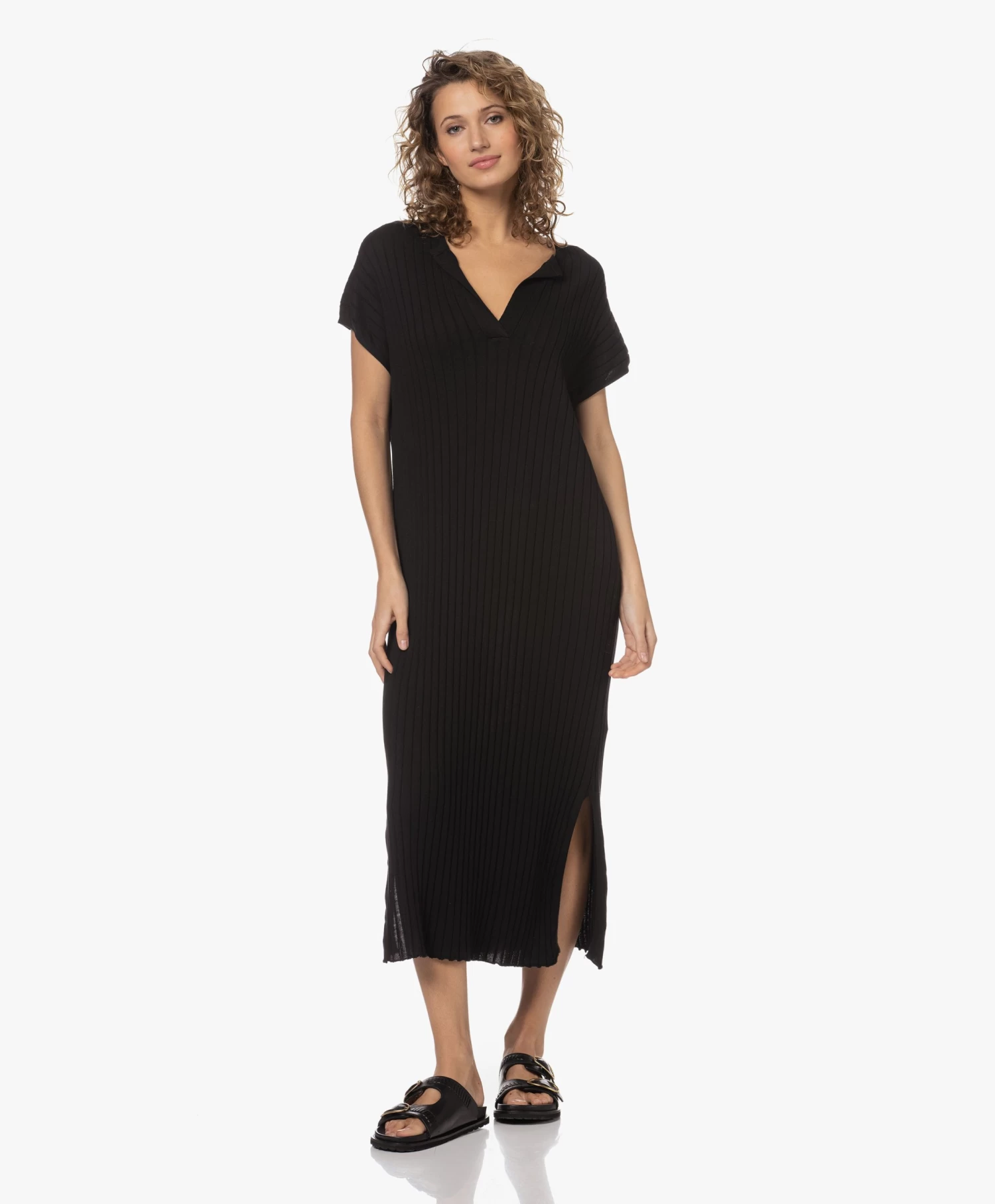 Wat worden we toch blij van de luxe, maar wel altijd relaxte essentials van Resort Finest. Ook deze kuitlange zwarte jurk is weer zo’n pareltje, fijngebreid van zacht katoengaren. Het brede ribbreisel valt slank en sluik – de diepe halssplit en hoge zijsplitten geven het silhouet een vrouwelijke finishing touch. Draag er op koelere dagen een longsleeve onder.