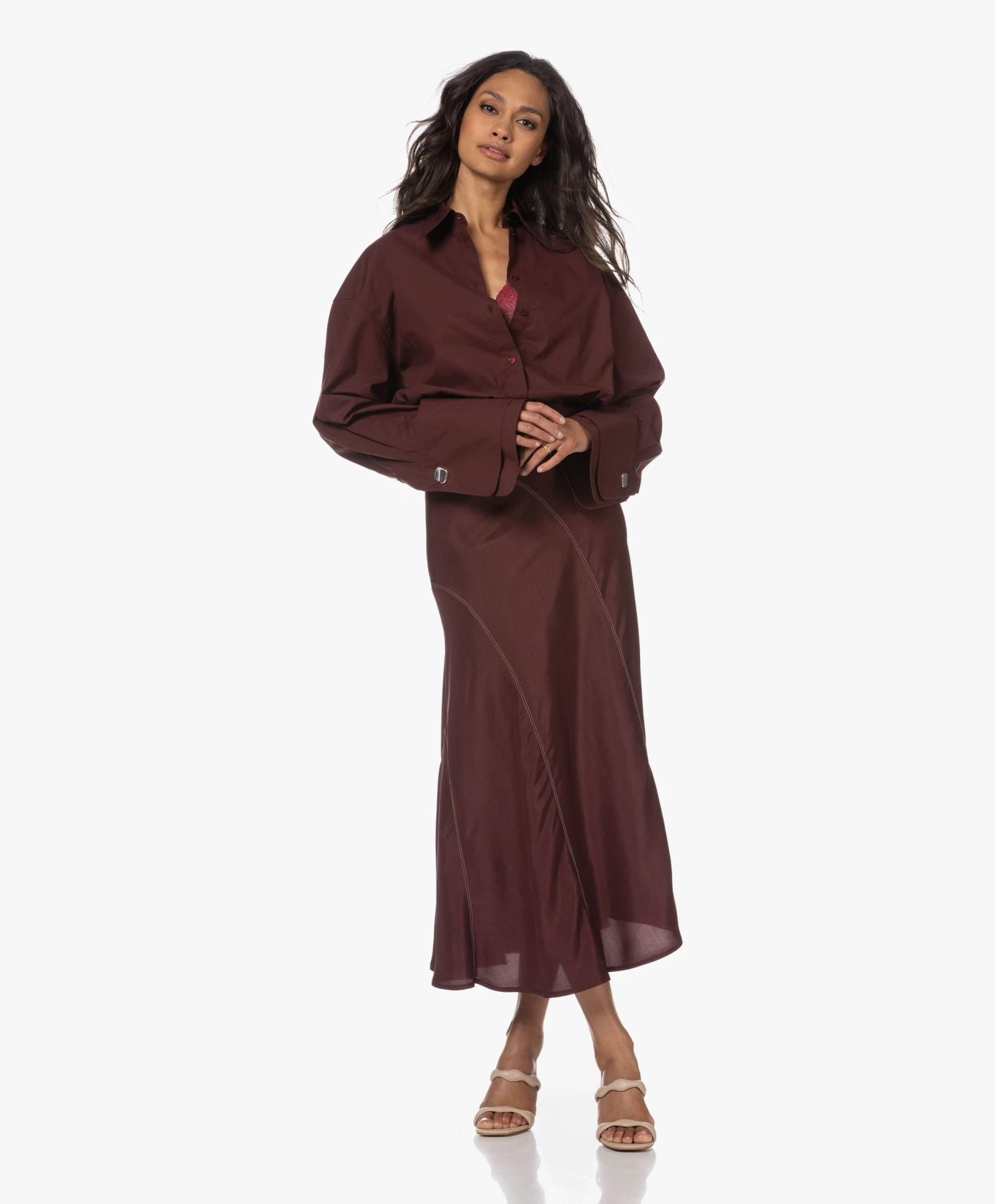 Wat een elegant silhouet: lang en sluik met een onverwachte werveling bij de zoom. Róhe’s bordeauxrode midi-rok van subtiel glanzend acetaat is geconstrueerd uit schuine banen, de naden zijn doorgestikt met off-white garen. Chic met een edge, gemaakt voor eigenzinnige looks.