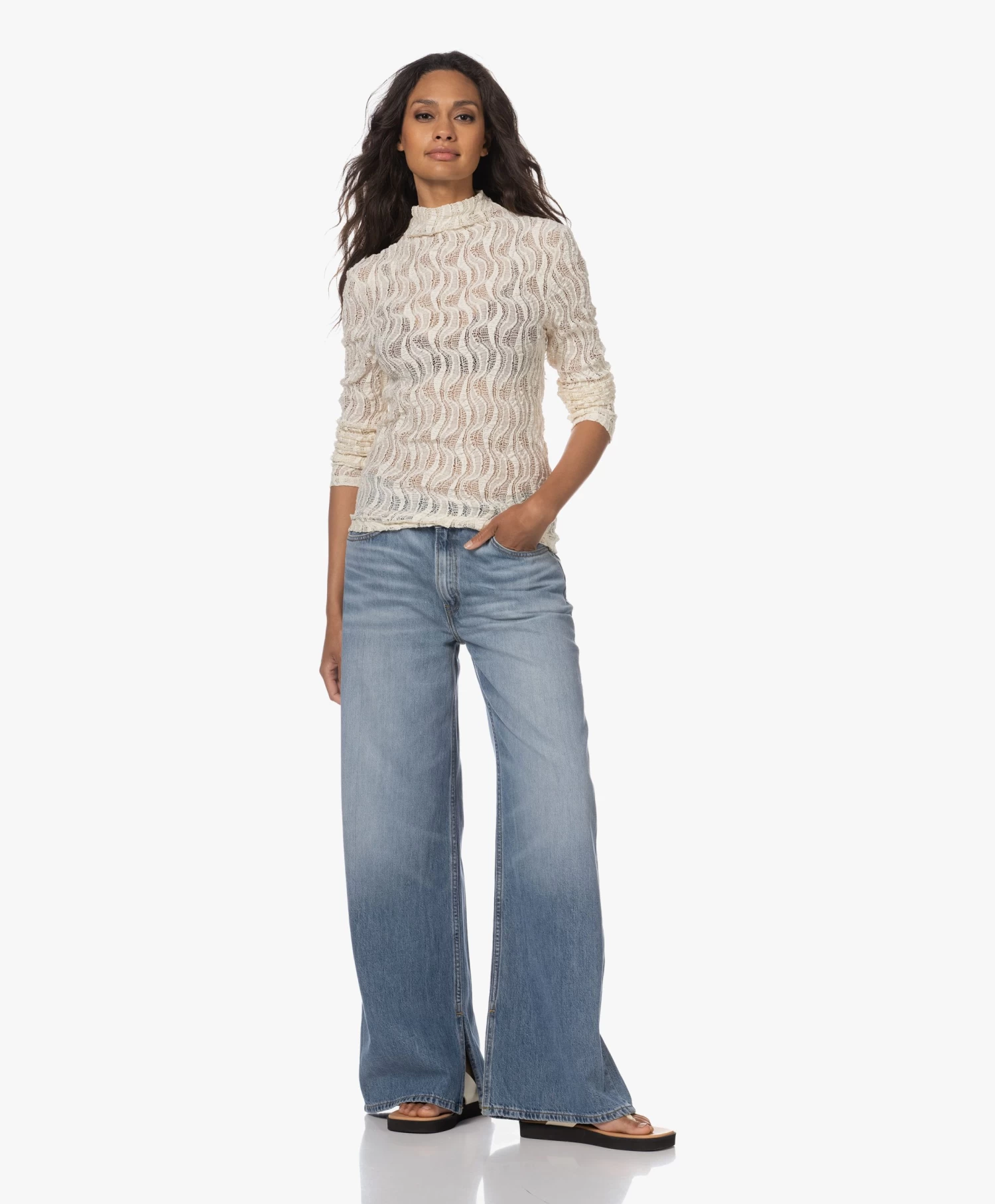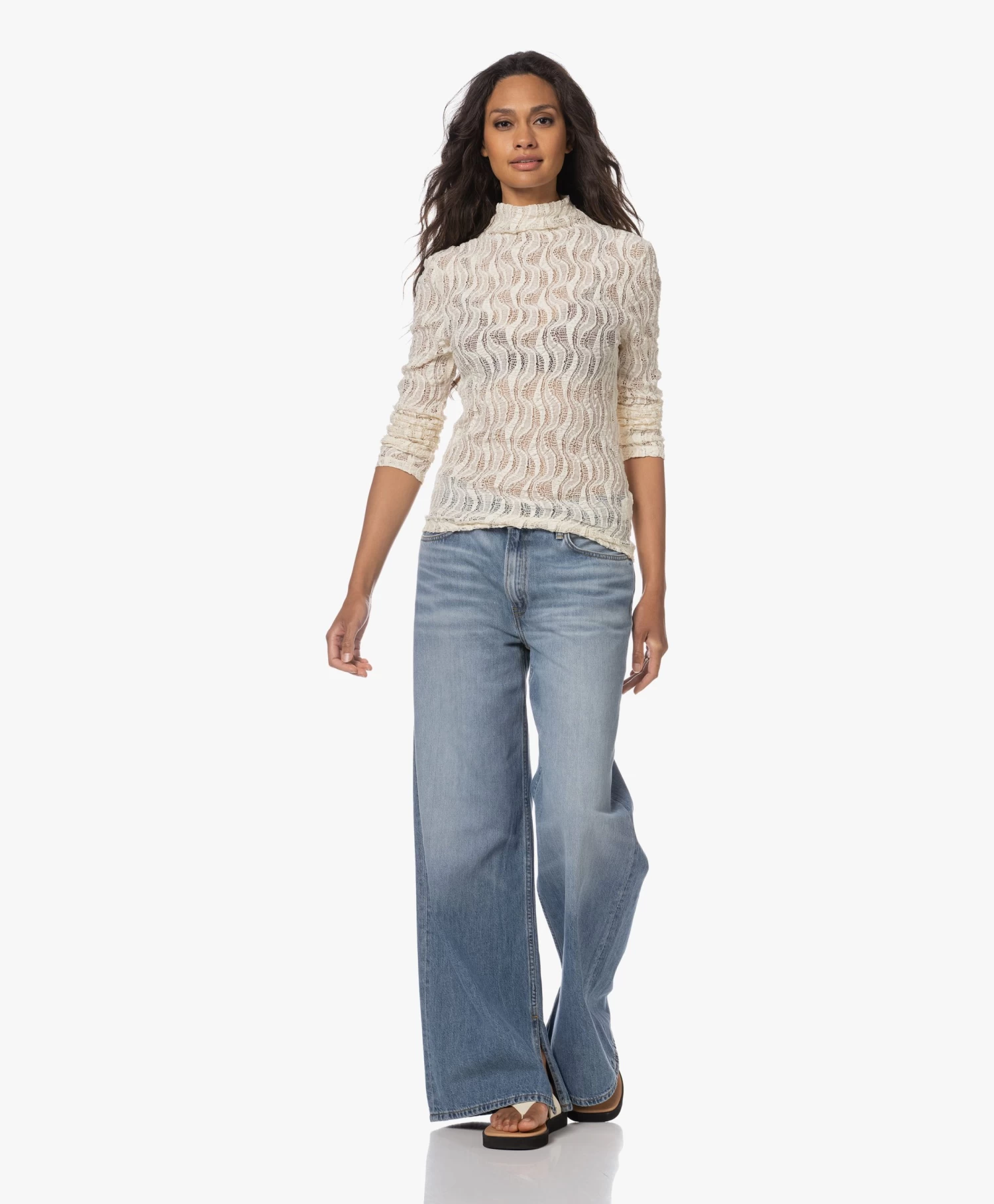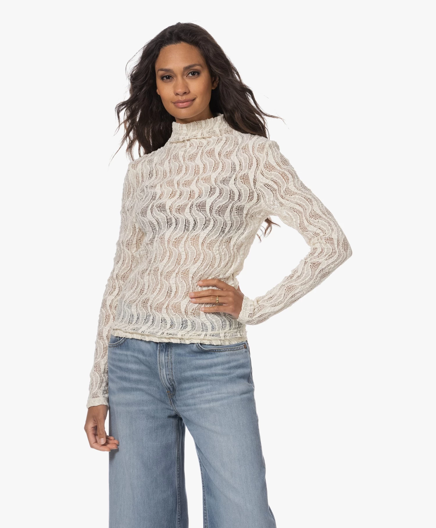 Het crèmekleurig stretch-kant van Róhe’s longsleeve oogt vrouwelijk en elegant – het aangesloten ontwerp met hoge col is een tikkeltje edgy. Een sterke combi waarmee je eindeloos kunt variëren én experimenten. Onder een chique blazer, op een casual 5-pocket… Gemaakt van matte, ‘vol’ aanvoelend katoenmix stretch-kant.