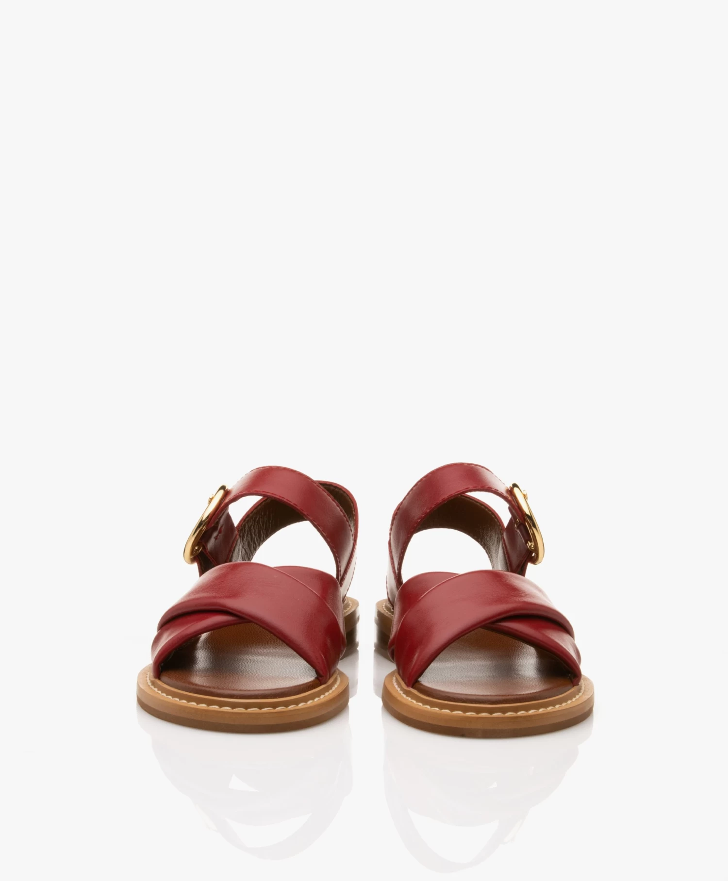 De grote, ronde goudkleurige gespsluiting met embossed merklogo kenmerkt deze Lyna sandalen van See by Chloé op iconische wijze. De sandalen stralen elegante en tijdloze allure uit, terwijl de gewatteerde, kruislingse banden over de wreef en stevige hak voor een hoog comfortgehalte zorgen. Het paar is vervaardigd van een gladde en soepele kalfsleerkwaliteit in donkerrood.