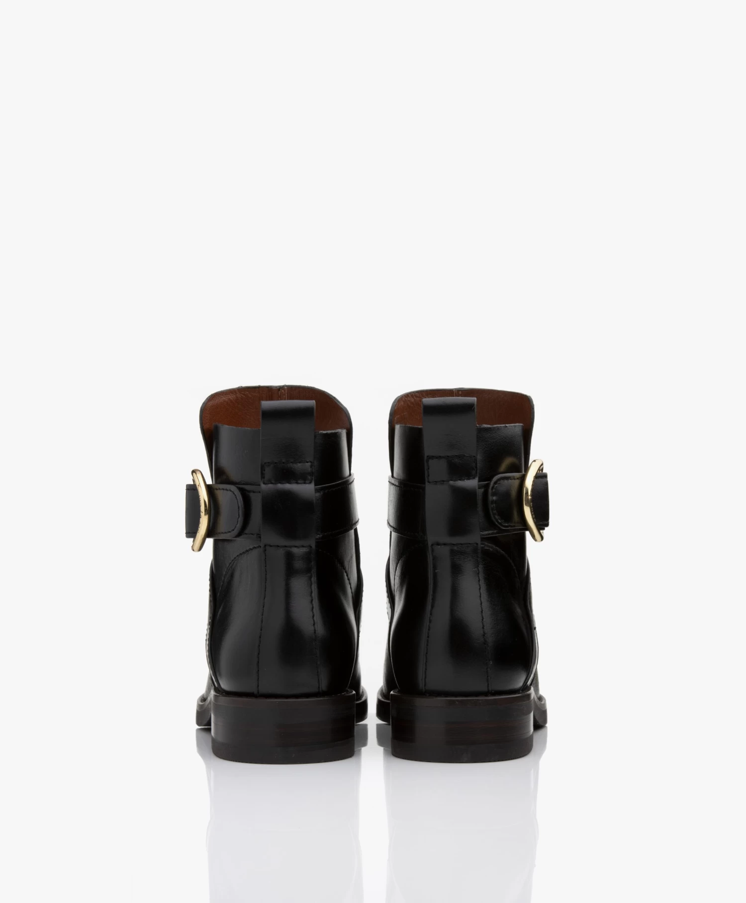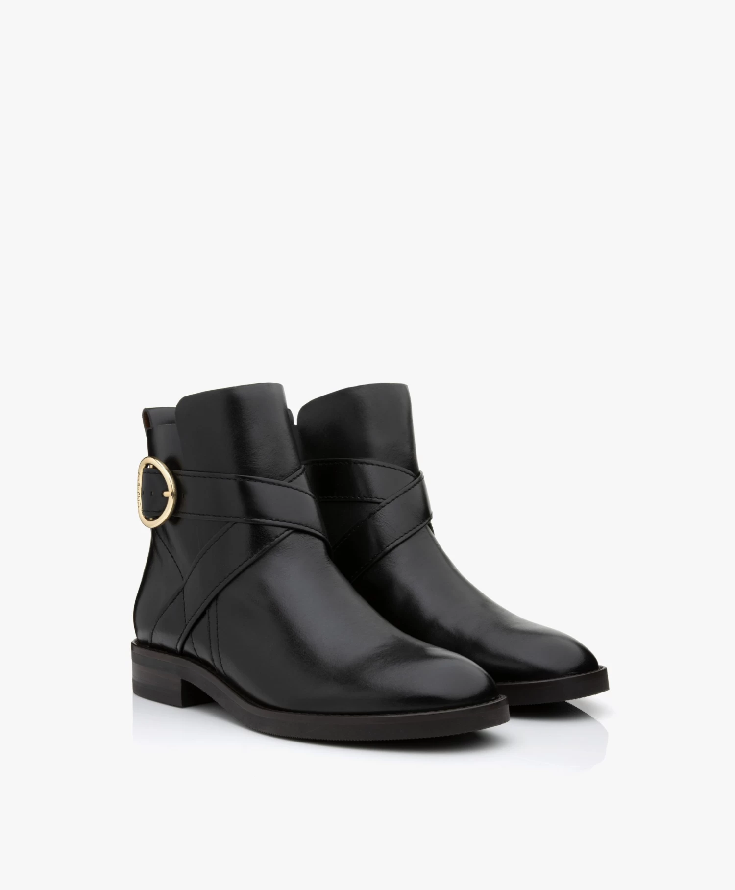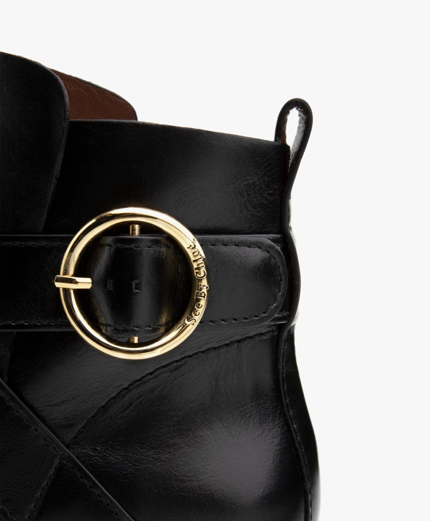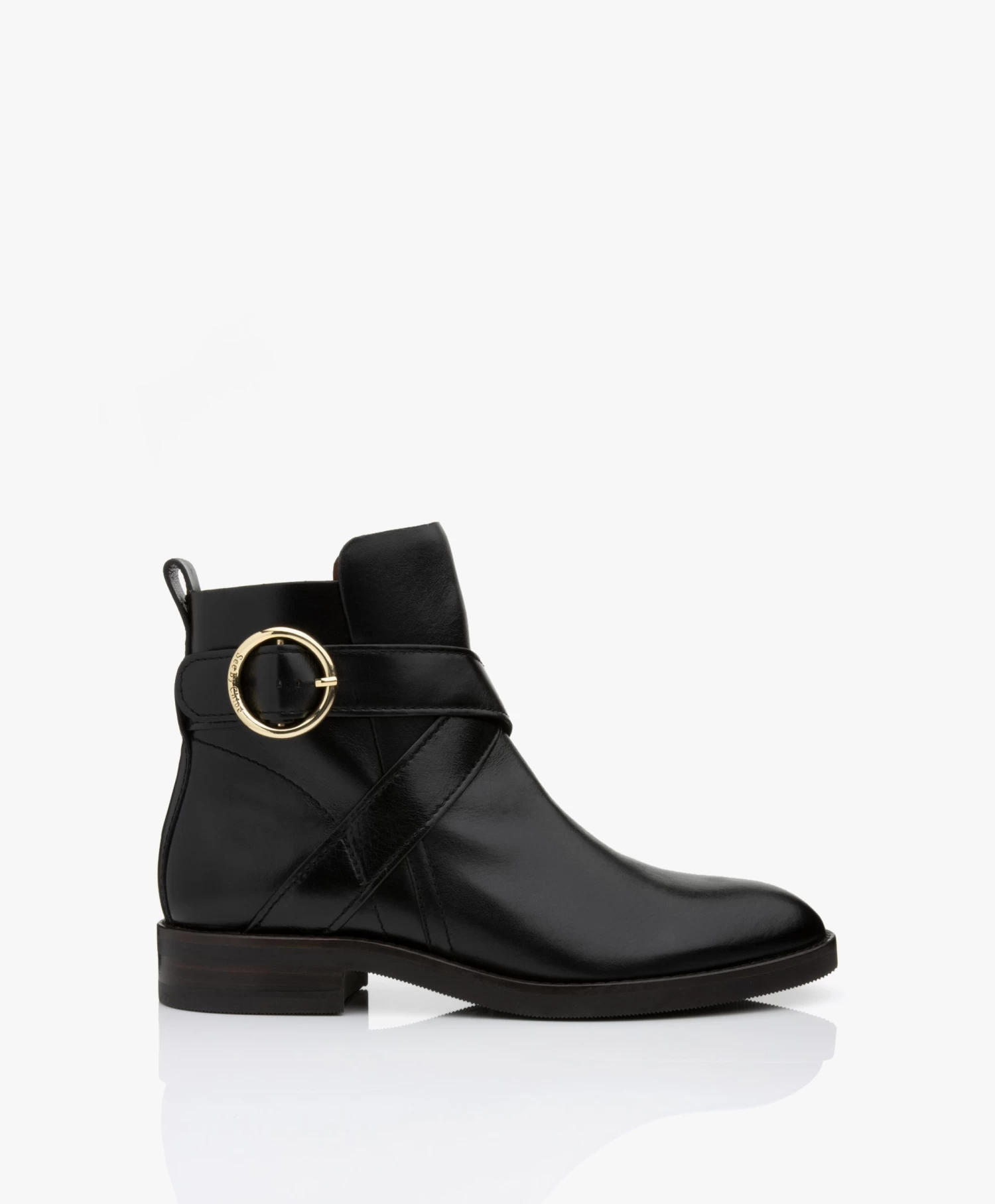 See by Chloé’s zwarte enkellaarzen Lyna zijn stijl-kameleons. De ronde neus, het gladde leer en de wikkelsluiting met goudkleurige gesp passen zich moeiteloos aan je outfit aan: combineer ze gerust met uiteenlopende items zoals jeans, chino’s of vrouwelijke rokken.