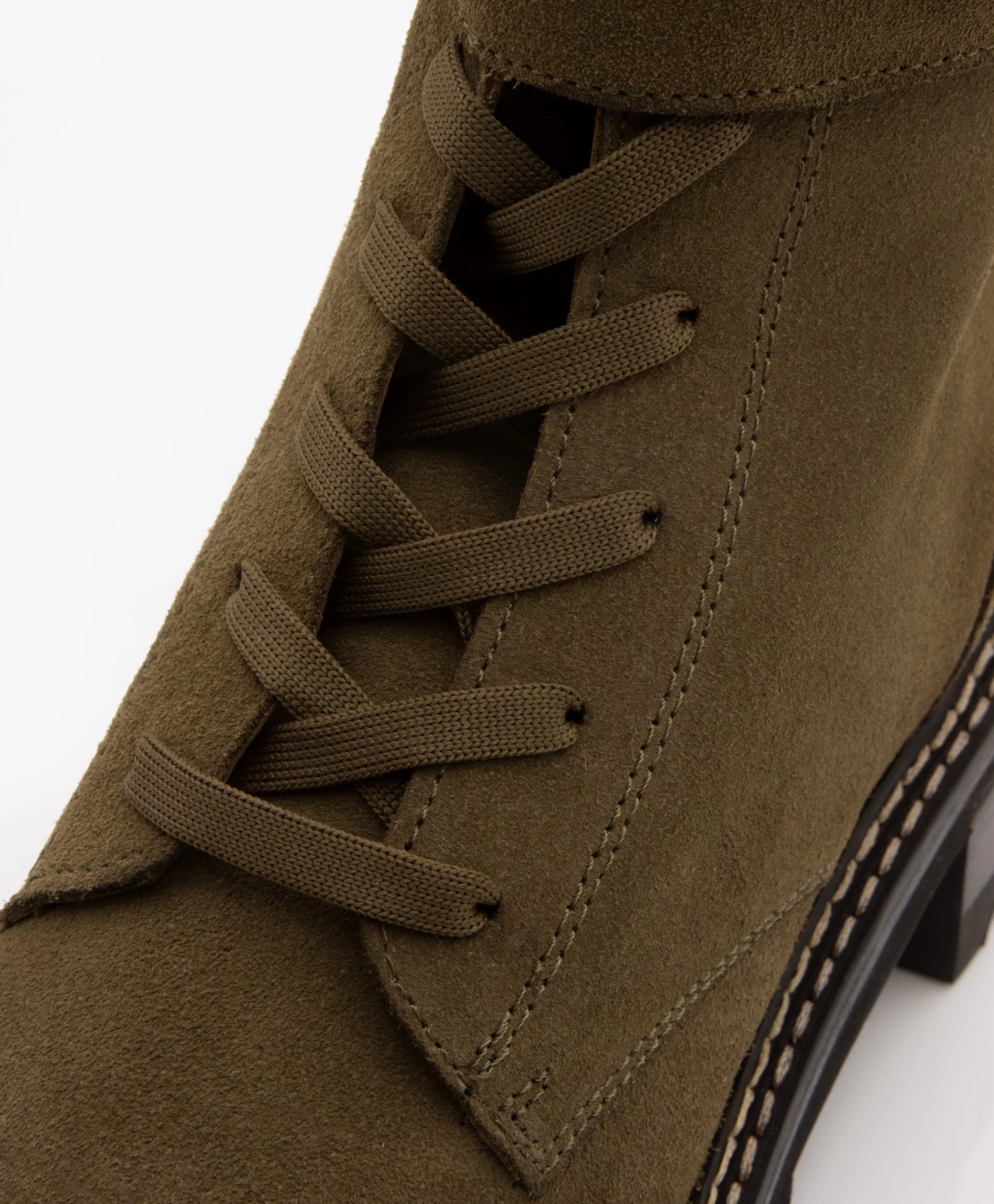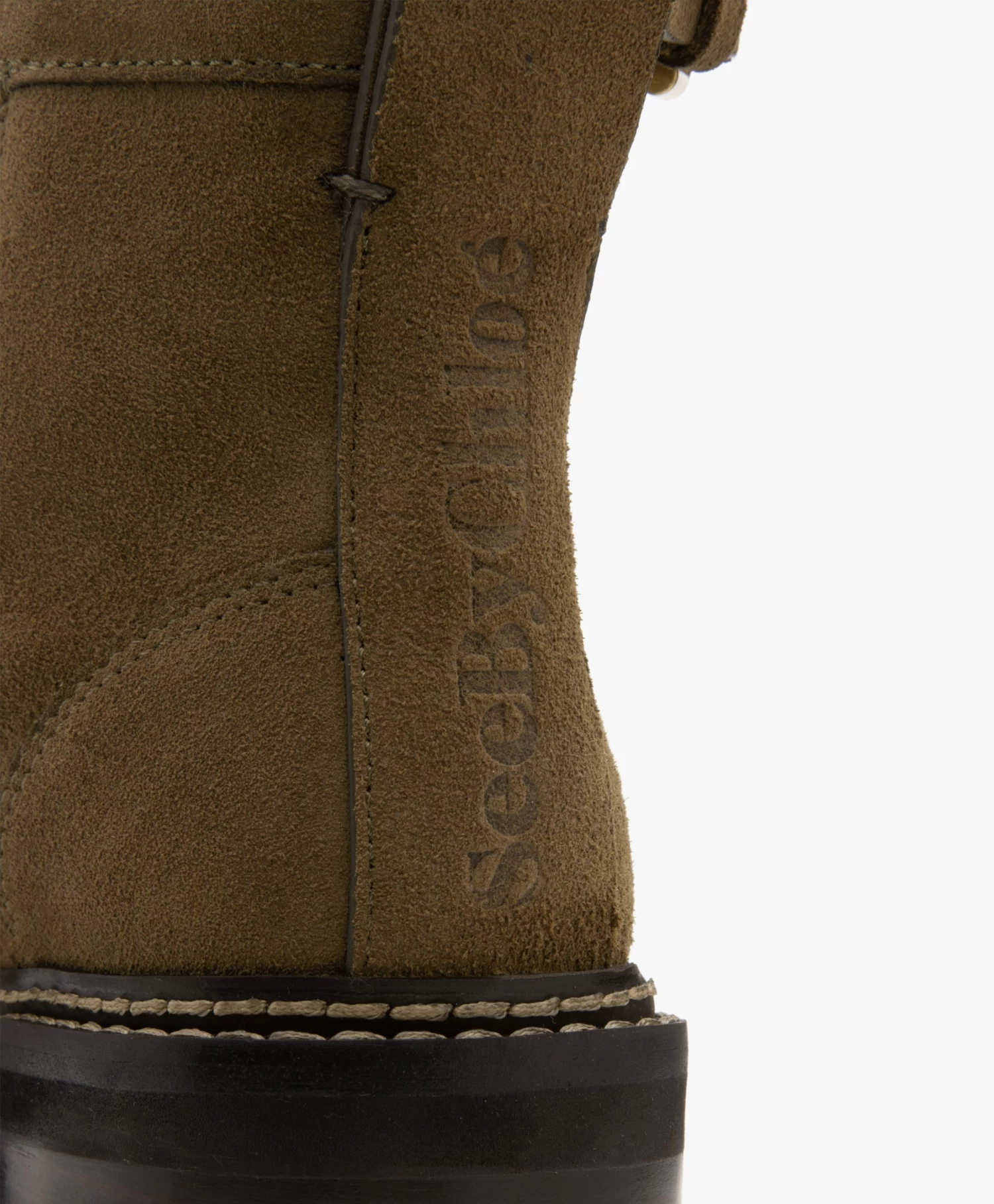 Hoe doet See by Chloé het toch? Ze weten hun signature stijl keer op keer te verwerken in tijdloze ontwerpen zonder de veelzijdige basis aan te tasten. Zo ook het geval bij deze Combat boots, gemaakt van olijfgroen suède leer. De goudkleurige hardware en grove ton-sur-ton stiksels zorgen voor de modieuze toevoeging terwijl de stevige doch soepele leerkwaliteit comfort biedt.
