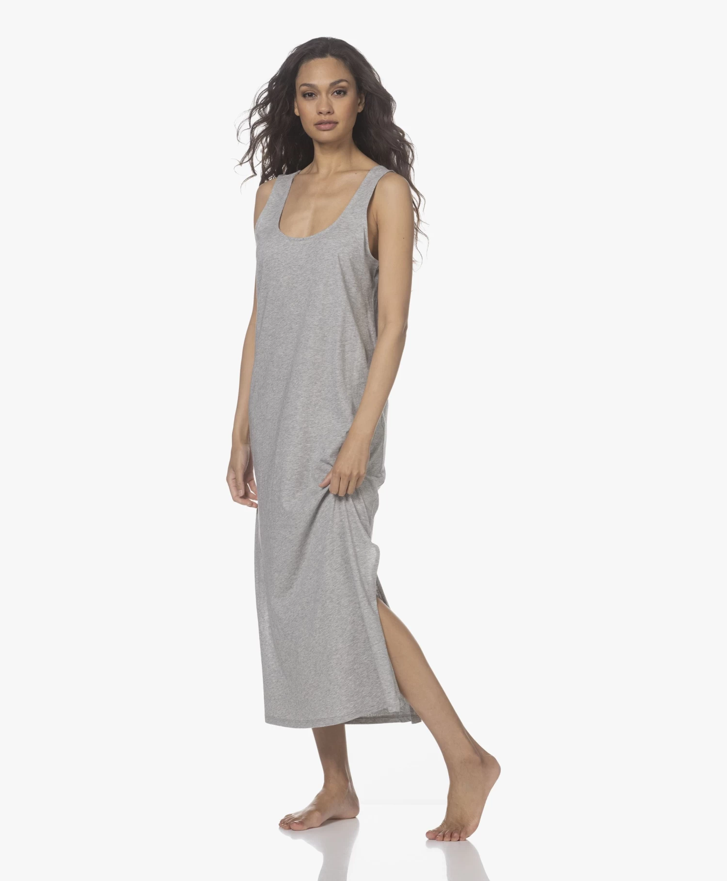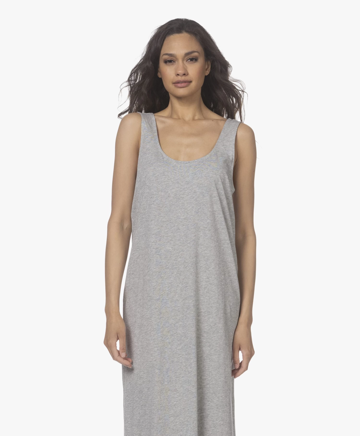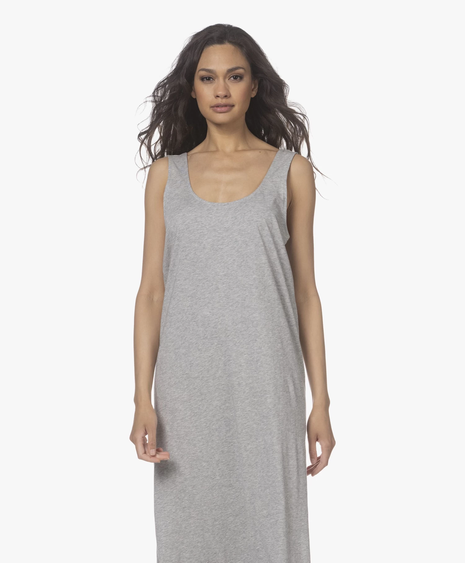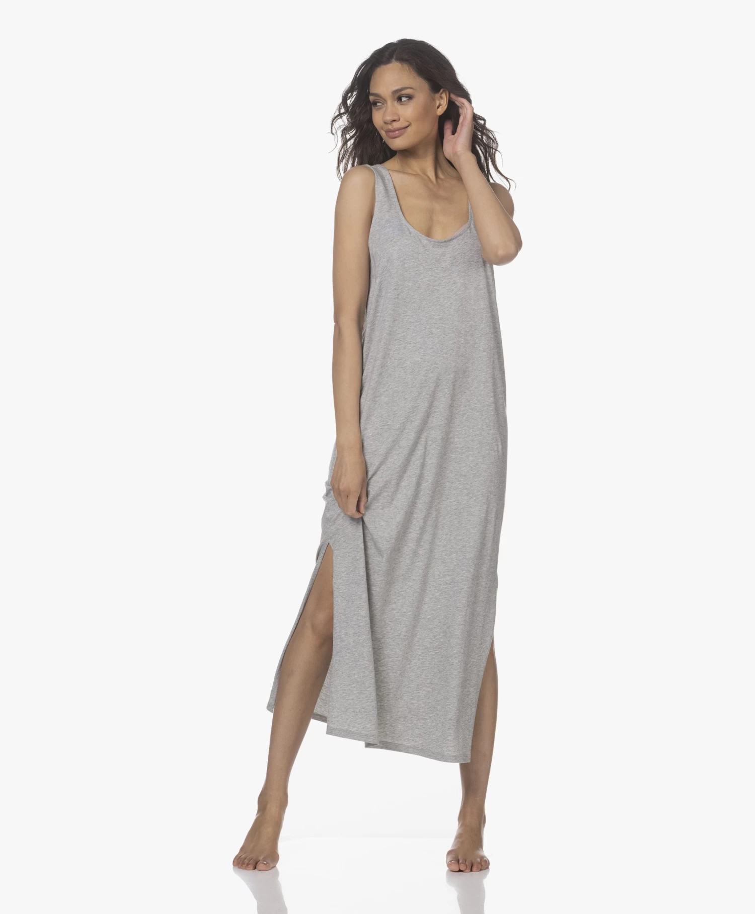 Skin ontwerpt de ideale jurk om in te slapen, maar waar je je ook stijlvol mee op straat kunt vertonen. Deze mouwloze Charlyse jurk in grijs mêlee komt in lichtgewicht jersey van biologische Pima katoen en is ontworpen met zijsplitten en een elegante maxi lengte. Het simpele silhouet flatteert ieder lichaamstype.