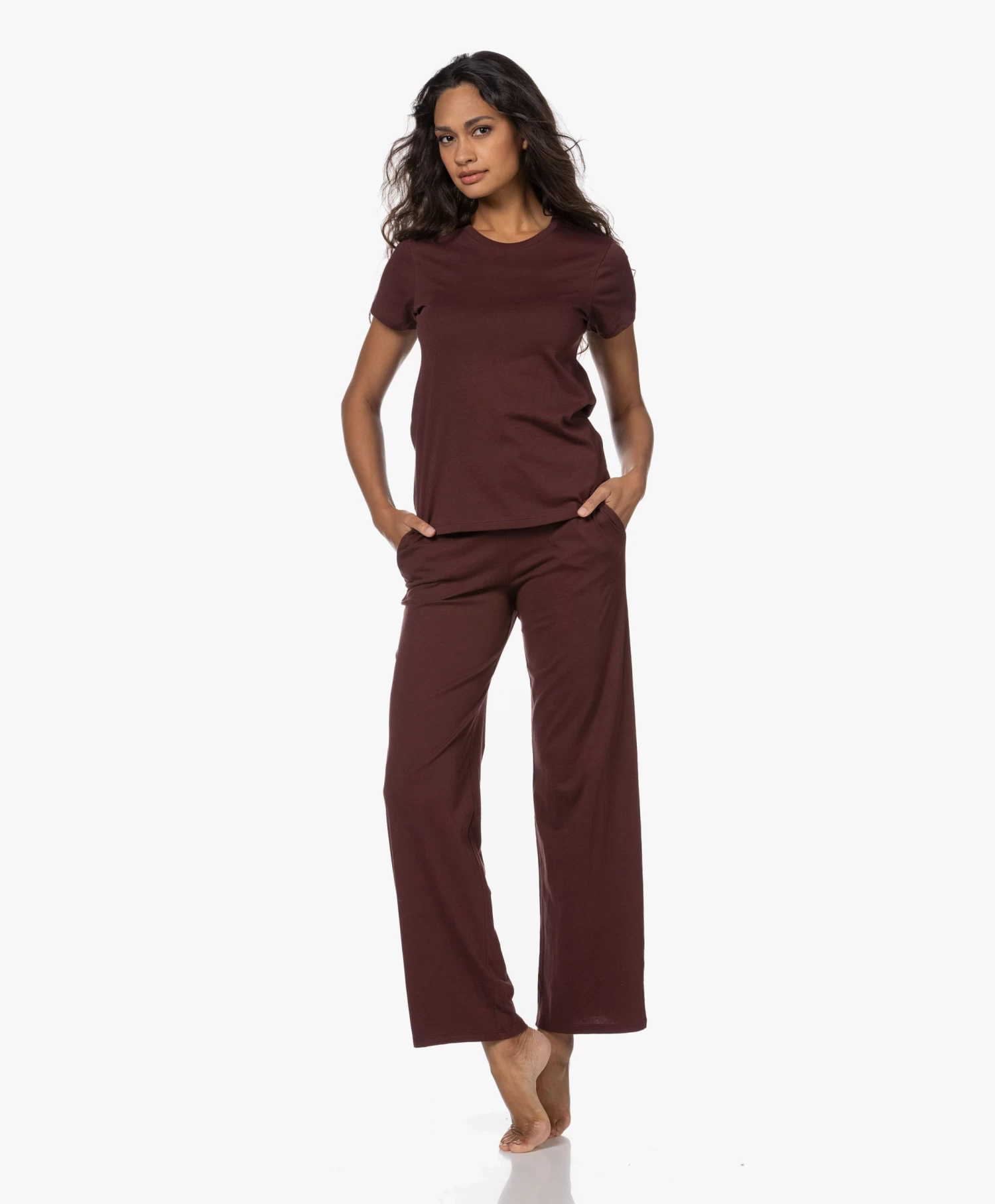Deze Christine katoenen jersey broek in bordeauxrood van Skin is perfect om de hele dag comfortabel in te vertoeven, dankzij de relaxte pasvorm met wijde rechte pijpen. De elastische middelhoge taille en steekzakken voegen daar nog een dosis comfort en functionaliteit aan toe. Een must-have om in te relaxen maar ook wanneer je veel wilt aftikken van je to-do lijstje.