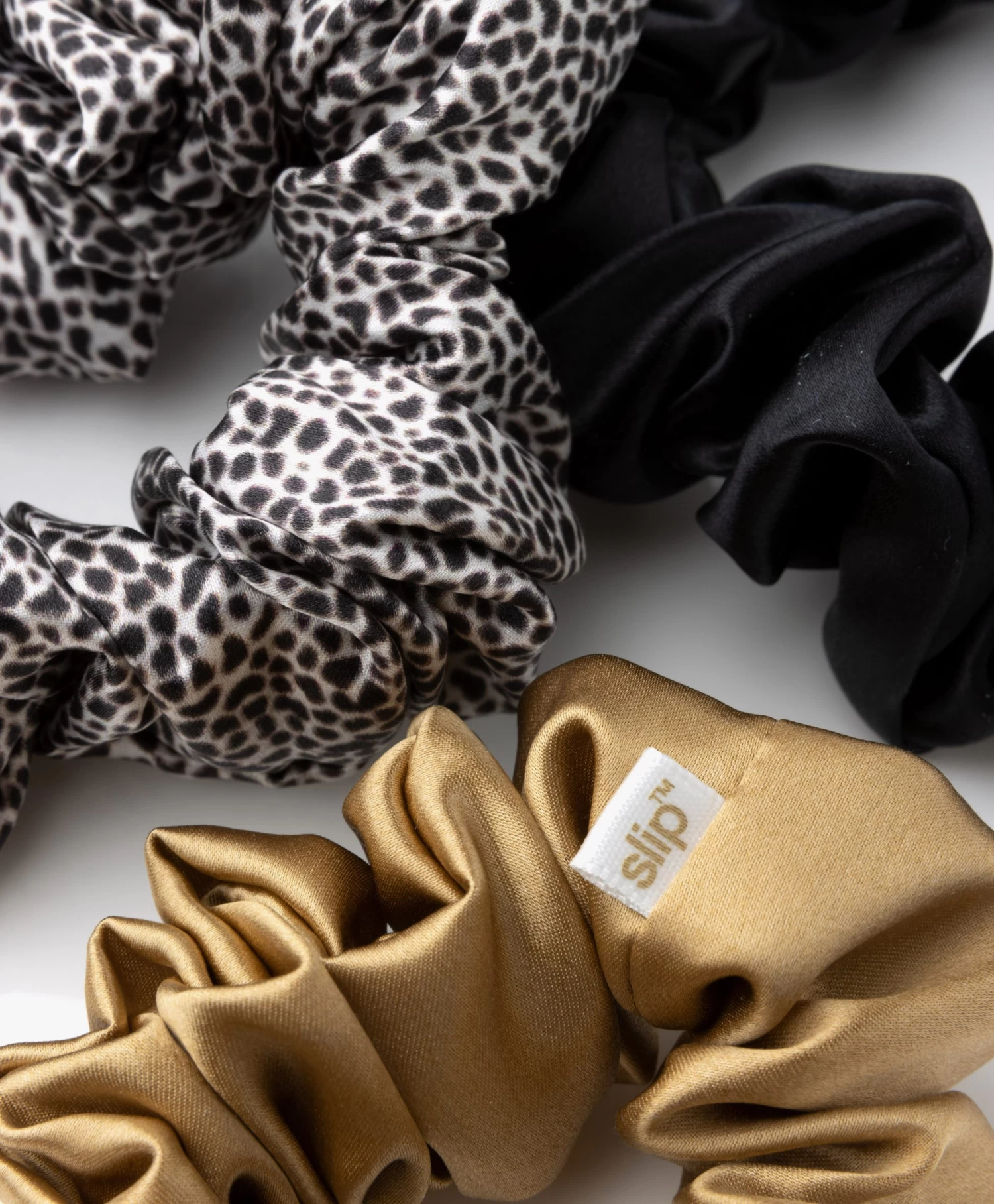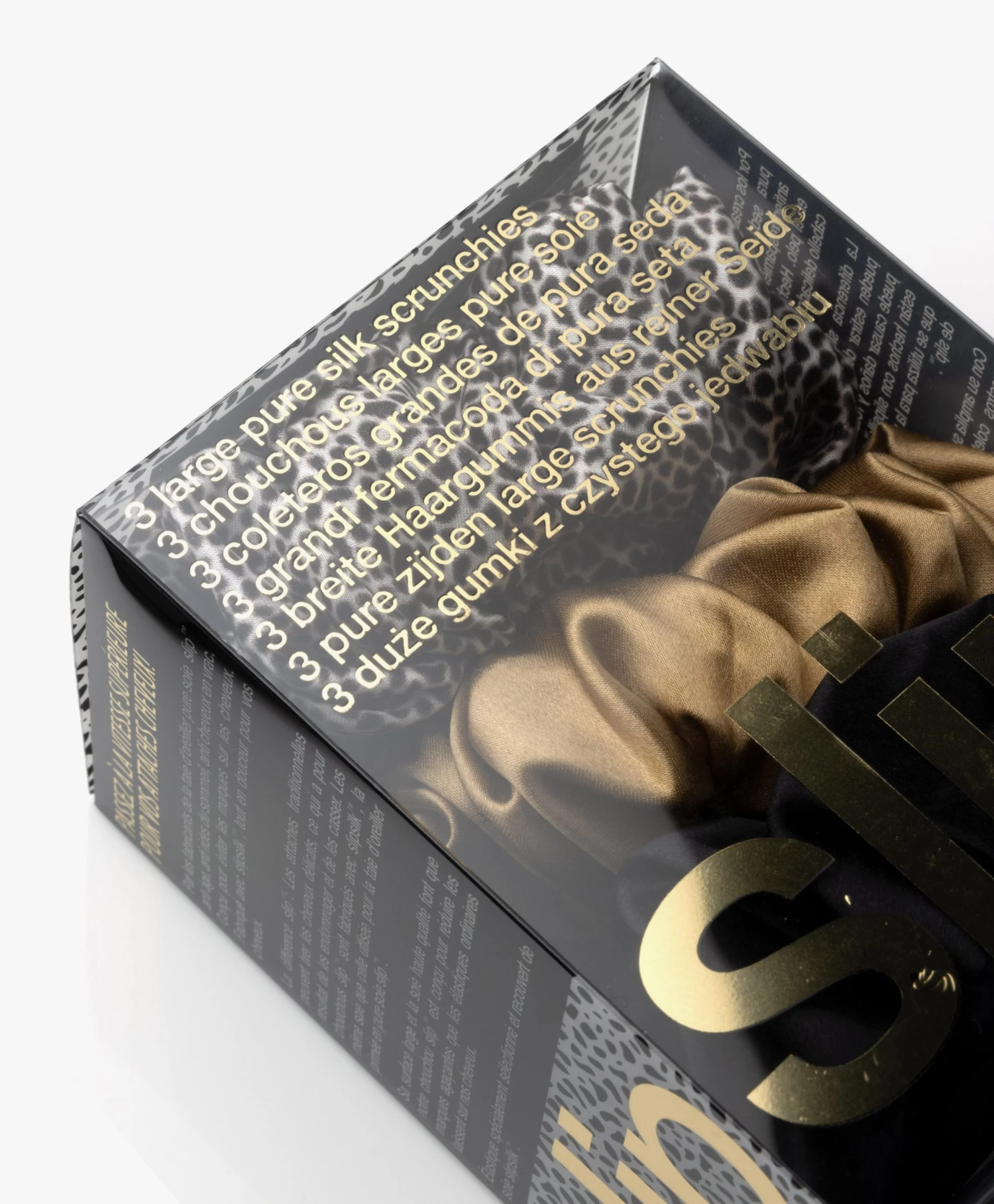 Tijd om je collectie haarelastieken een upgrade te geven. Dit 3 pack van slip™ bevat een combinatie van een grote zwarte, camelbruine en luipaardprint scrunchie die niet alleen stijlvol zijn, maar ook dienen als beschermend haaraccessoire dankzij de hoogste kwaliteit Mulbery zijde. De puur zijden kwaliteit heeft de perfecte glans, dikte en zachtheid waardoor haaruitval en beschadiging wordt voorkomen – met name tijdens het slapen.