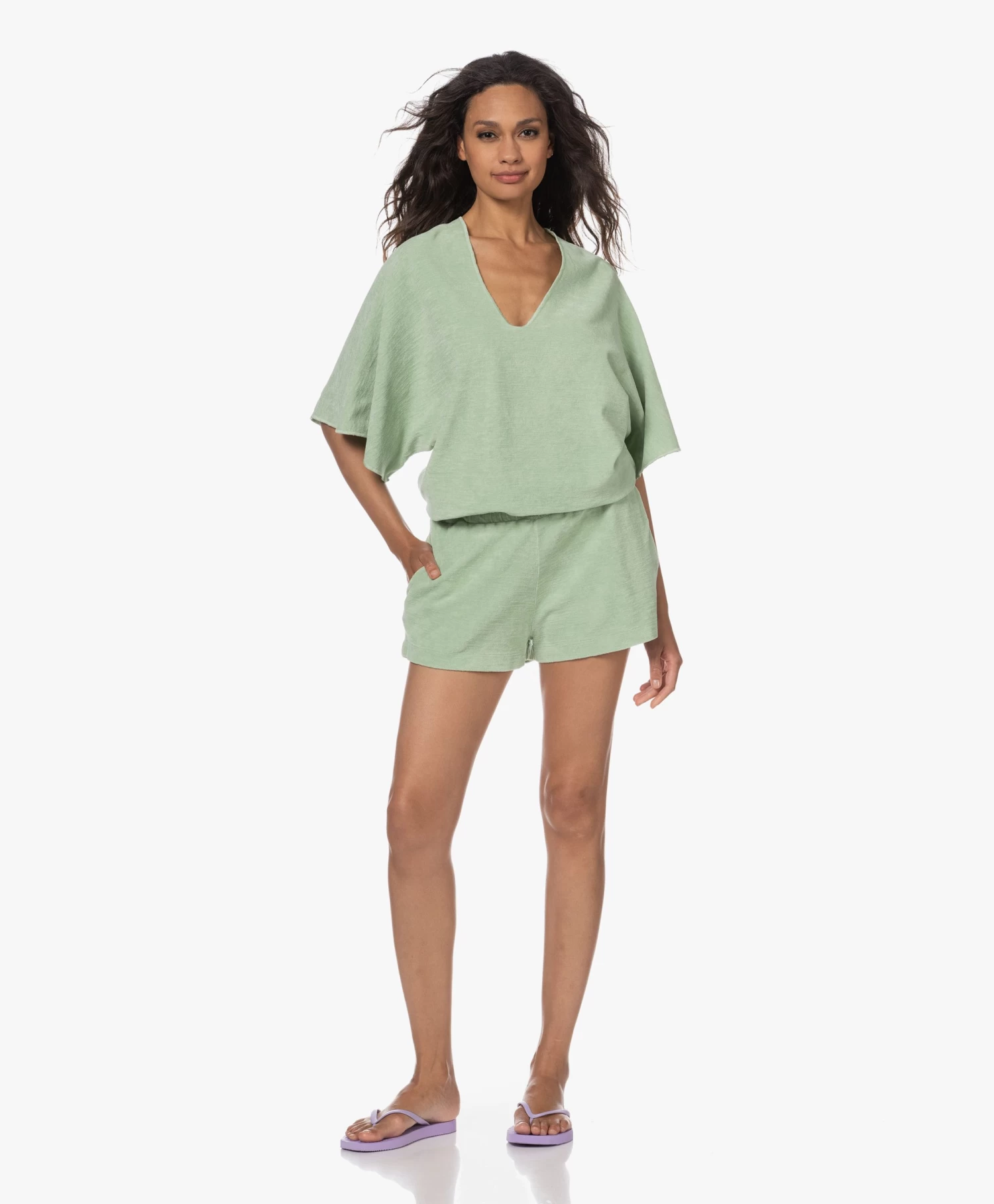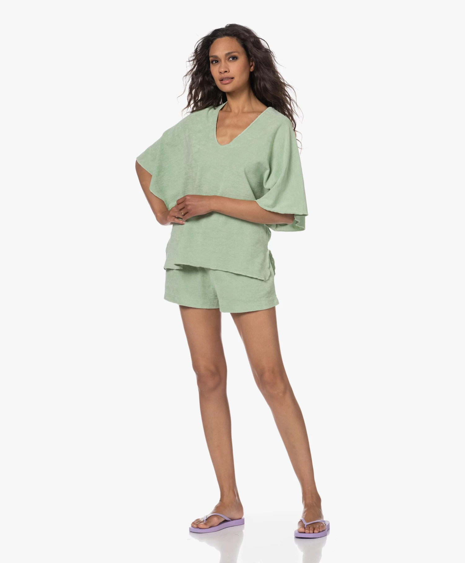 Hier hebben we lang op gewacht: de badstof jersey kaftan van Speezys Amsterdam in een korte variant om te dragen als top. Het maakt deze zachtgroene top van designerduo Patty Zomer en Brit Das instant favoriet. De diepe V-hals, de aangeknipte mouwen en de overlock afwerking creëren een nonchalante insteek die geaccentueerd wordt door de ‘garment-dye’ en ‘stonewash’ technieken.