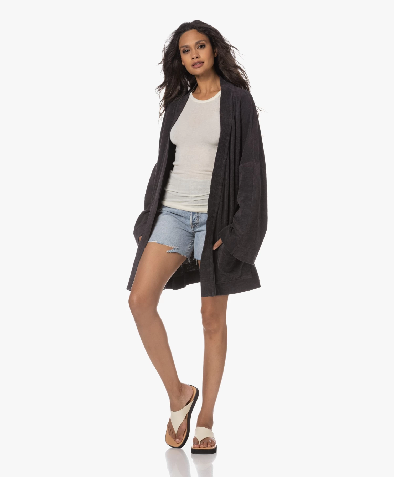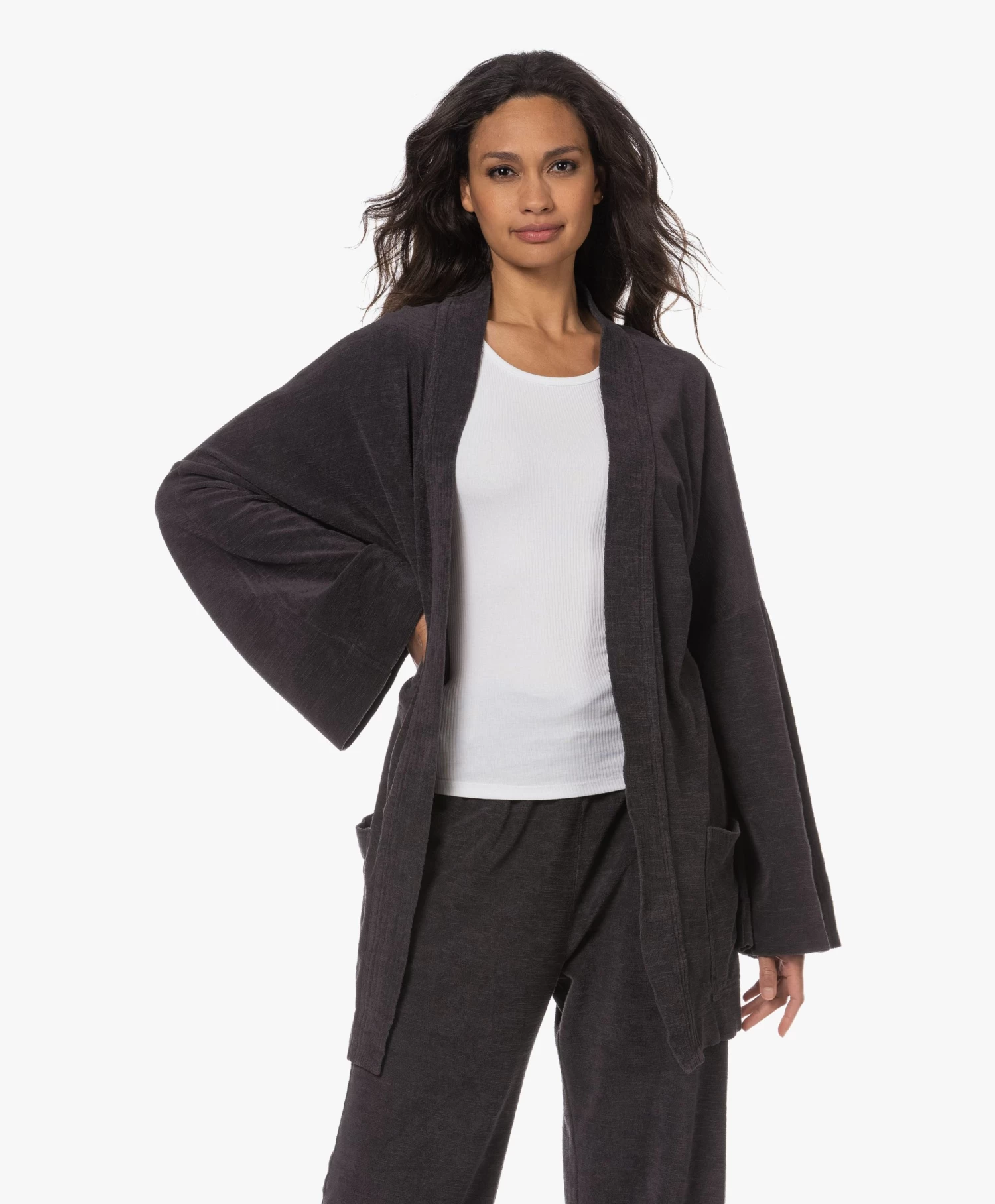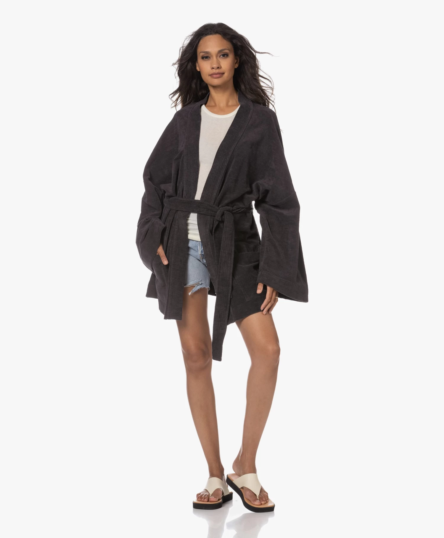 Verbazingwekkend, de hoeveelheid draagmomenten waarbij Speezys Amsterdam’s off-black kimono perfect van pas komt. Op reis, op het strand, tijdens relaxte dagen in en om het huis… De puur katoenen badstof heeft een verfijnde, licht onregelmatige structuur en een gladde binnenzijde die zacht aanvoelt op de huid. Er is ook een bijpassende trackpant met rechte wijde pijpen, mocht je wel oren hebben naar een stijlvolle Terry Suit.