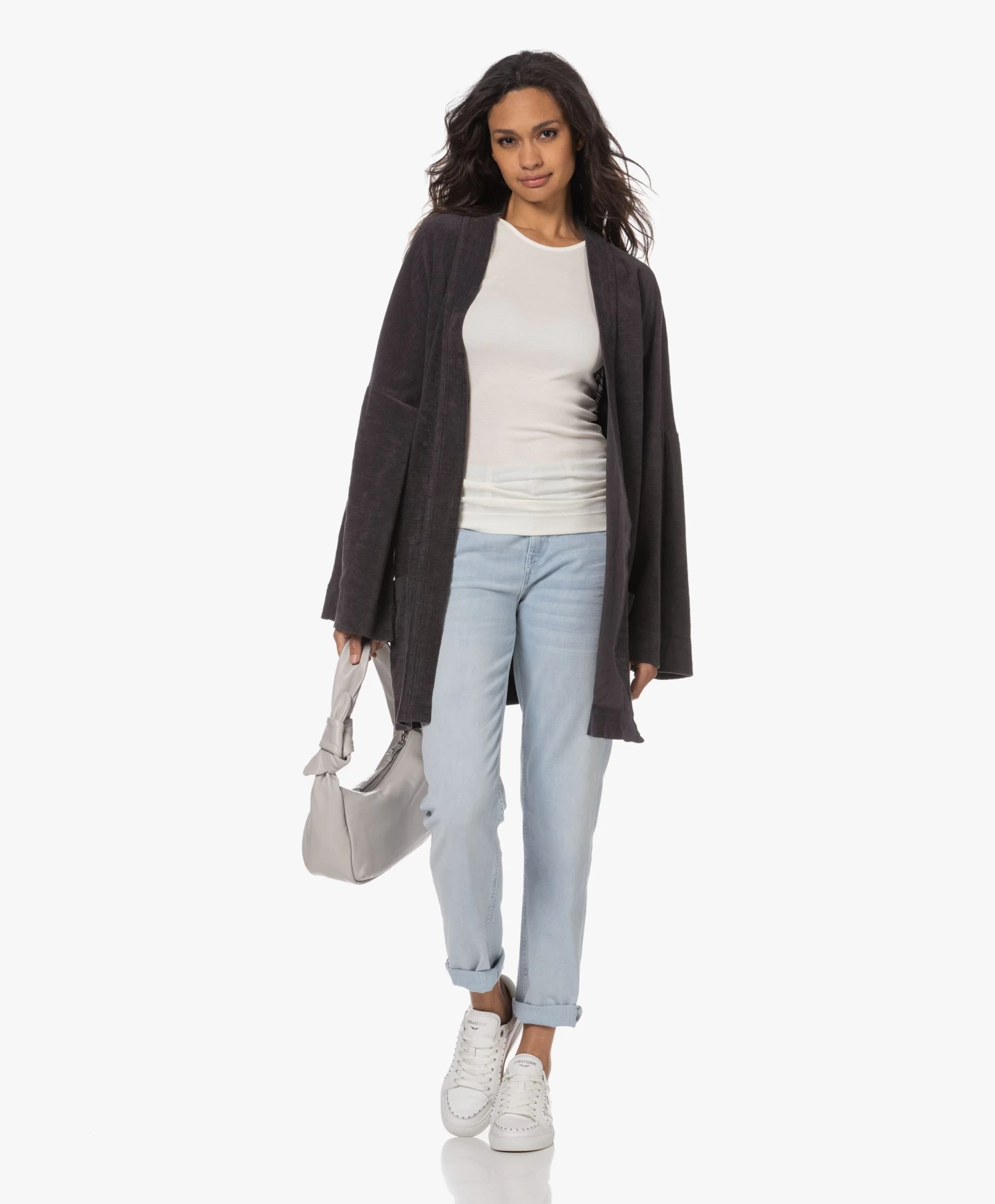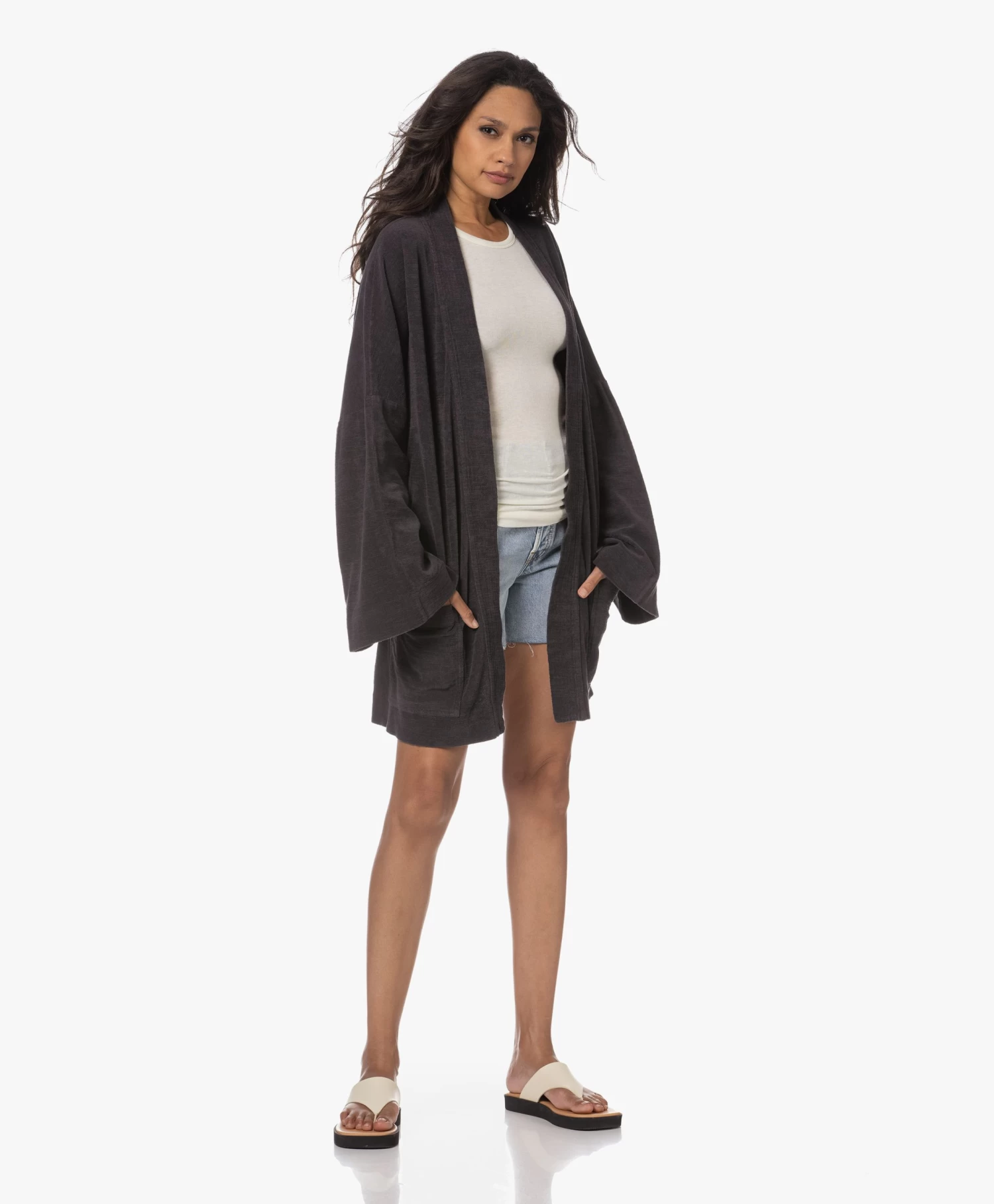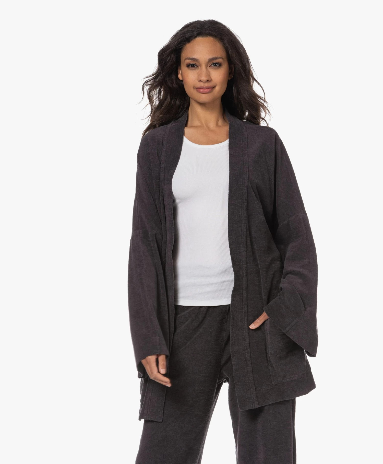 Verbazingwekkend, de hoeveelheid draagmomenten waarbij Speezys Amsterdam’s off-black kimono perfect van pas komt. Op reis, op het strand, tijdens relaxte dagen in en om het huis… De puur katoenen badstof heeft een verfijnde, licht onregelmatige structuur en een gladde binnenzijde die zacht aanvoelt op de huid. Er is ook een bijpassende trackpant met rechte wijde pijpen, mocht je wel oren hebben naar een stijlvolle Terry Suit.