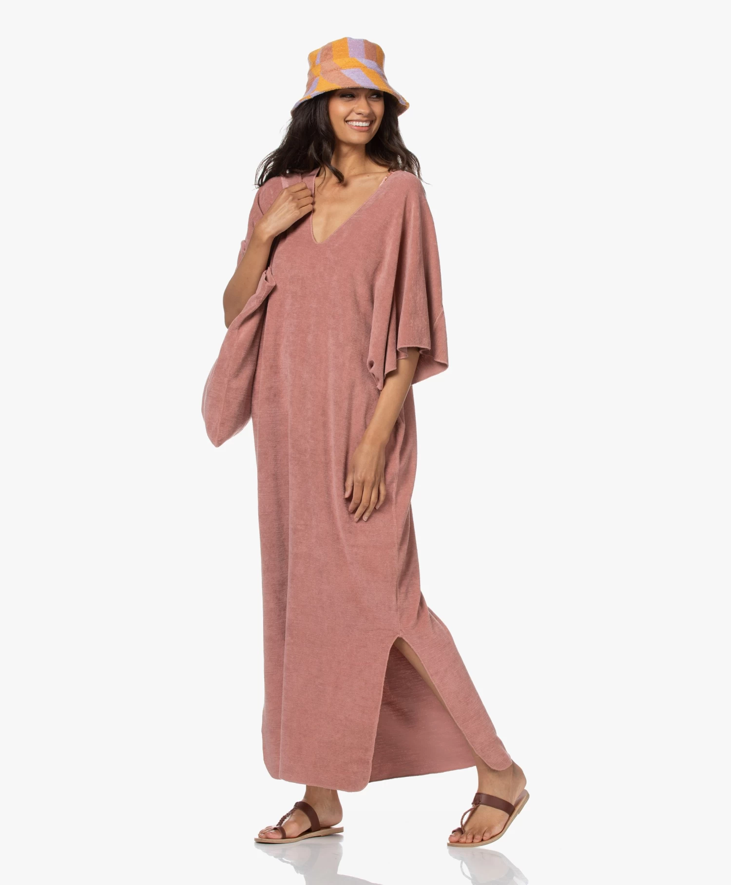 Als verlengde van de kaftancollectie van Speezys Amsterdam, ontwerpt het merk – van designer duo Patty Zomer en Britt Das – nu deze bucket hat in een lila, okergeel en lichtbruin streeppatroon. Gemaakt van een soepele badstoffen terry jersey van puur katoen.