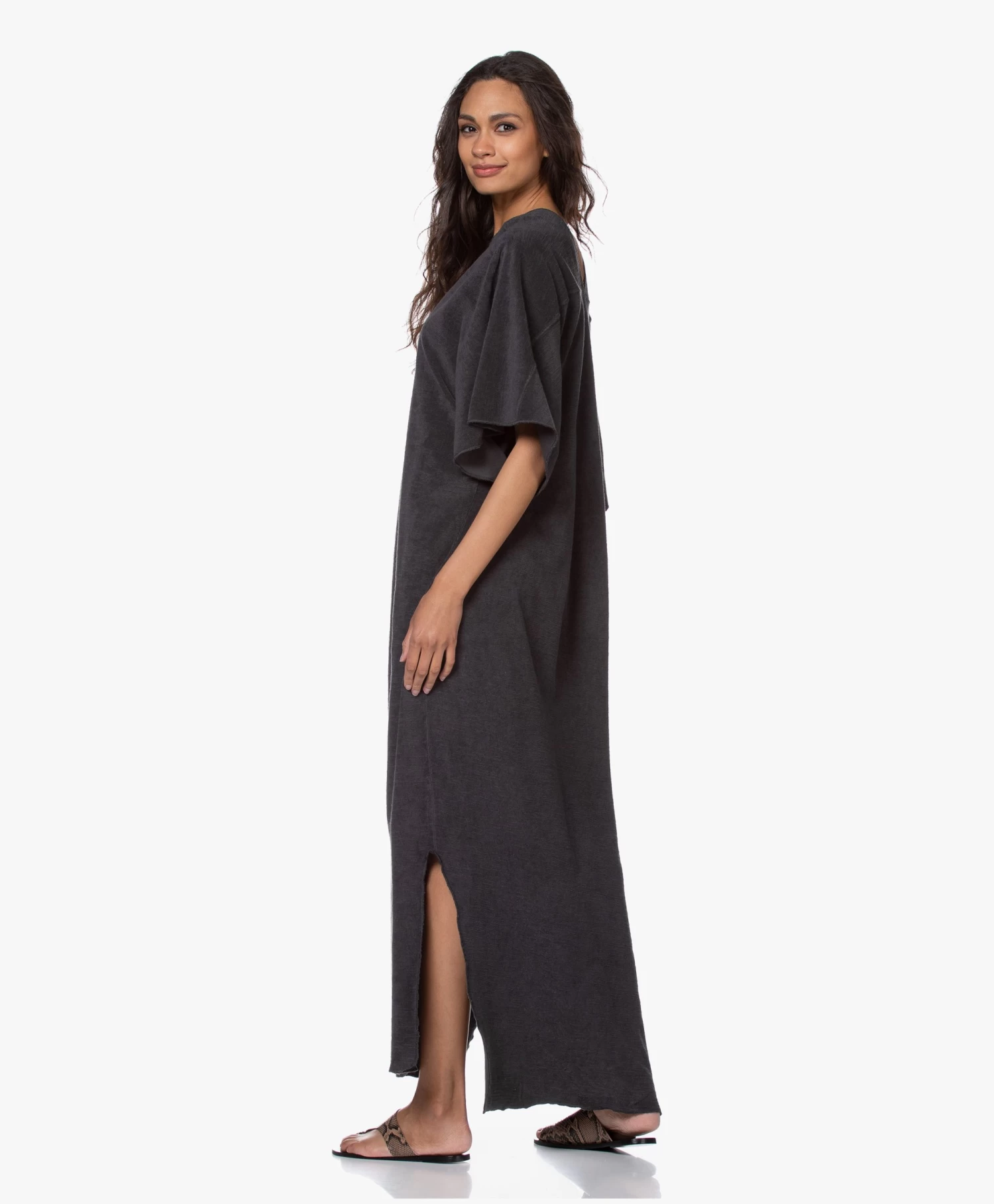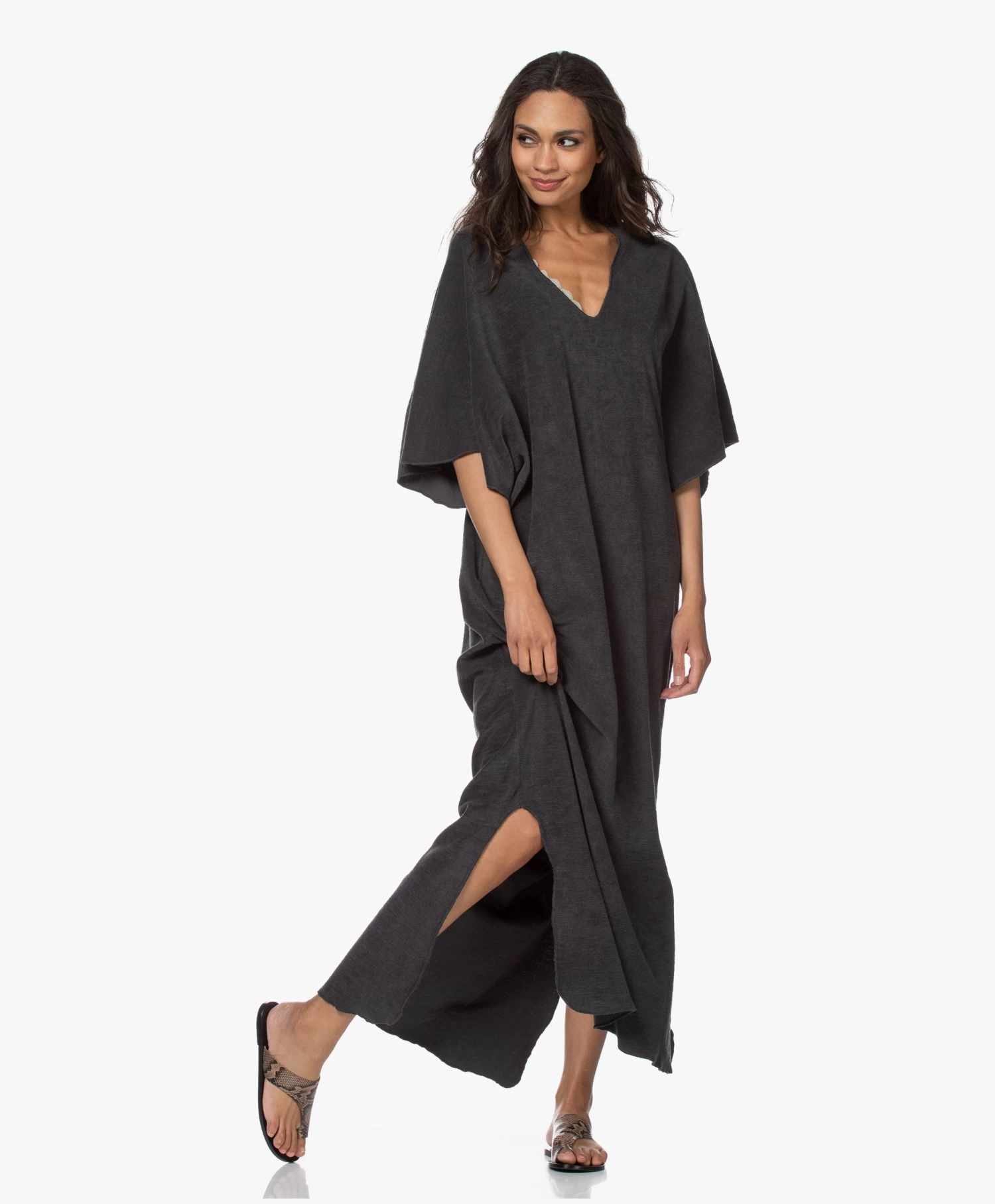 Het minimalistische ontwerp van deze Speezys Amsterdam kaftan in gewassen zwart – van designer duo Patty Zomer en Britt Das – wordt benadrukt door de eenvoudige, doch eigentijdse belijning. De diepe V-hals, de aangeknipte mouwen en de overlock afwerking creëren een nonchalante insteek die geaccentueerd wordt door de ‘garment-dye’ en ‘stonewash’ technieken voor een unieke, love-worn kleur. Deze unisex kaftan is van gemaakt van puur katoen in een badstoffen terry jersey kwaliteit. Draag naar het strand, de sauna of ga voor comfort thuis.Â