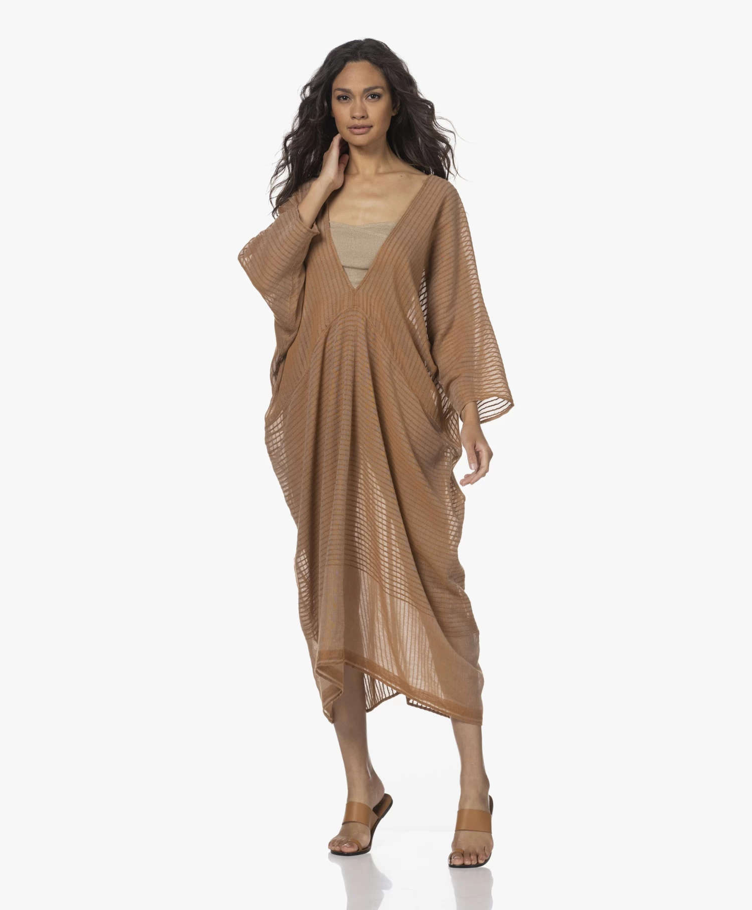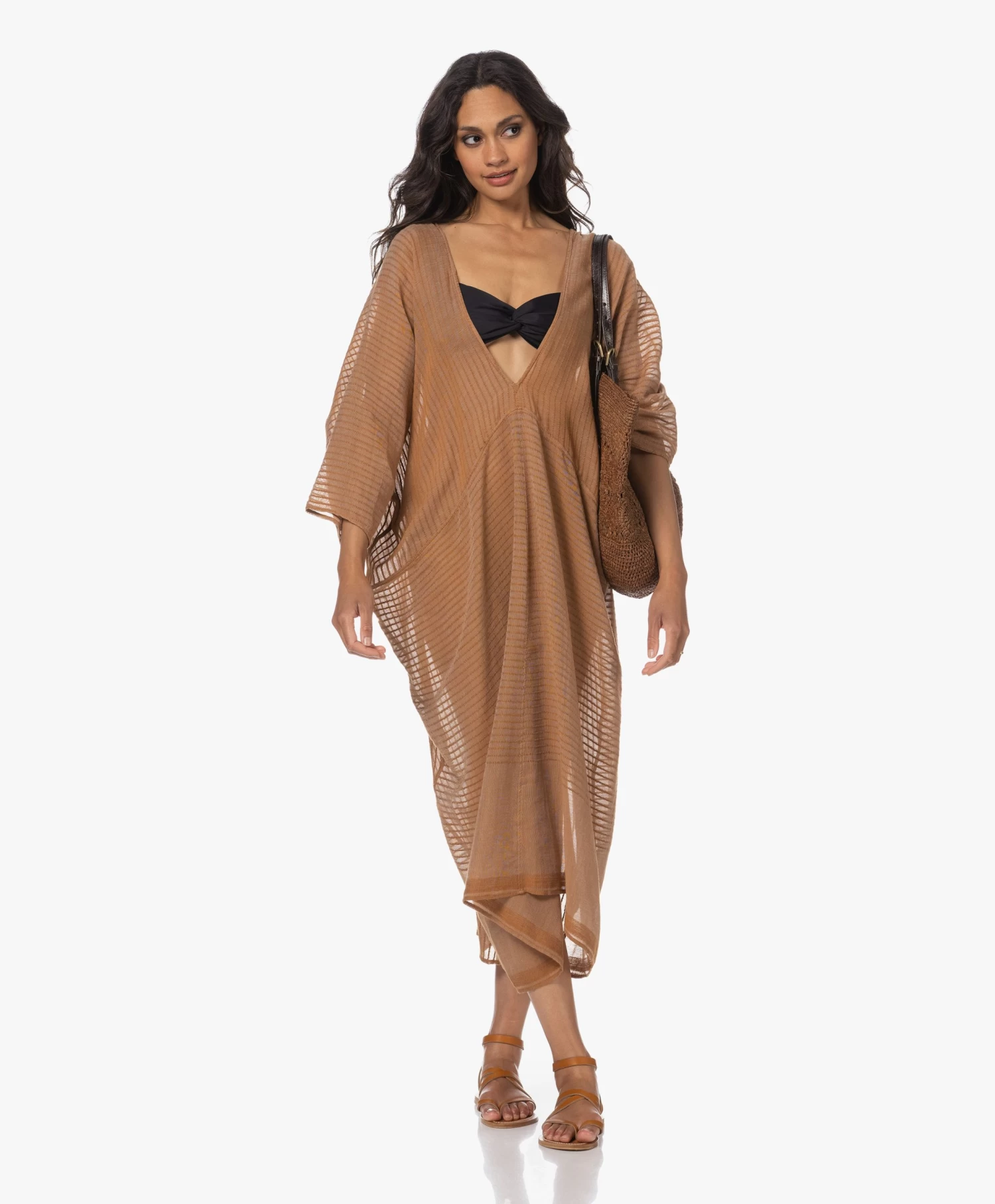 Een kaftan waarin eigentijdse en klassieke details stijlvol samenkomen: SU Paris maakt het tot een realiteit met camelbruine kaftan Talia. Ontworpen in een luchtige en lichtgewicht gauze kwaliteit van puur katoen met een geweven streepdessin waarbij gespeeld wordt met transparantie. Het losvallende rechte silhouet vindt tegenwicht in de ultra-diepe V-hals en cropped mouwen.