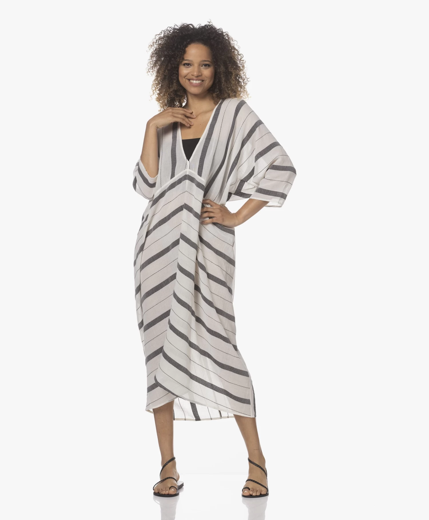 Een kaftan waarin eigentijdse en klassieke details stijlvol samenkomen: SU Paris maakt het tot een realiteit met kaftan Talia. Ontworpen in off-white en zwart en gemaakt van een luchtige semi-transparante katoenen voile. Het losvallende rechte silhouet vindt tegenwicht in de ultra-diepe V-hals en cropped mouwen.