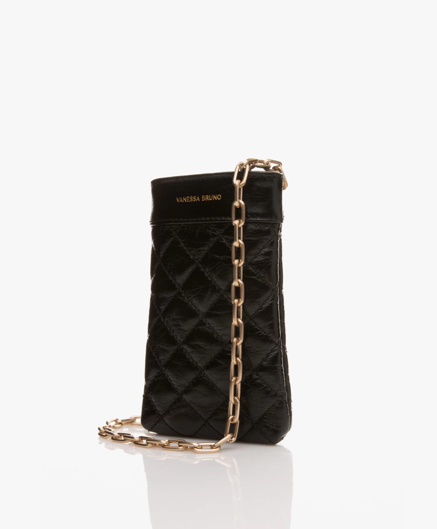 Tegenwoordig kunnen we alles met onze telefoon – dus waarom een grotere tas meezeulen als je ook genoeg hebt aan dit stijlvolle telefoontasje? Vanessa Bruno voert de elementen van hun bestselling Moon tas door in dit zwarte ontwerp, te herkennen aan de doorgestikte crinkle-leren kwaliteit met glanzende finish en het matgoudkleurige kettinghengsel.