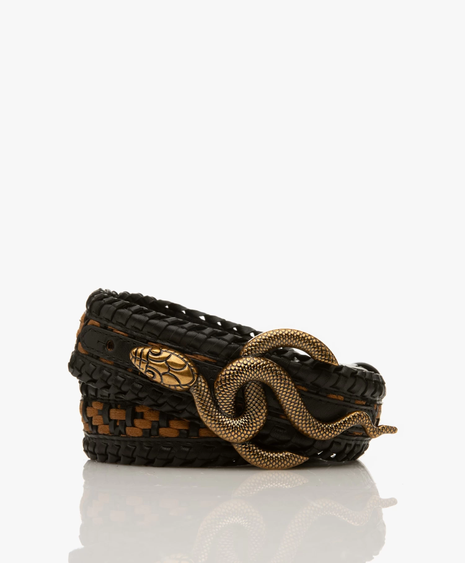 Op zoek naar een juweeltje? Dan is deze riem van Vanessa Bruno precies wat je nodig hebt. De vintage-goudkleurige metalen slang springt direct in het oog dankzij het geraffineerde design en de ceintuur is ambachtelijk vervaardigd van een hoogwaardige kwaliteit leer in zwart, doorregen met cognacbruine katoenen garens voor een grafisch effect. Het perfecte accessoire om een vrouwelijk en krachtig statement mee te maken!
