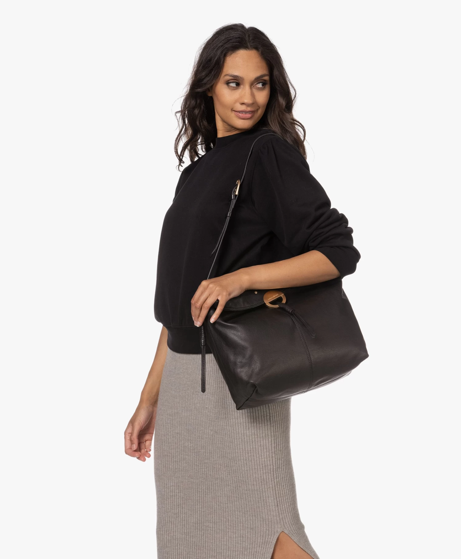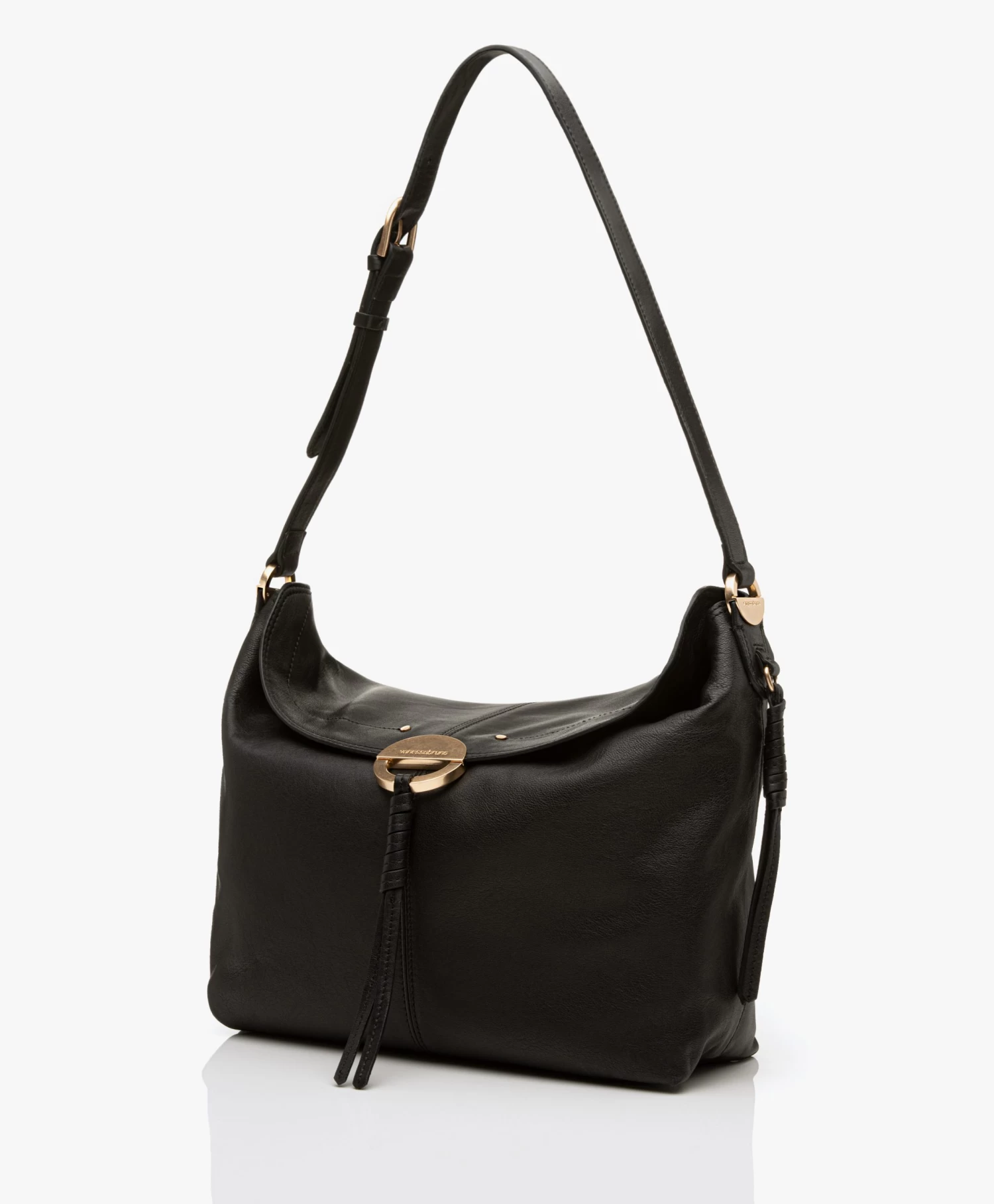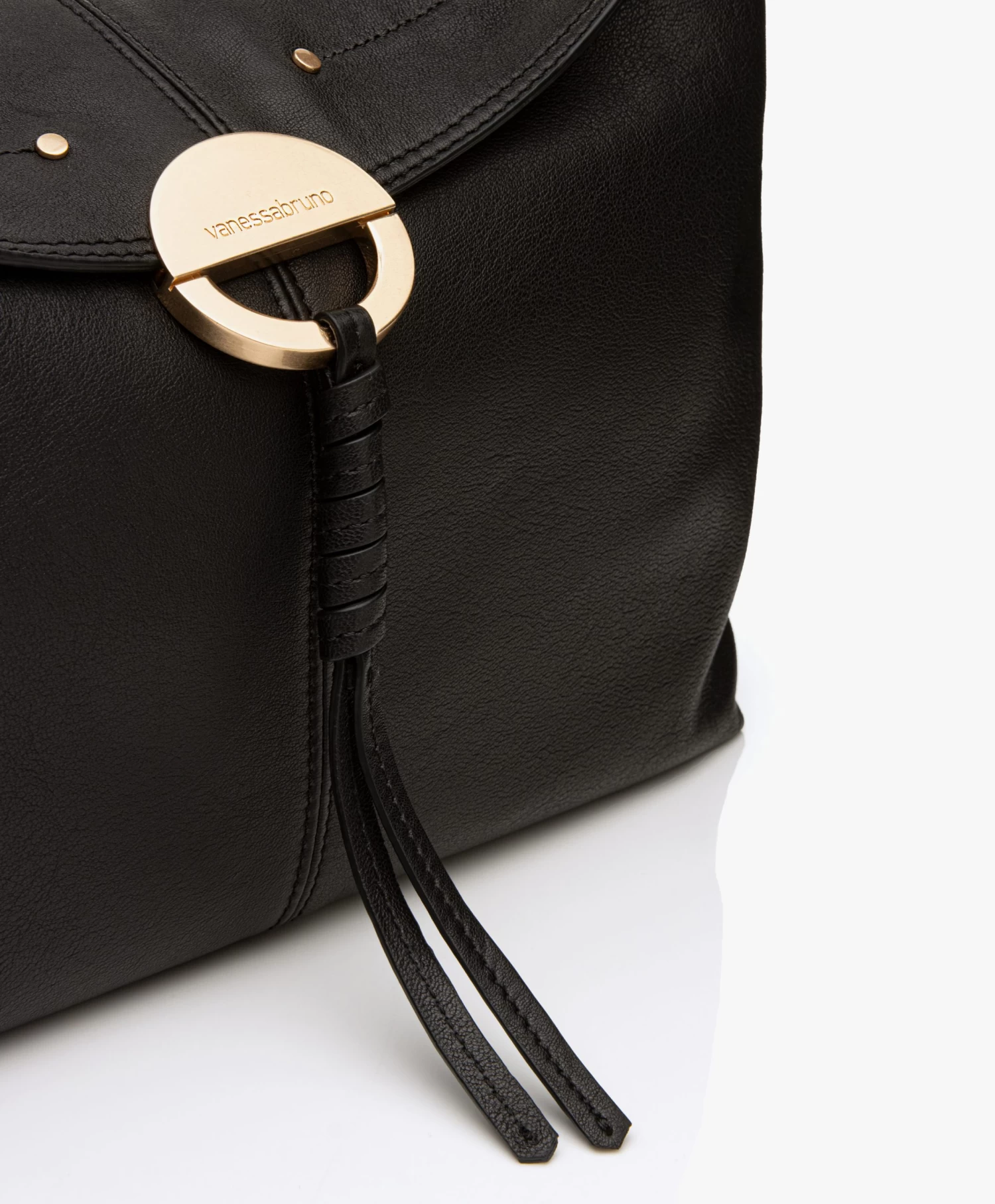 Tas Hobo van Vanessa Bruno is ruim, heeft een tijdloos ontwerp en balanceert op stijlvolle wijze tussen een schoudertas en een leren shopper. Gemaakt van zacht zwart lamsleer met een stevige katoenen twill voering in beige. Rosé gouden hardware complementeren het geheel en natuurlijk mag de voor-het-merk iconisch vormgegeven ronde sluiting niet ontbreken.