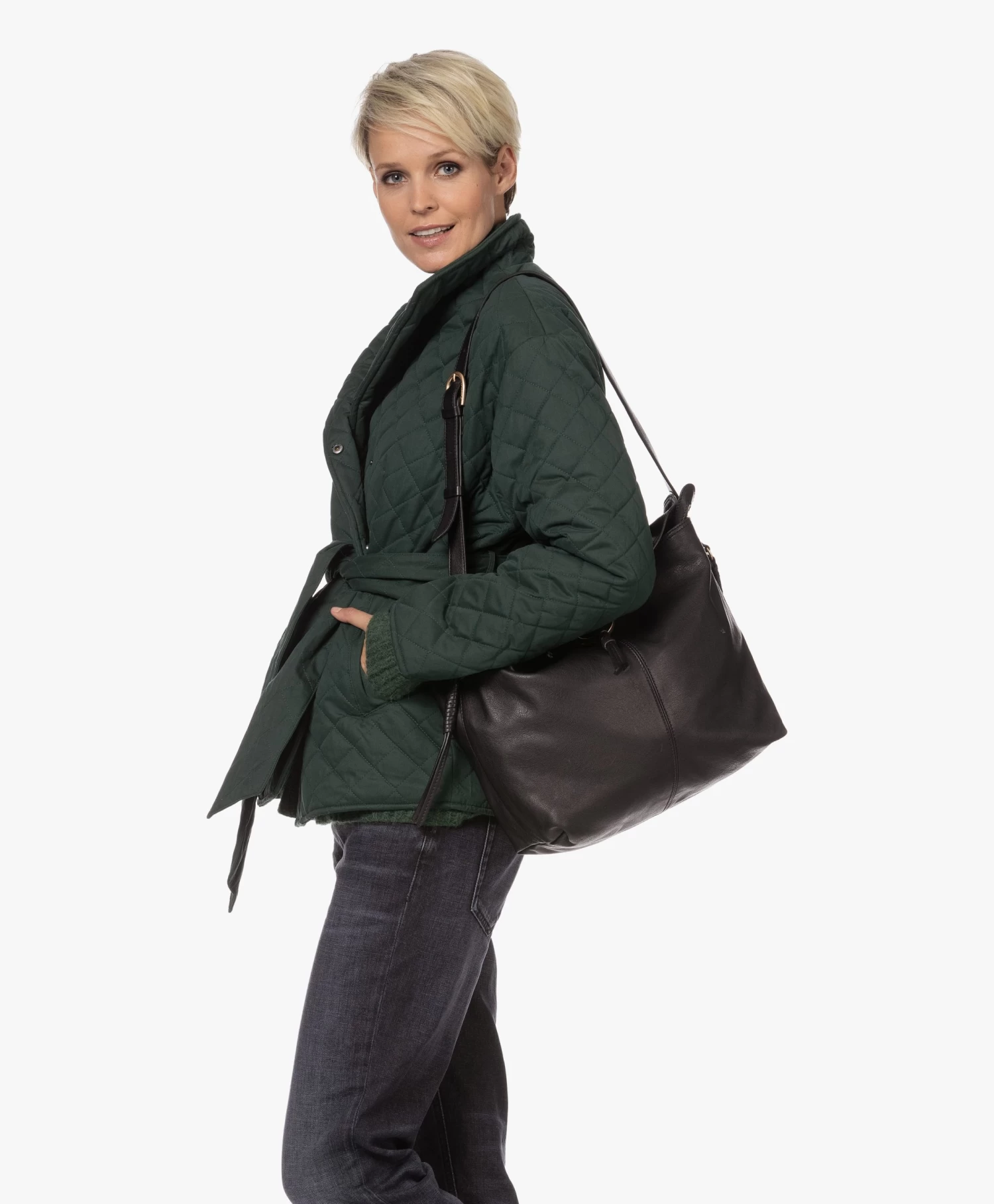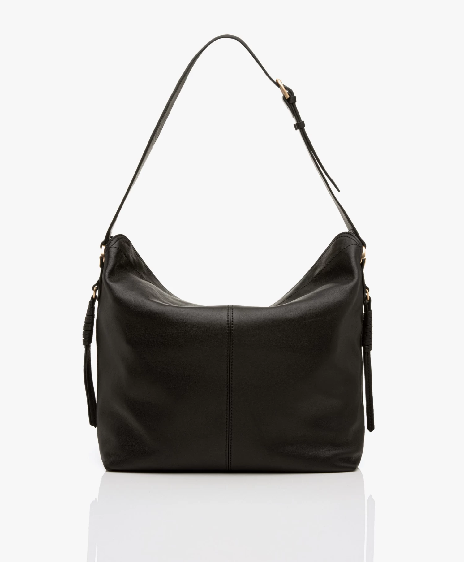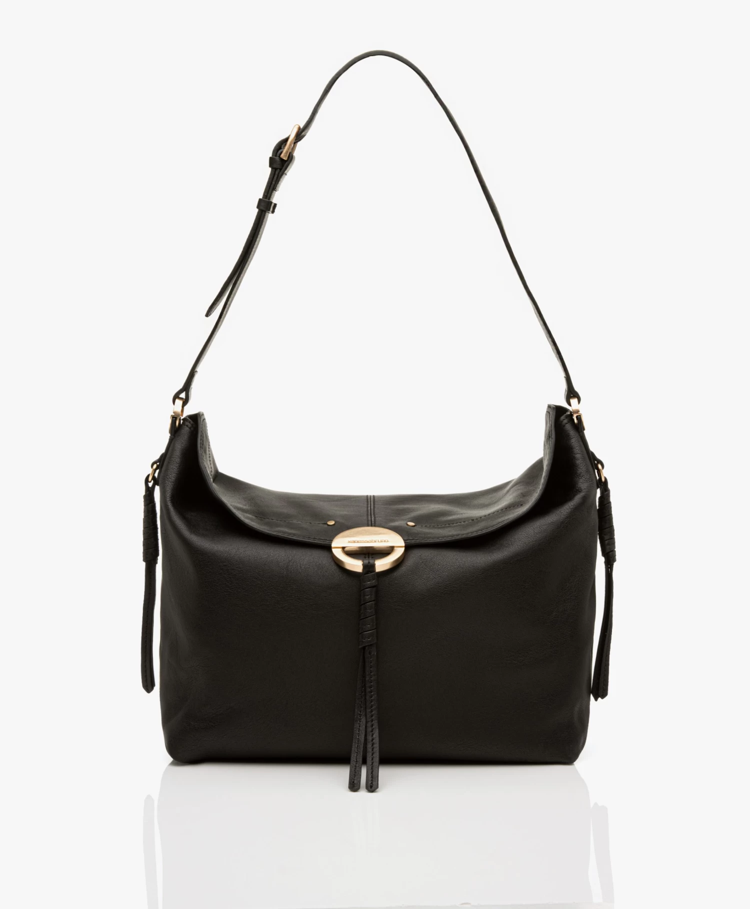 Tas Hobo van Vanessa Bruno is ruim, heeft een tijdloos ontwerp en balanceert op stijlvolle wijze tussen een schoudertas en een leren shopper. Gemaakt van zacht zwart lamsleer met een stevige katoenen twill voering in beige. Rosé gouden hardware complementeren het geheel en natuurlijk mag de voor-het-merk iconisch vormgegeven ronde sluiting niet ontbreken.