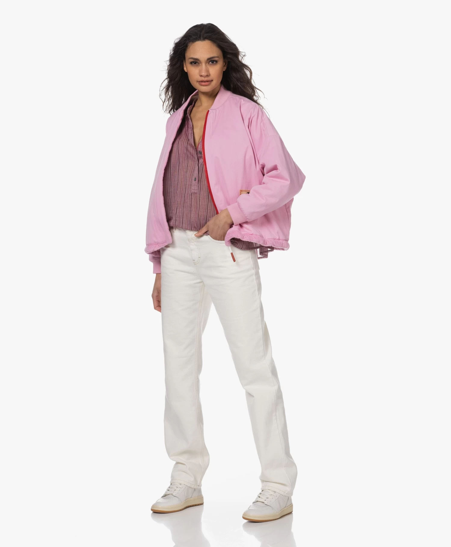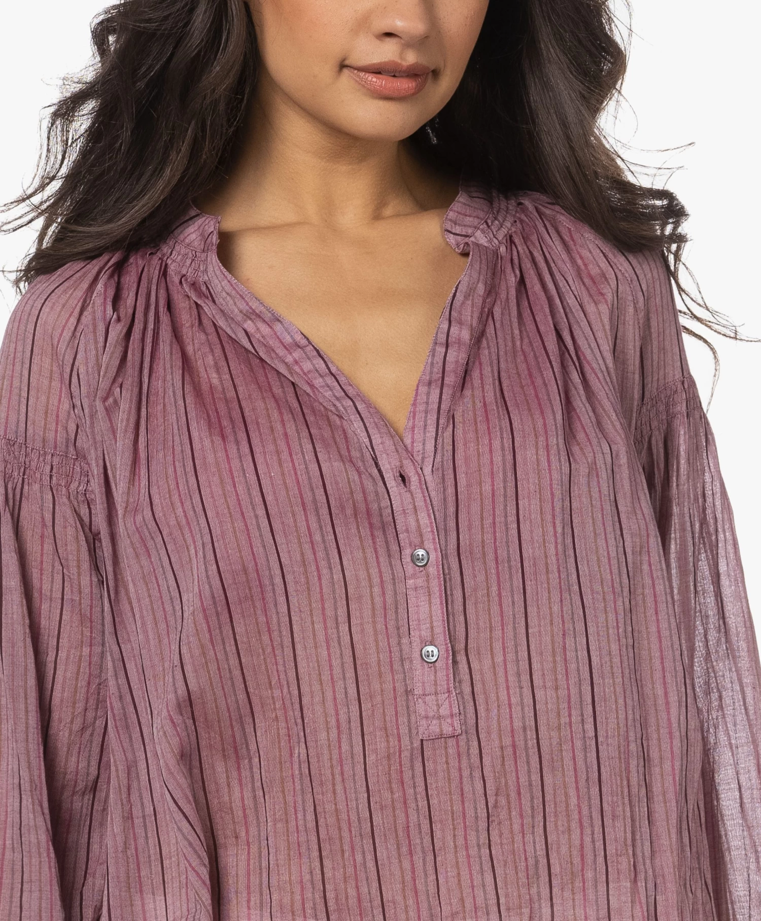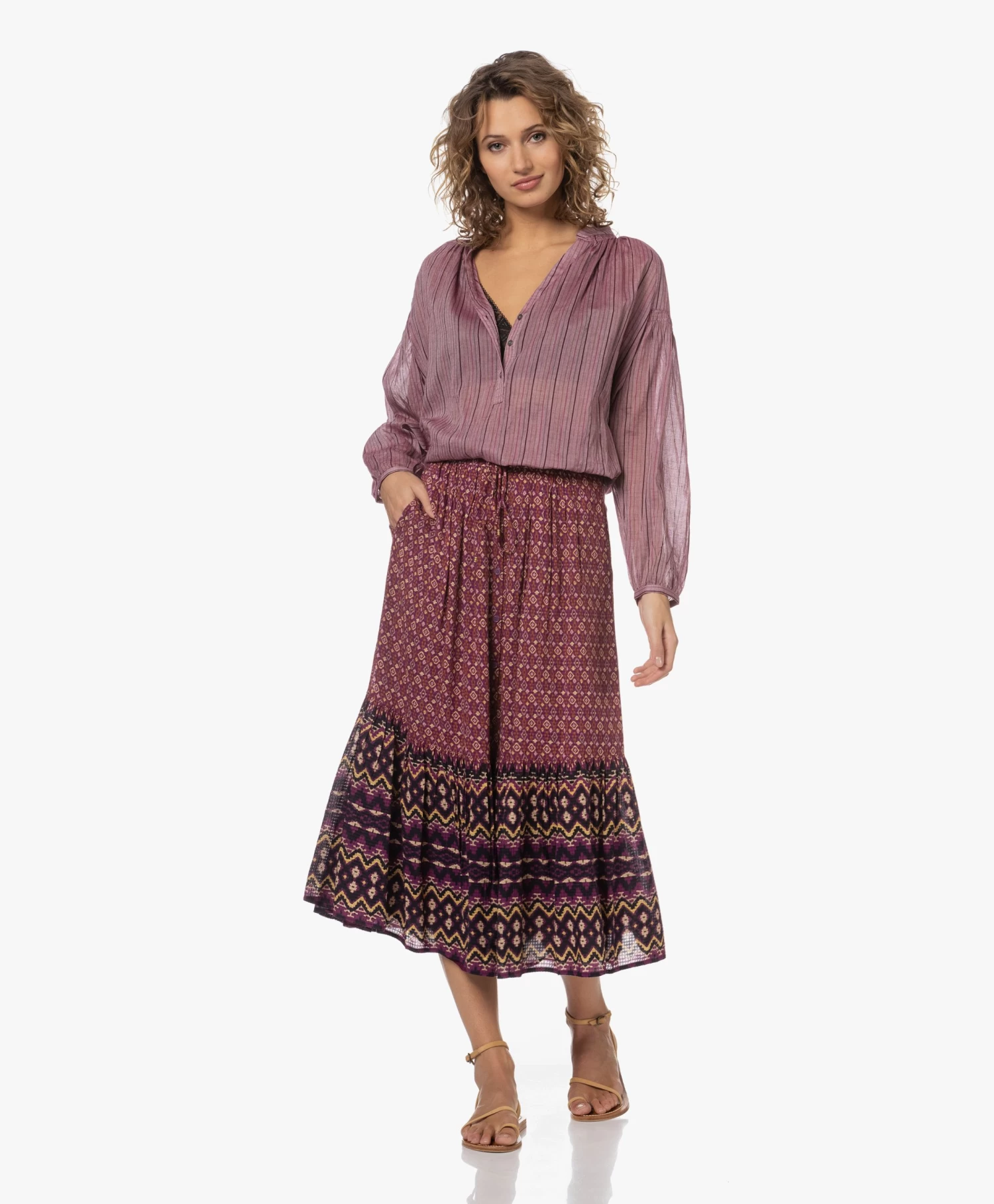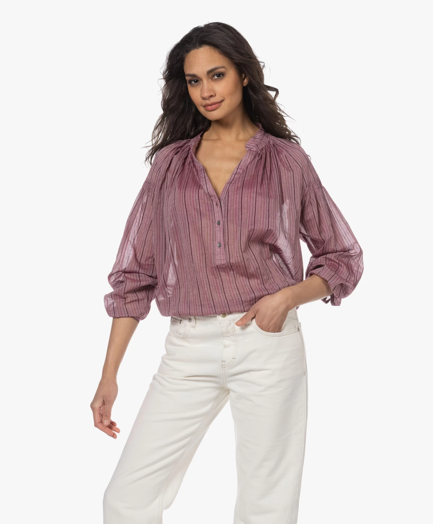 Vanessa Bruno’s kenmerkende stijl is duidelijk terug te zien in blouse Nipoa, gemaakt van luchtige katoenvoile met een ingeweven streepdessin in gemêleerd oudroze, cyclaam en bordeauxrood. De losvallende tuniekblouse is voorzien van een smalle staanderkraag, een gedeeltelijke knoopsluiting, bloezende lange mouwen en gesmockte details.