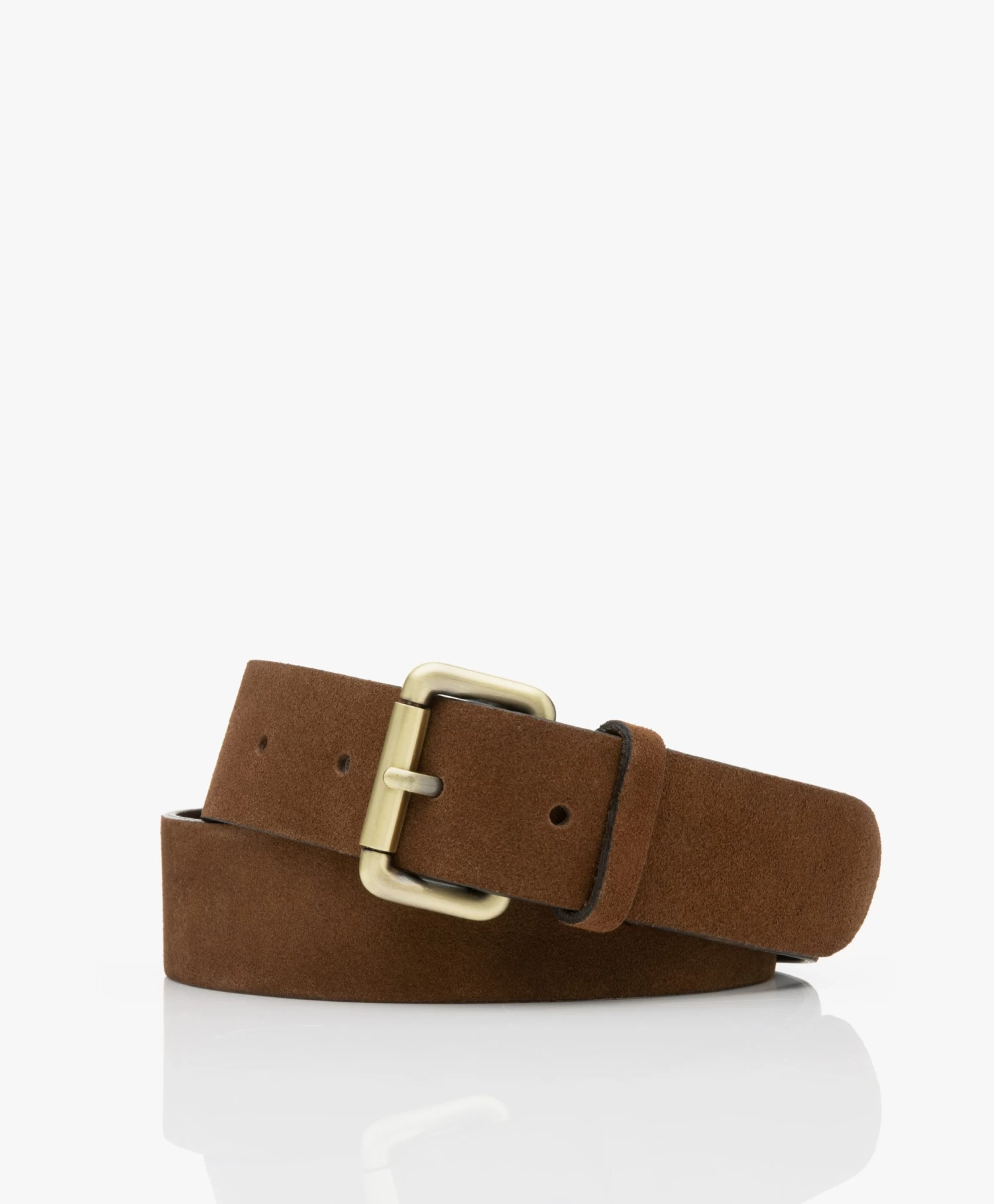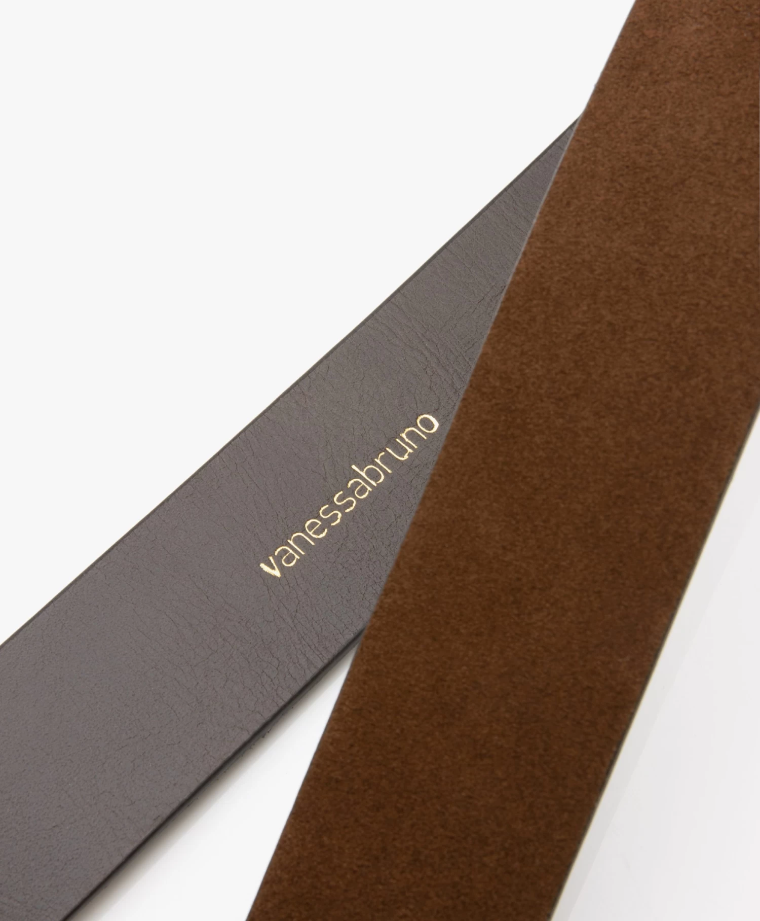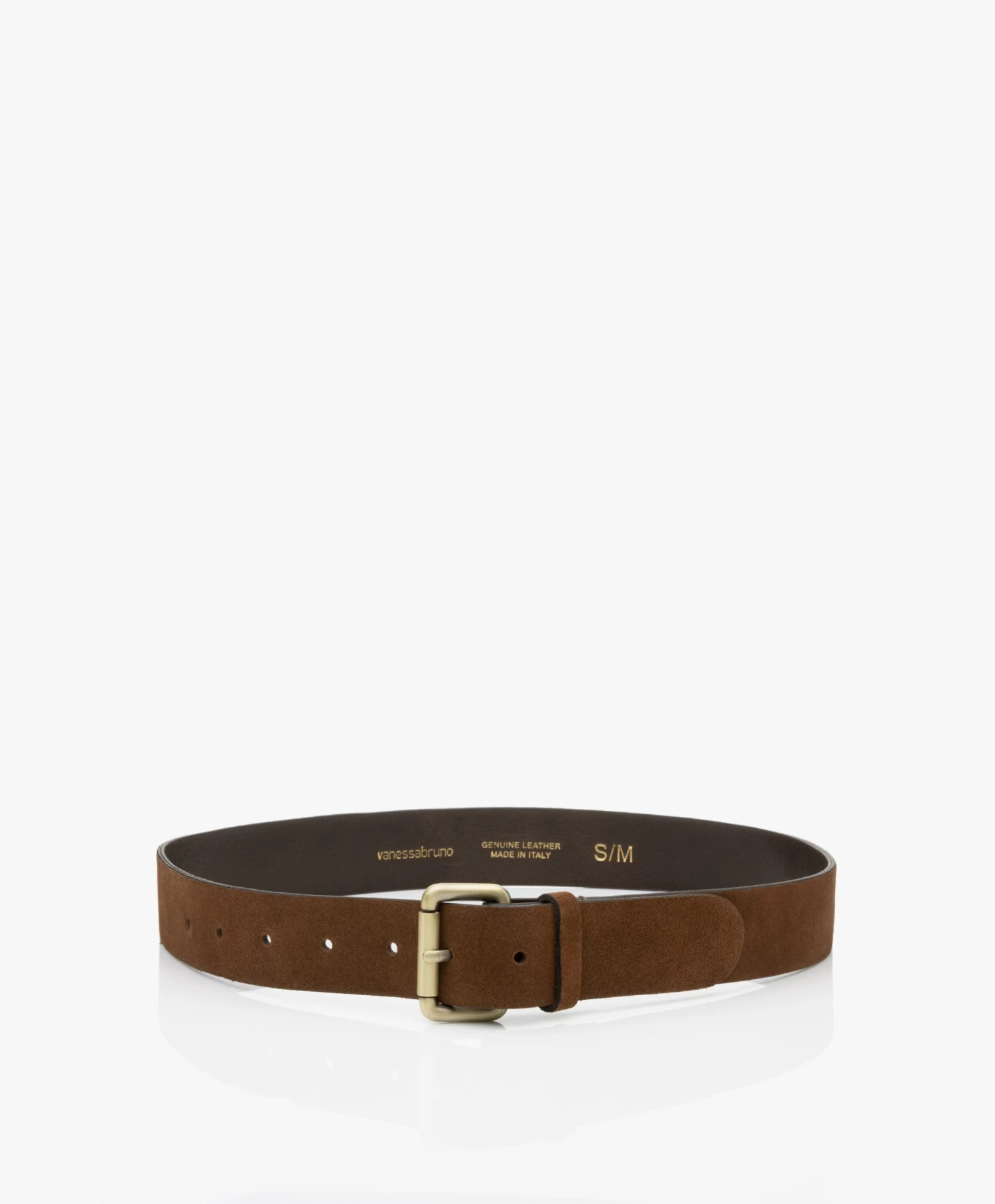 Deze bruine riem van Vanessa Bruno biedt stijl met een minimalistisch karakter waardoor een tijdloos design ontstaat. De riem – gemaakt van een hoogwaardige, zachte suède leerkwaliteit met een subtiel gestructureerd oppervlak – is ontworpen met een rechthoekige, matte goudkleurige gespsluiting en heeft extra gaatjes om de riem zowel in de taille als op de heup te kunnen dragen.