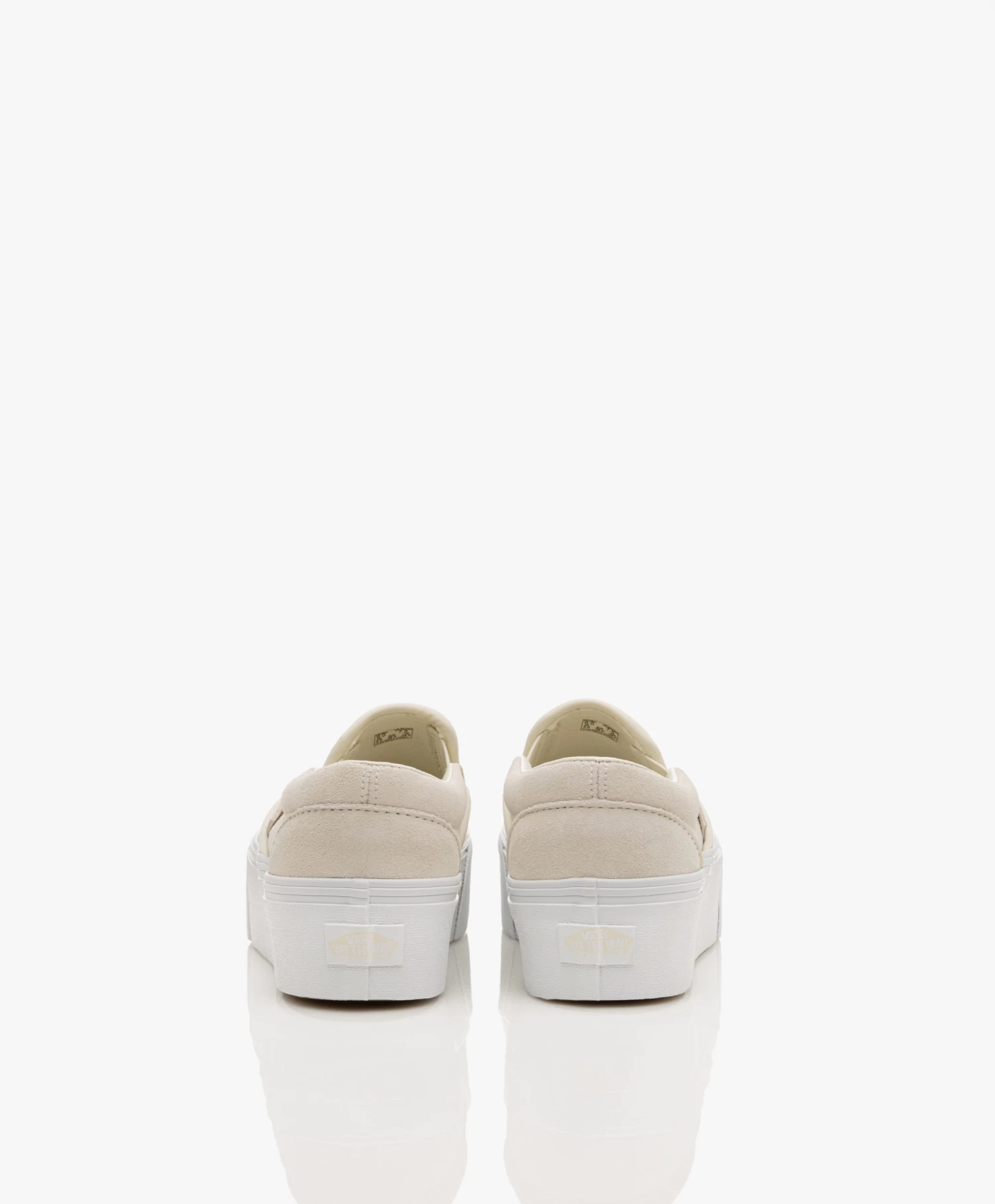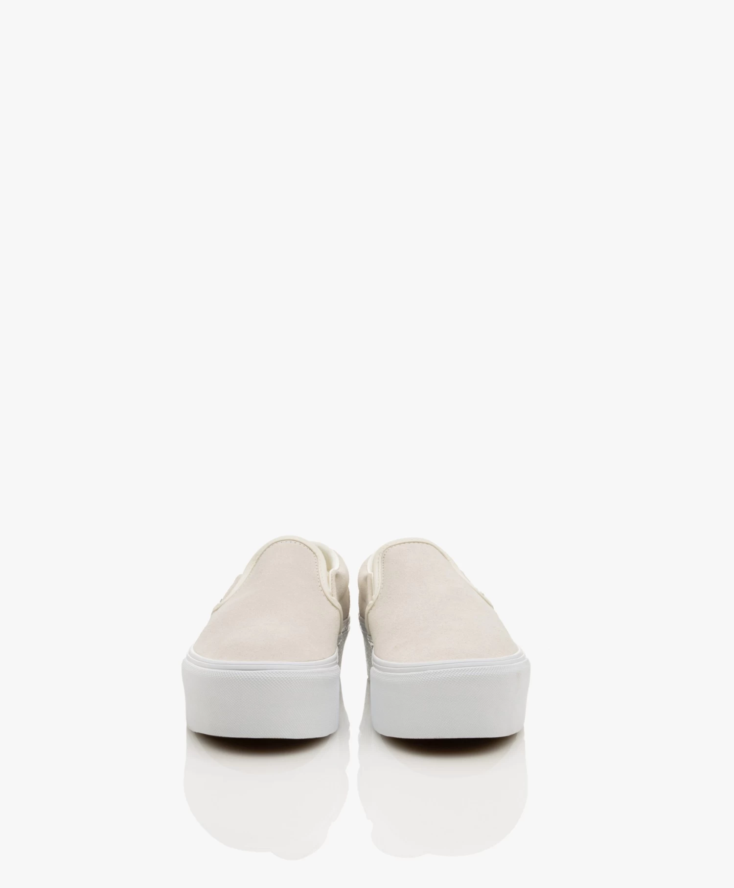 Misschien wel de meest stijlvolle Vans die we ooit gezien hebben: de combinatie van lichtbeige suède, een off-white leren randafwerking en een hagelwitte zool geeft de speelse streetwear vibe van het merk een vrouwelijke inslag. De Slip-On sneaker staat wereldwijd bekend om zijn comfortabele pasvorm, te danken aan de soepele suède kwaliteit met leren randafwerking en een 4cm hoge ‘stackform’ plateauzool.